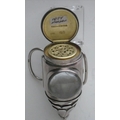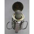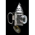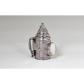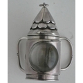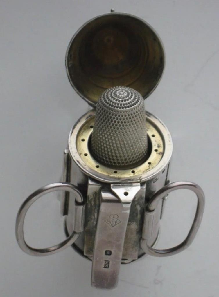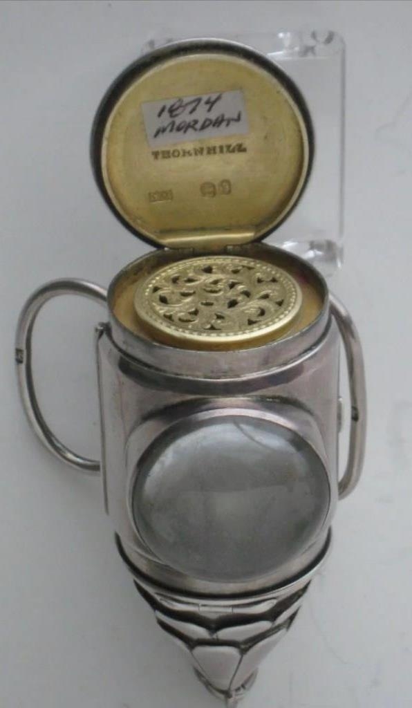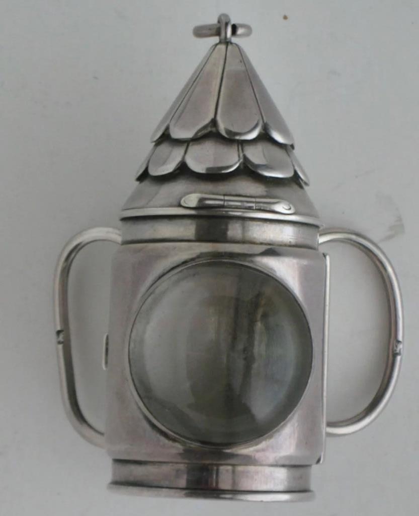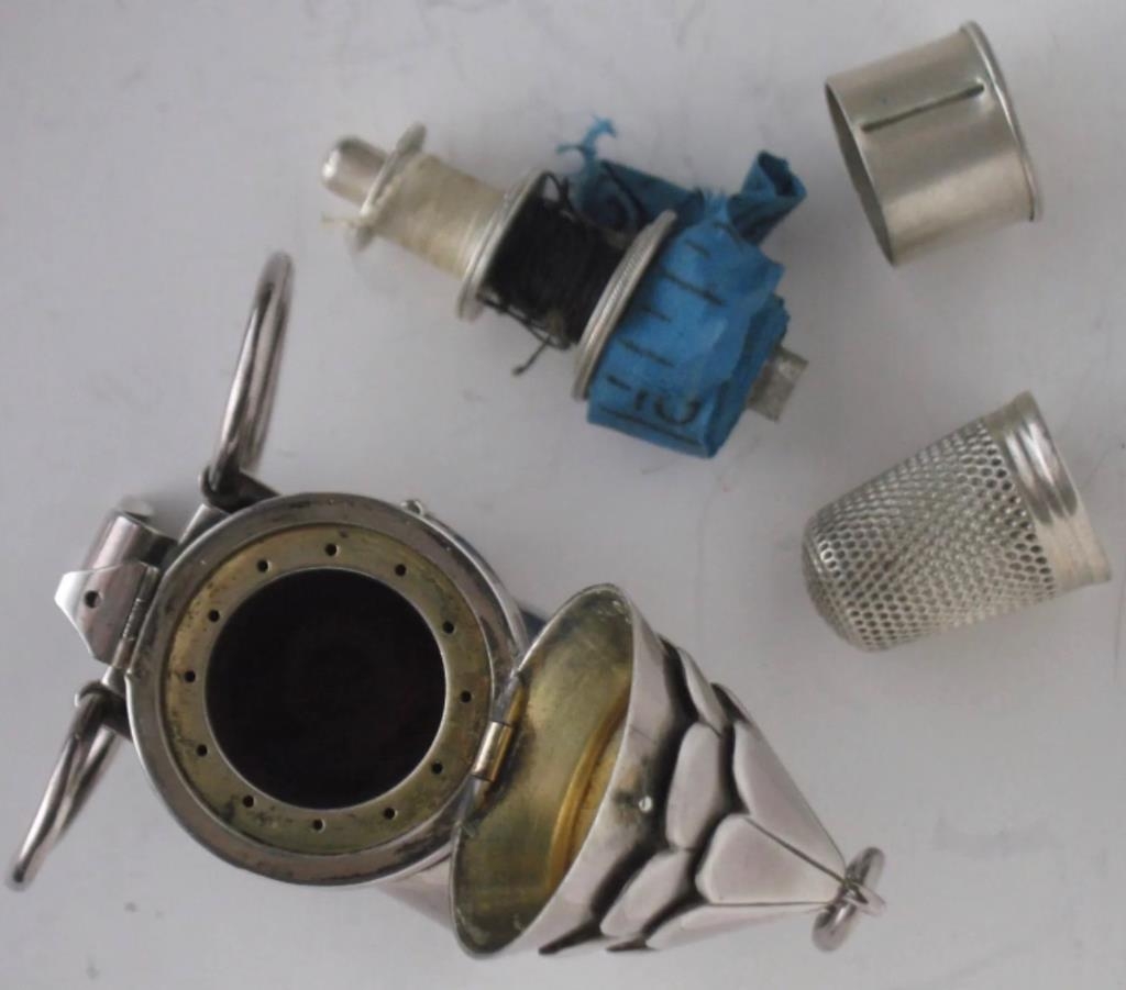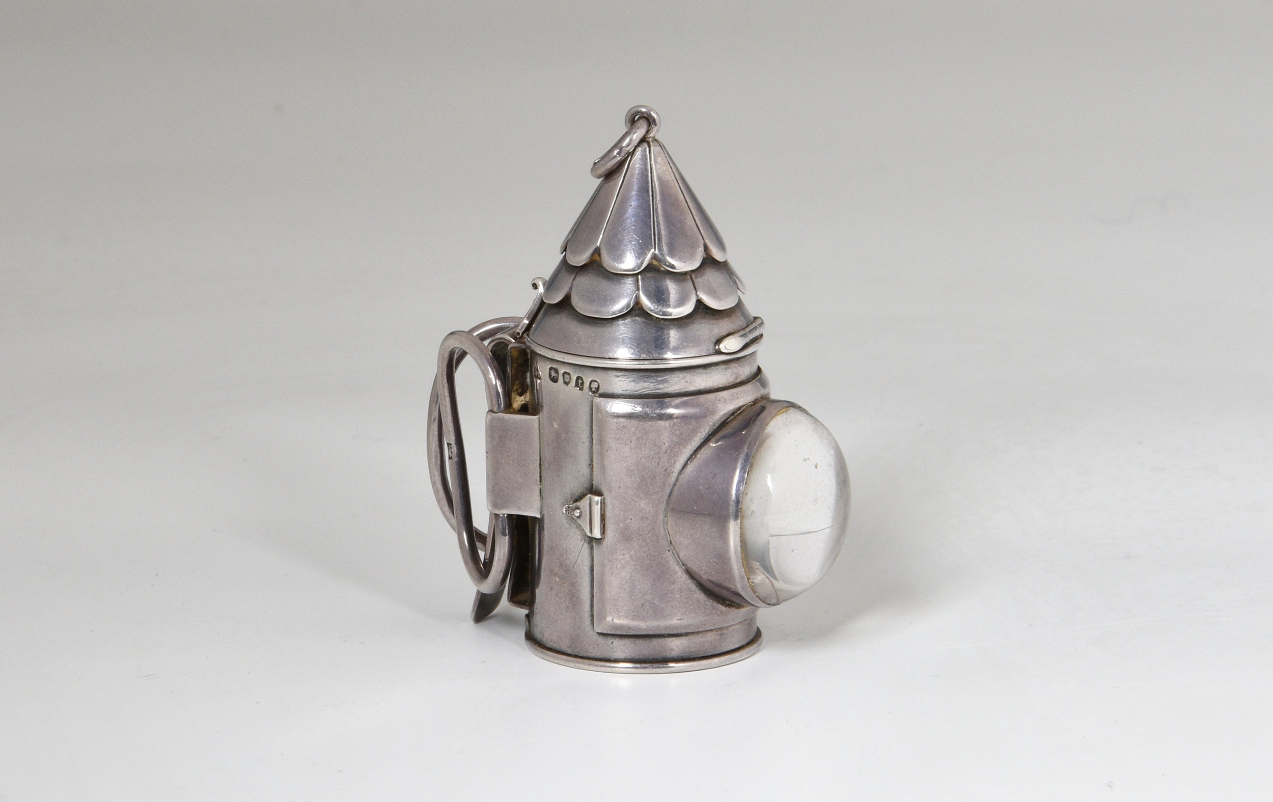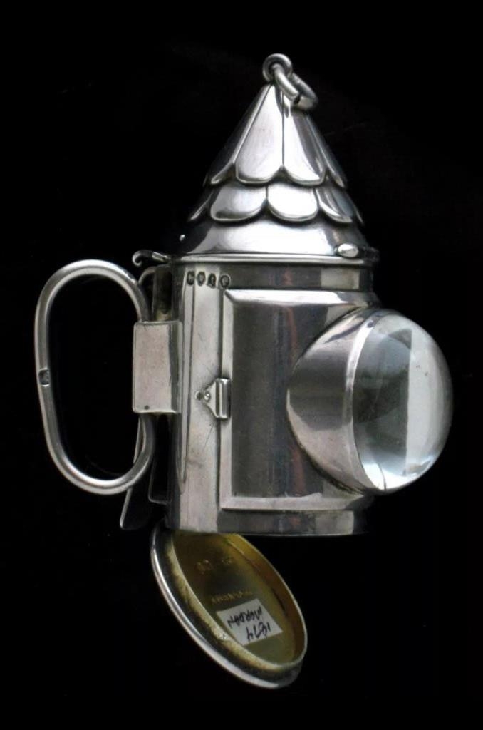 A very rare Victorian novelty silver sewing etui combined with a vinaigrette to base Sampson Mordan & Co, London, 1874, modelled as a Policemans Bullseye lantern / lamp, the hinged cover opening to reveal a silver gilt interior for pin storage around inner rim, pull-out bobbin with cotton reels and tape measure, topped by thimble, the hinged base housing the silver gilt vinaigrette with beautiful foliate pierced grill, stamped with retailer THORNHILL, attached handles and clip, stamped with diamond lozenge mark, 2 5/8in. (6.7cm.) high, weight 3.8 tr.oz. *Crystal glass with small inner fracture, otherwise good.