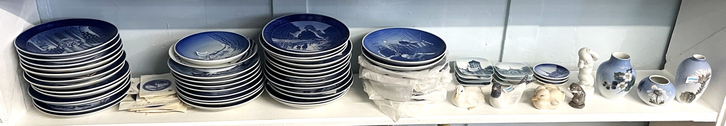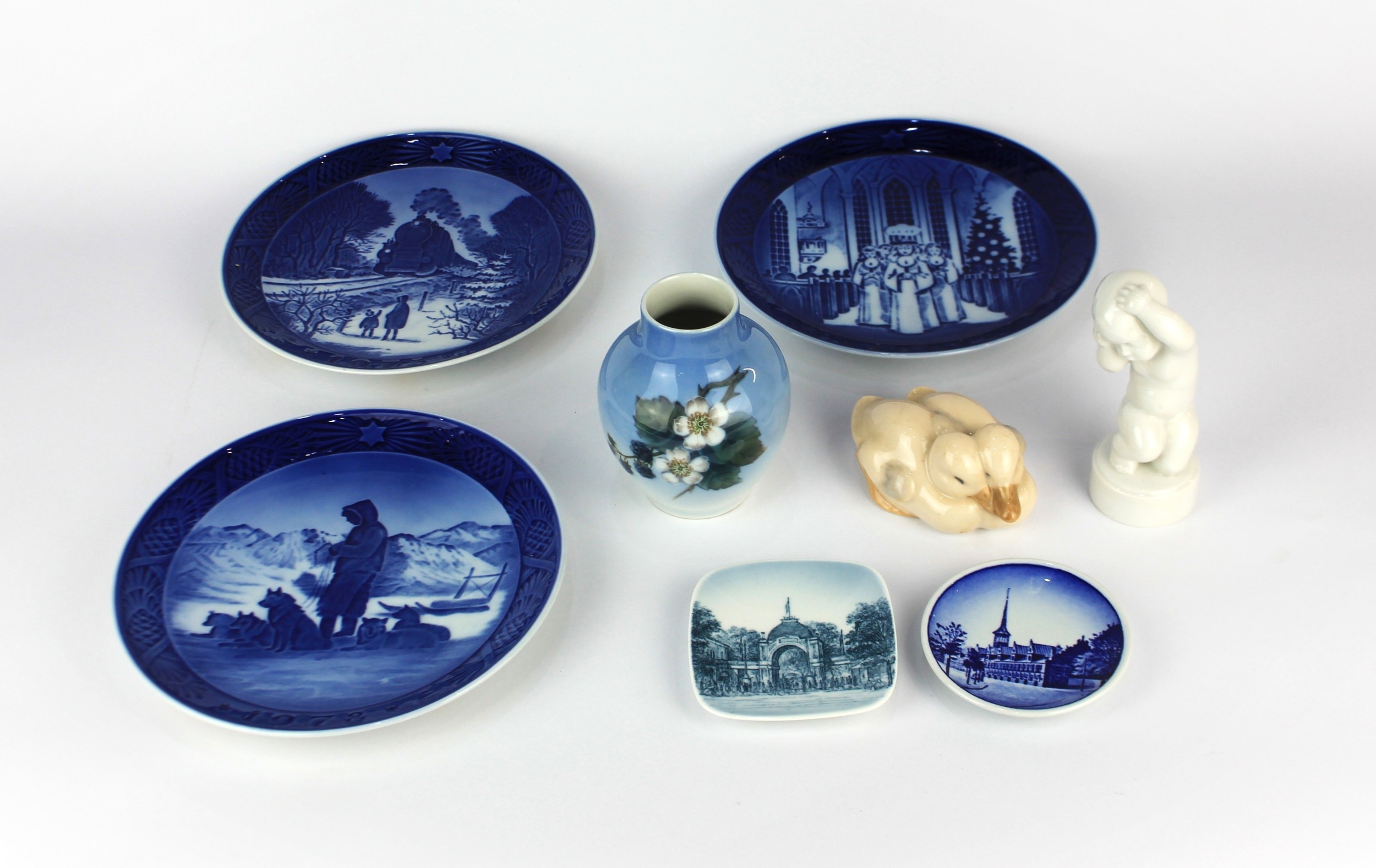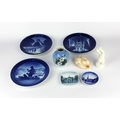 A collection of Danish porcelain, mostly Royal Copenhagen and Bing & Grondahl, to include three small Royal Copenhagen vases, a model of a gull and an otter, various 1960s-1990s Christmas plates etc