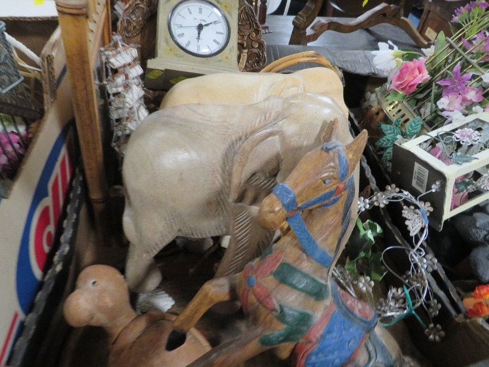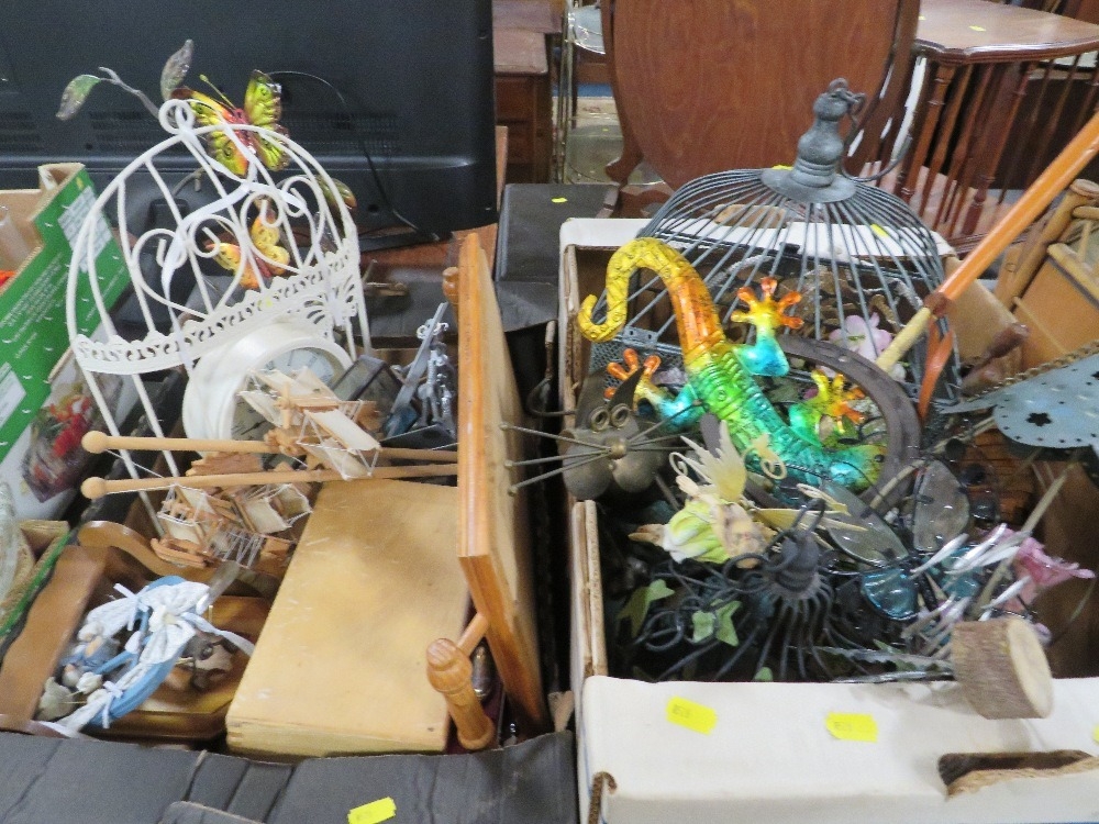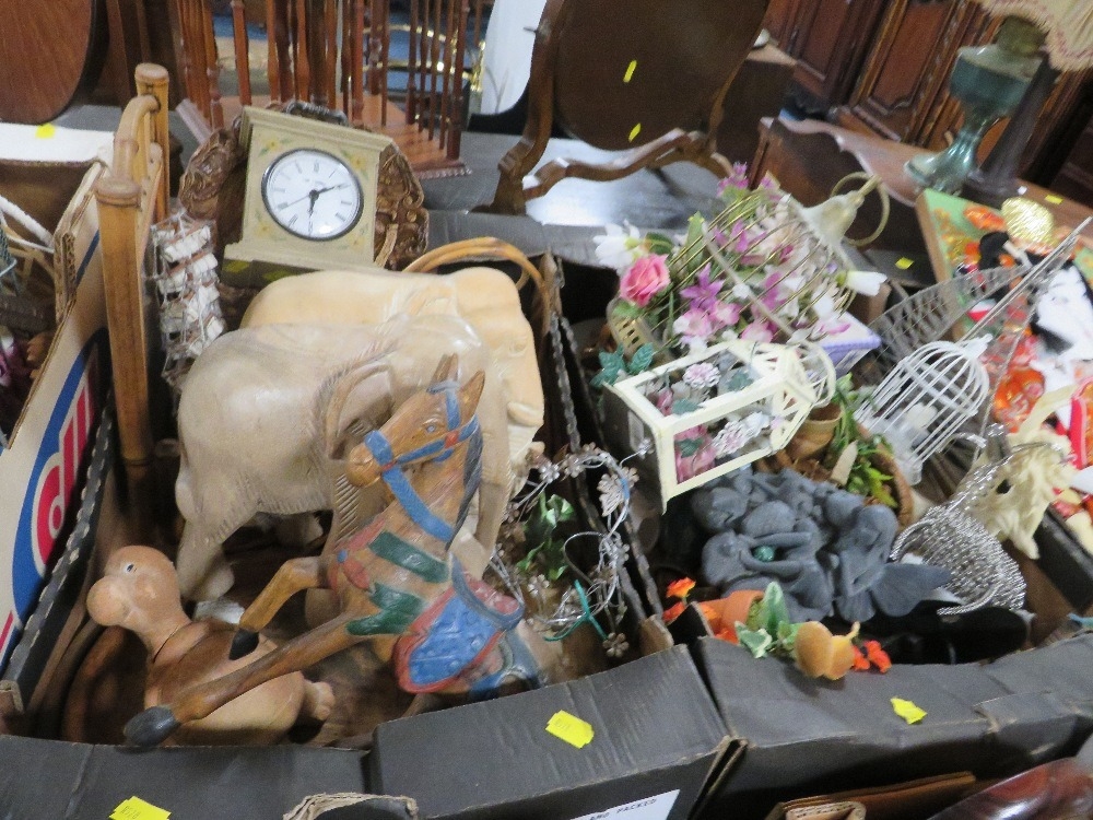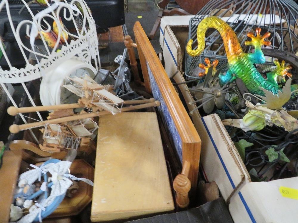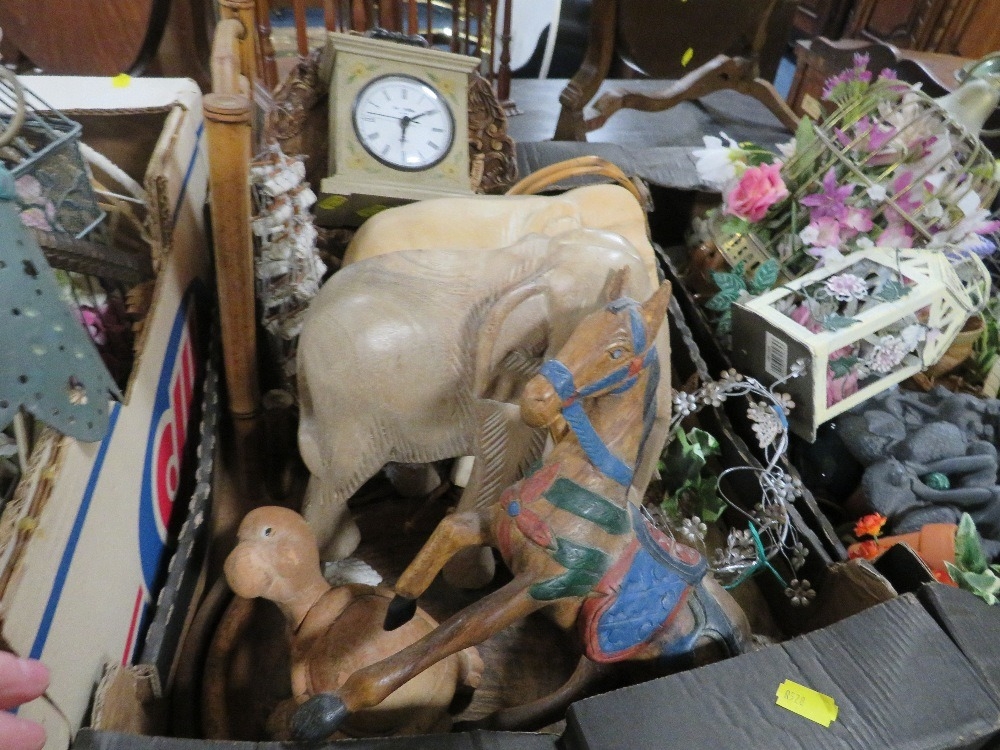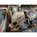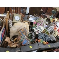 Four trays of assorted households decorative items to include clocks etc
