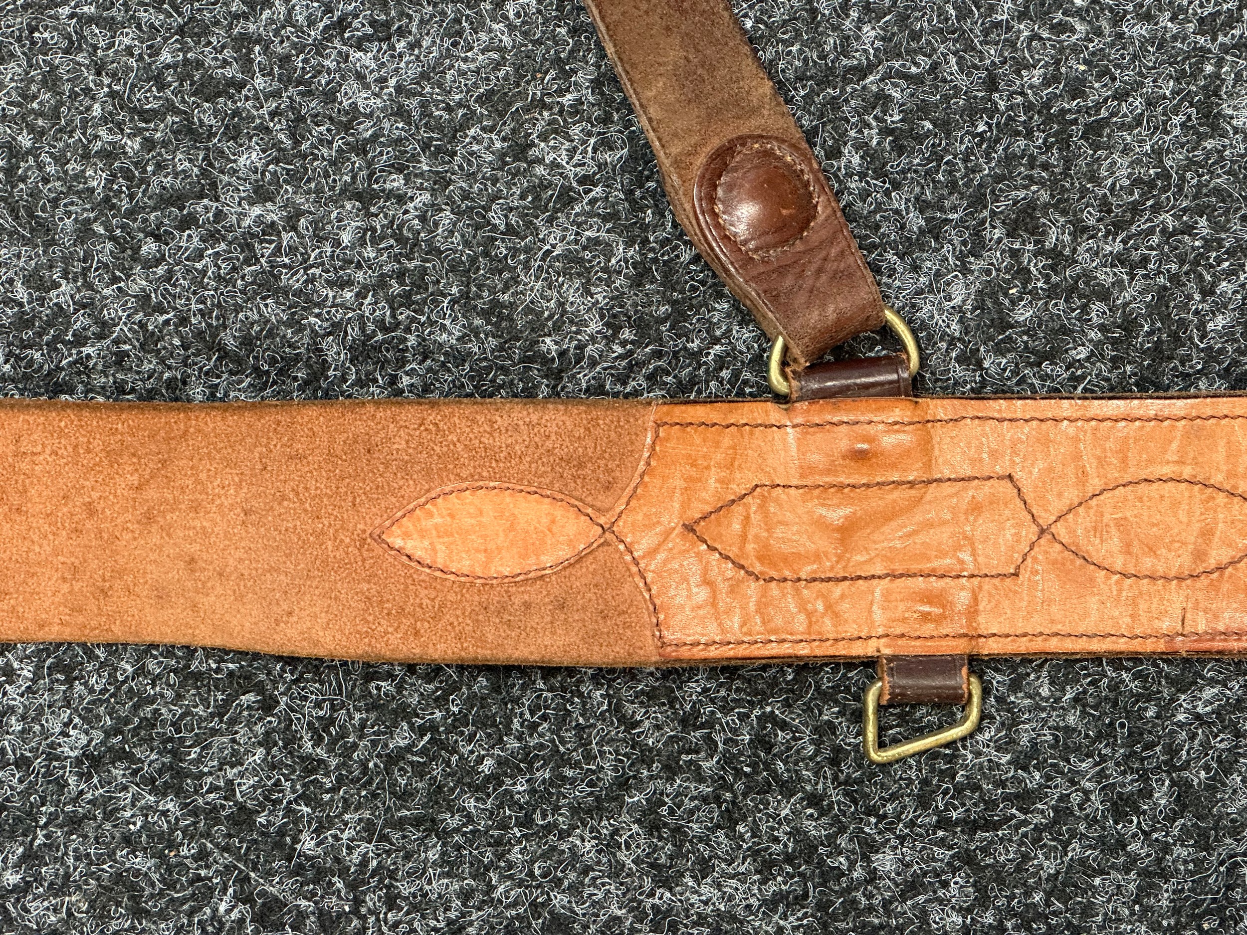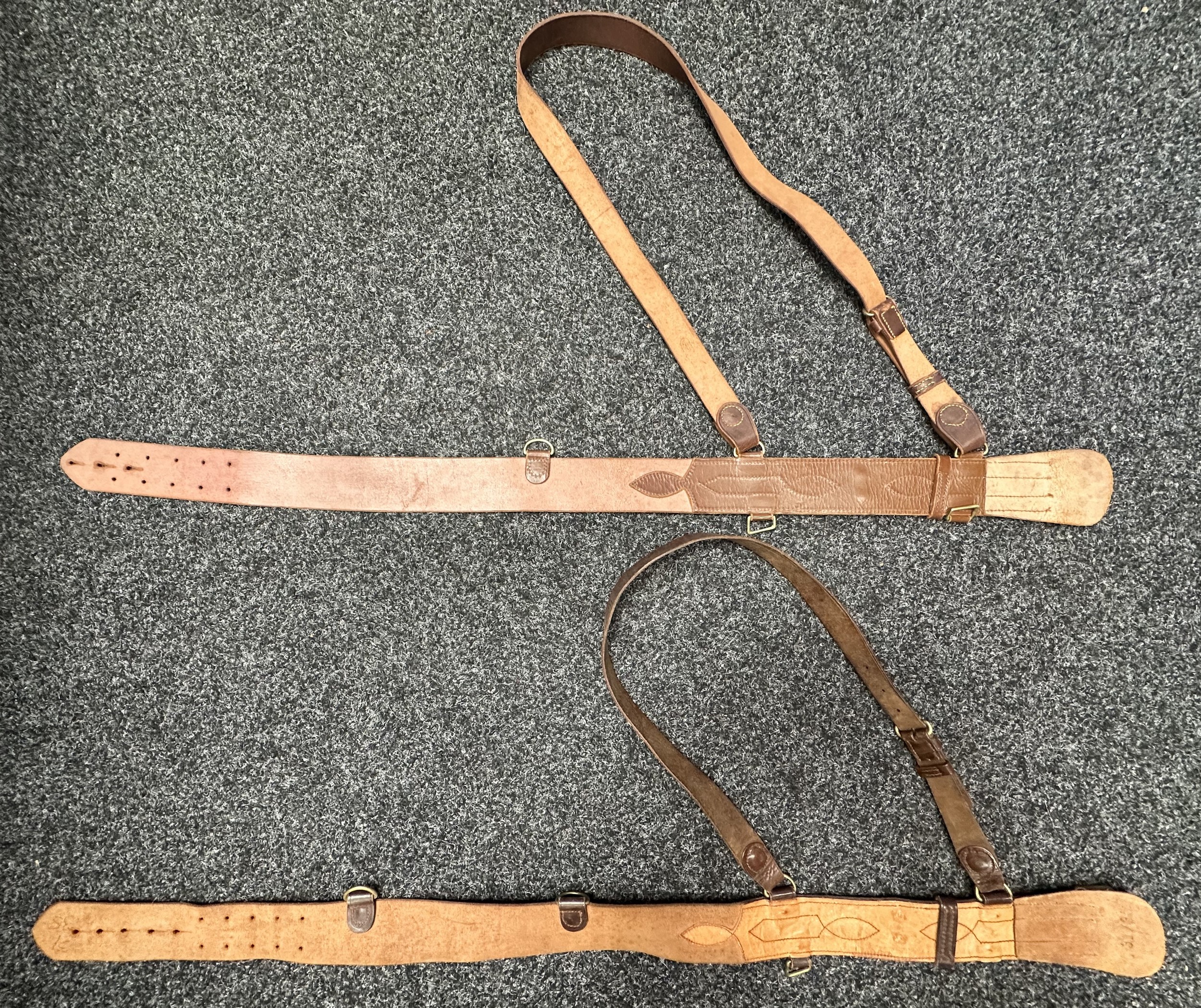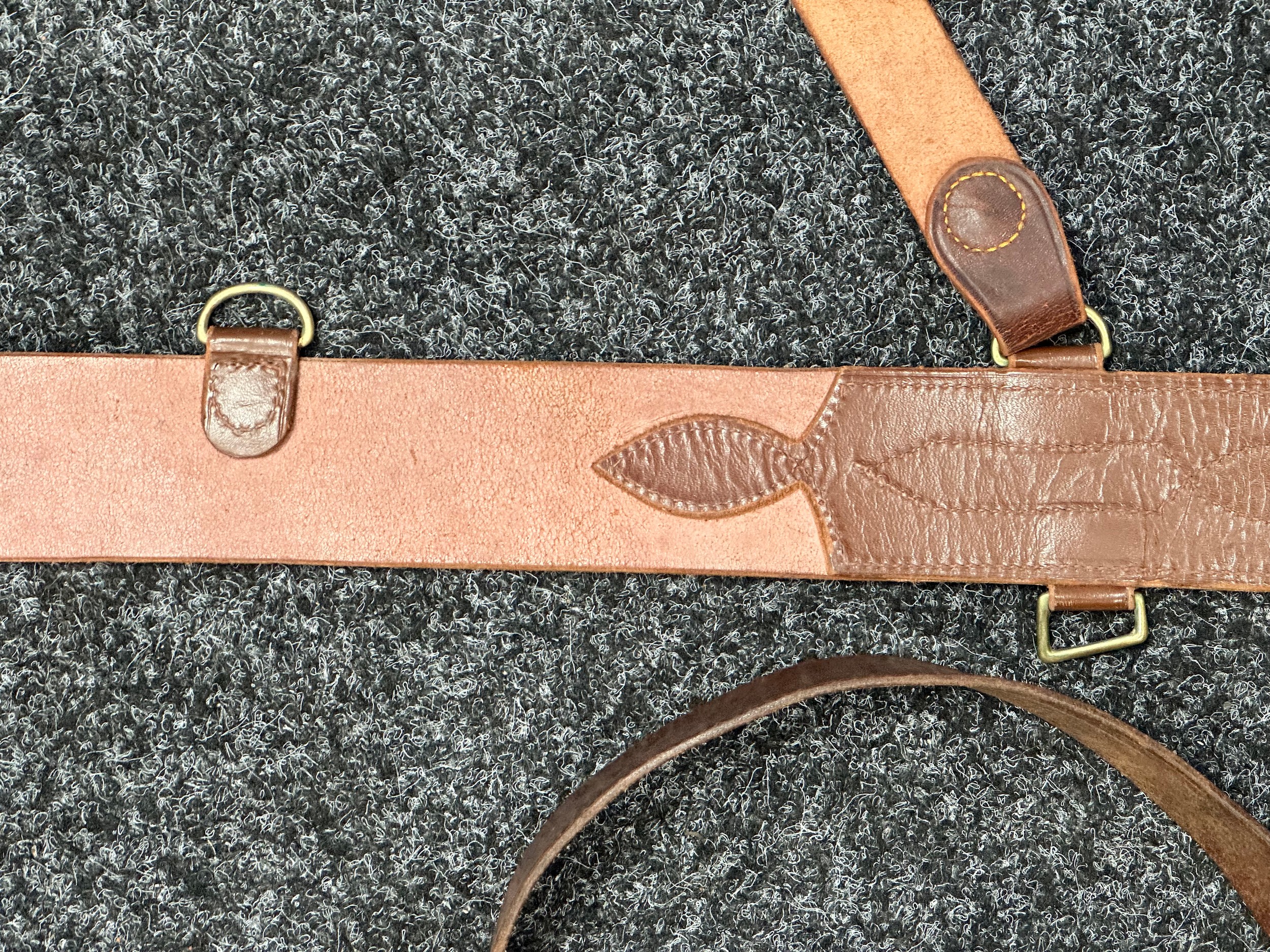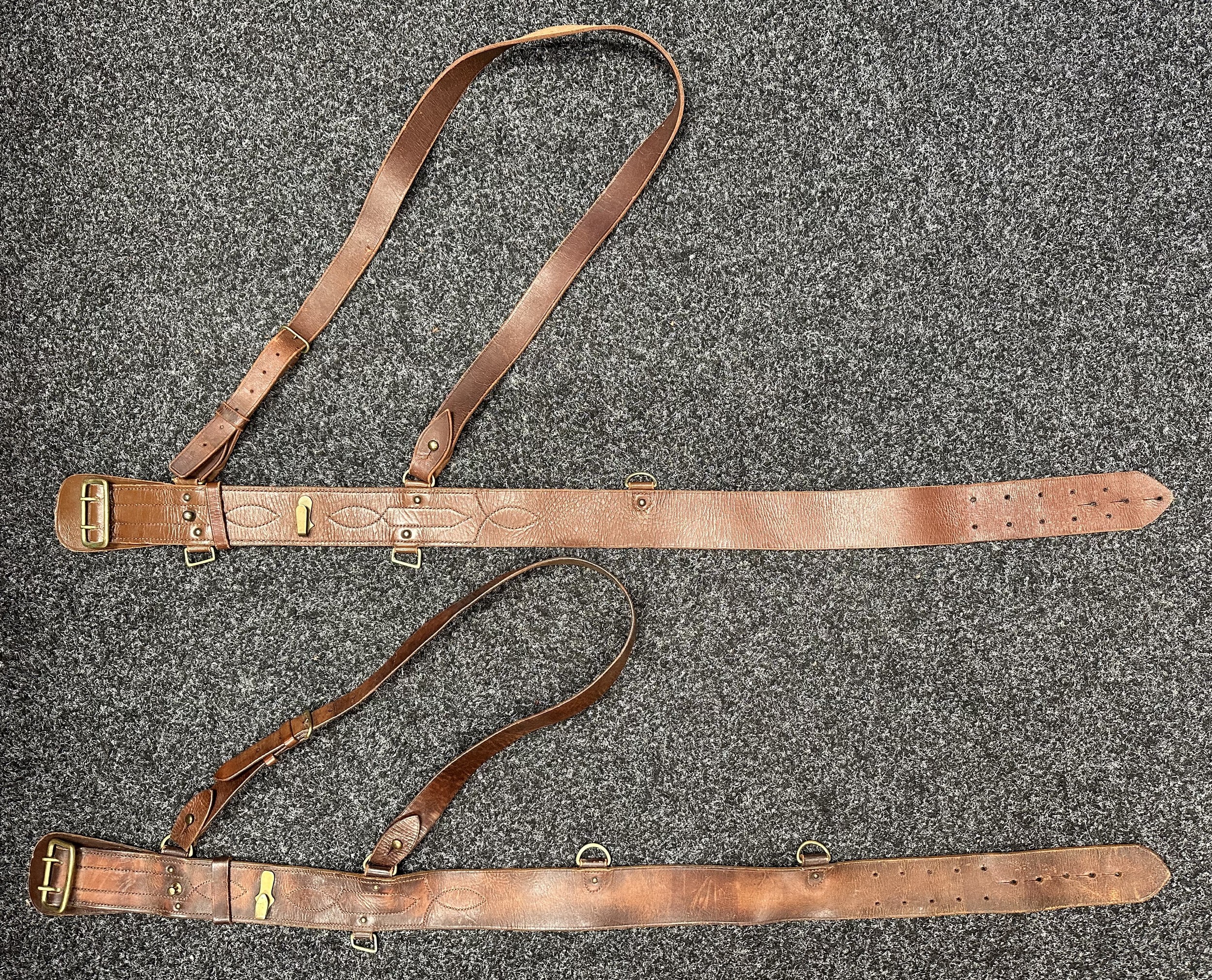 Two Officers Brown Leather Sam Brown Belts. One marked "31-37" waist, missing a d ring. (2)