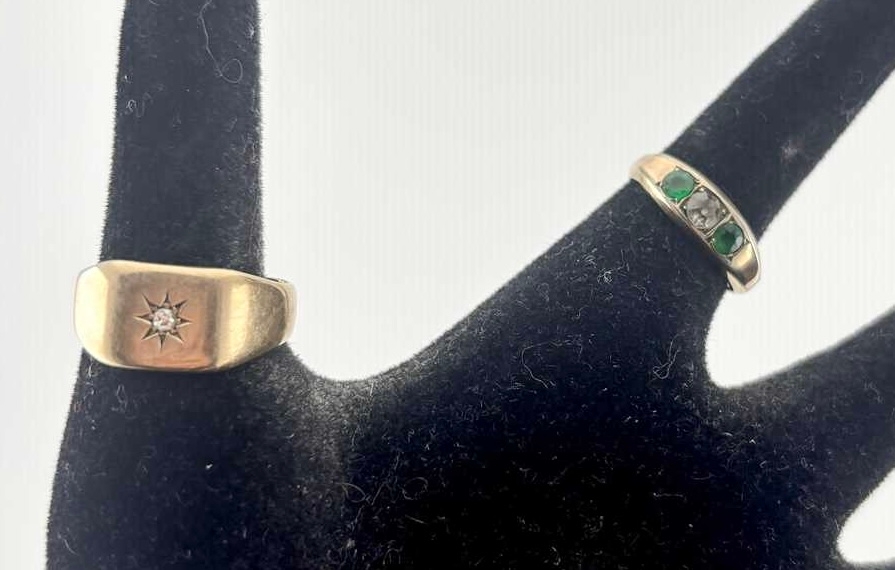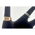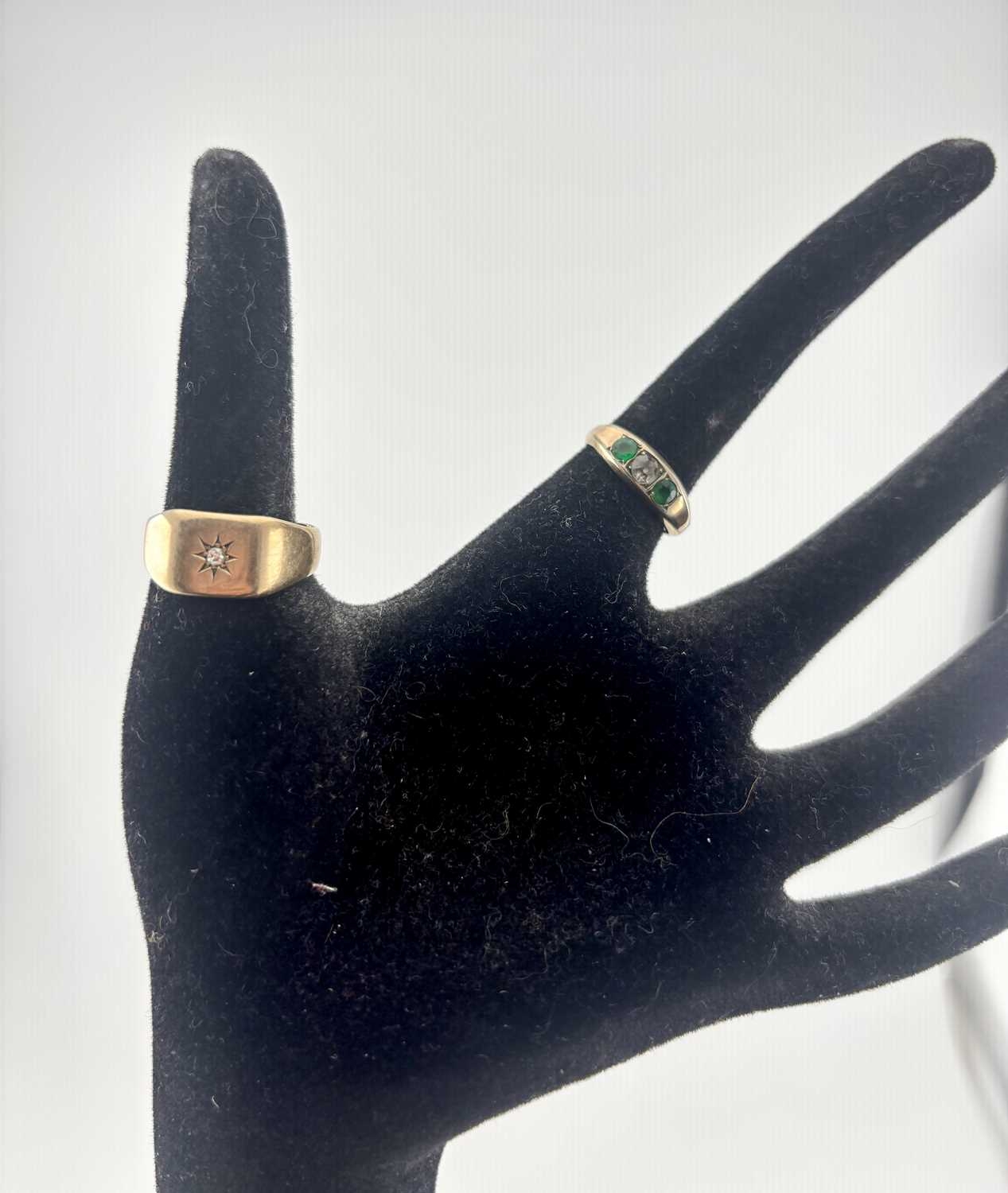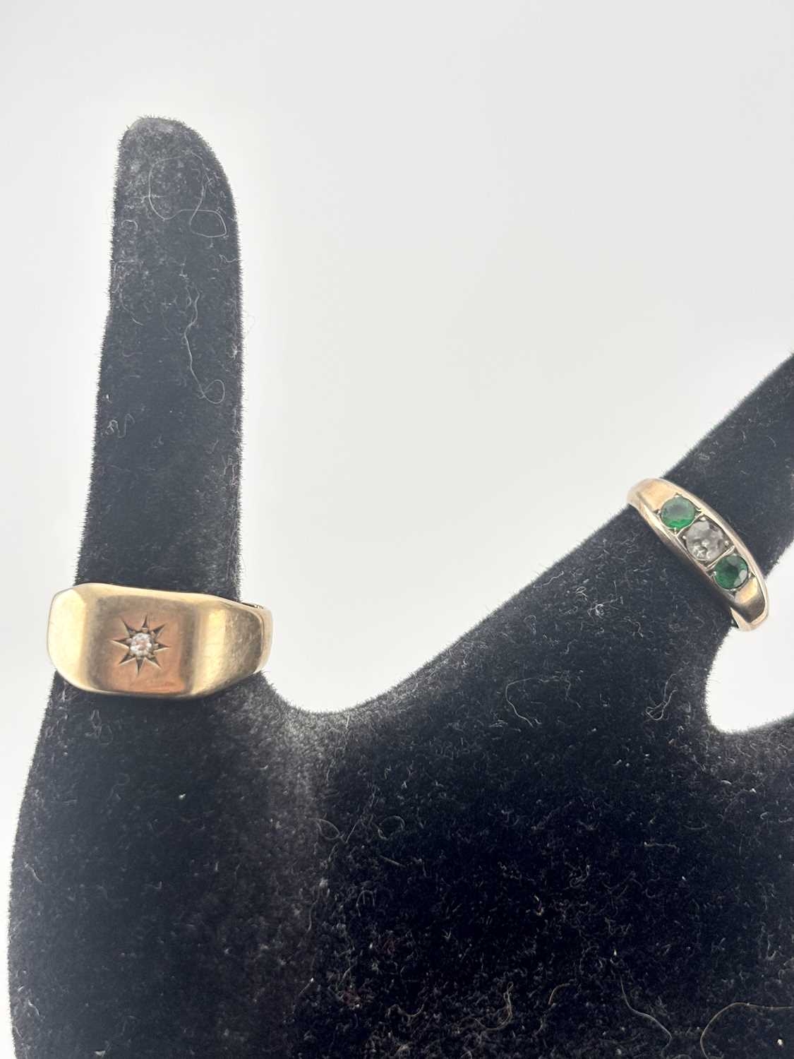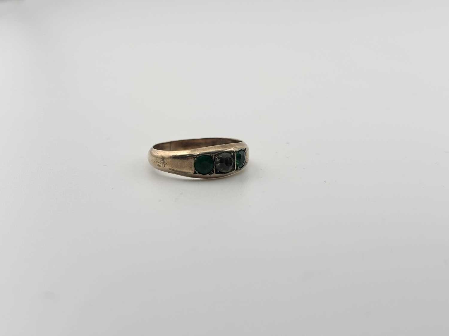 Two 9ct gold rings, one set with a single white stone, the other a white stone between two green, gross weight 6.7grams (2)