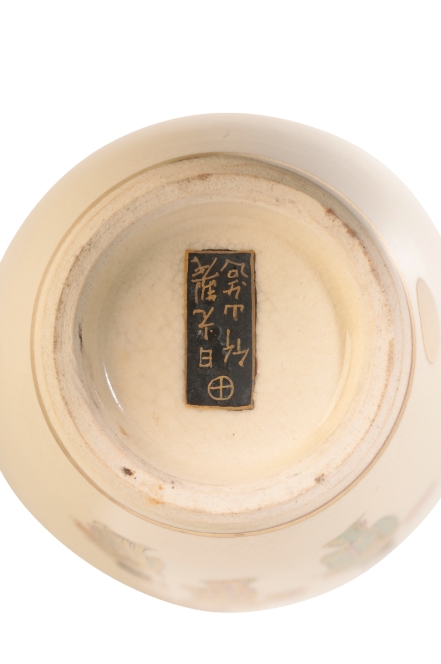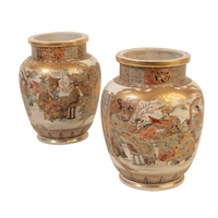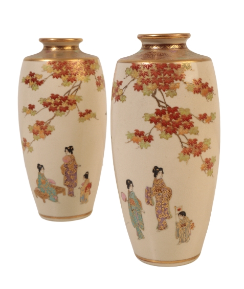 A PAIR OF JAPANESE SATSUMA VASES Meiji, enamelled in polychrome and gilt with Geisha girls walking beneath maple branches turning to autumnal shades, the base signed in black and gilt in a rectangular panel, 18cms height