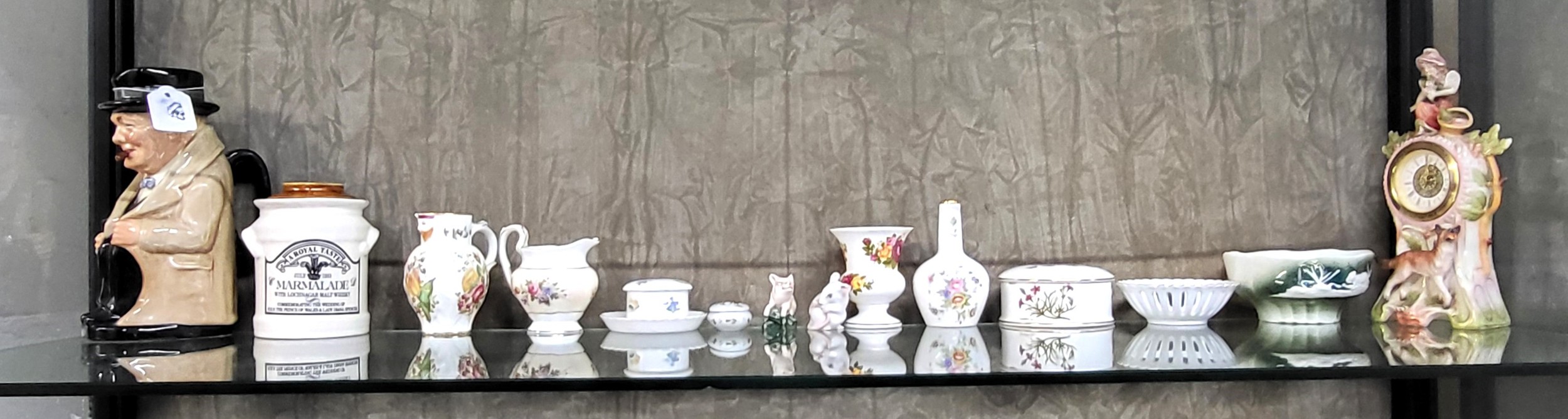 A Royal Doulton Winston Churchill jug 22.5cm, a porcelain mantel clock 23cm, other small porcelain wares, a mouse (small chip to one ear), and a Royal Doulton pig (14)