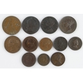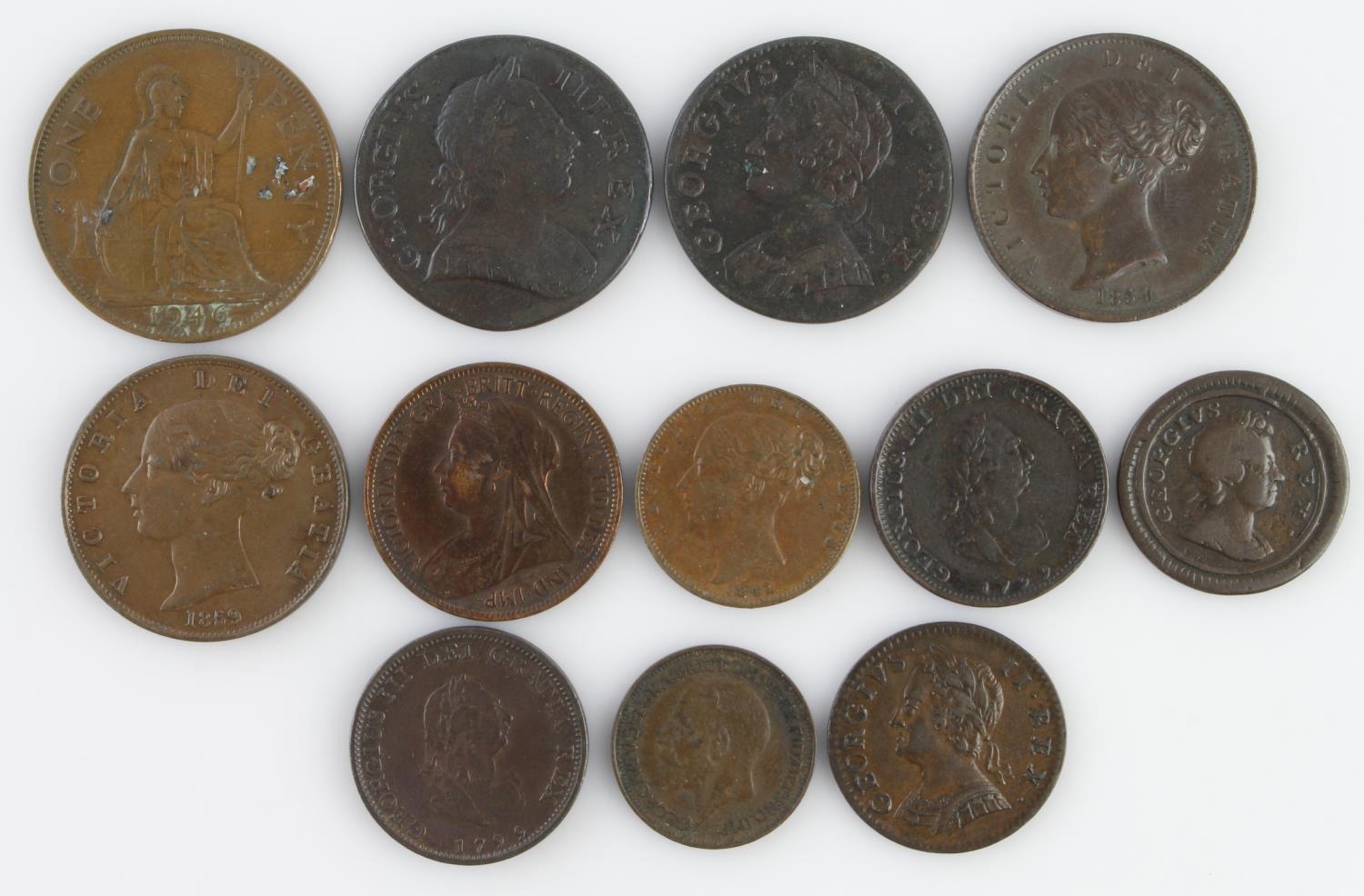 GB Copper & Bronze (12) 18th-20thC assortment; noted: Halfpennies: 1854 GVF+, 1859 GVF; Farthings: 1724 Fine, 1754 VF+, 1799 x2 F-GF, 1841 VF, etc.
