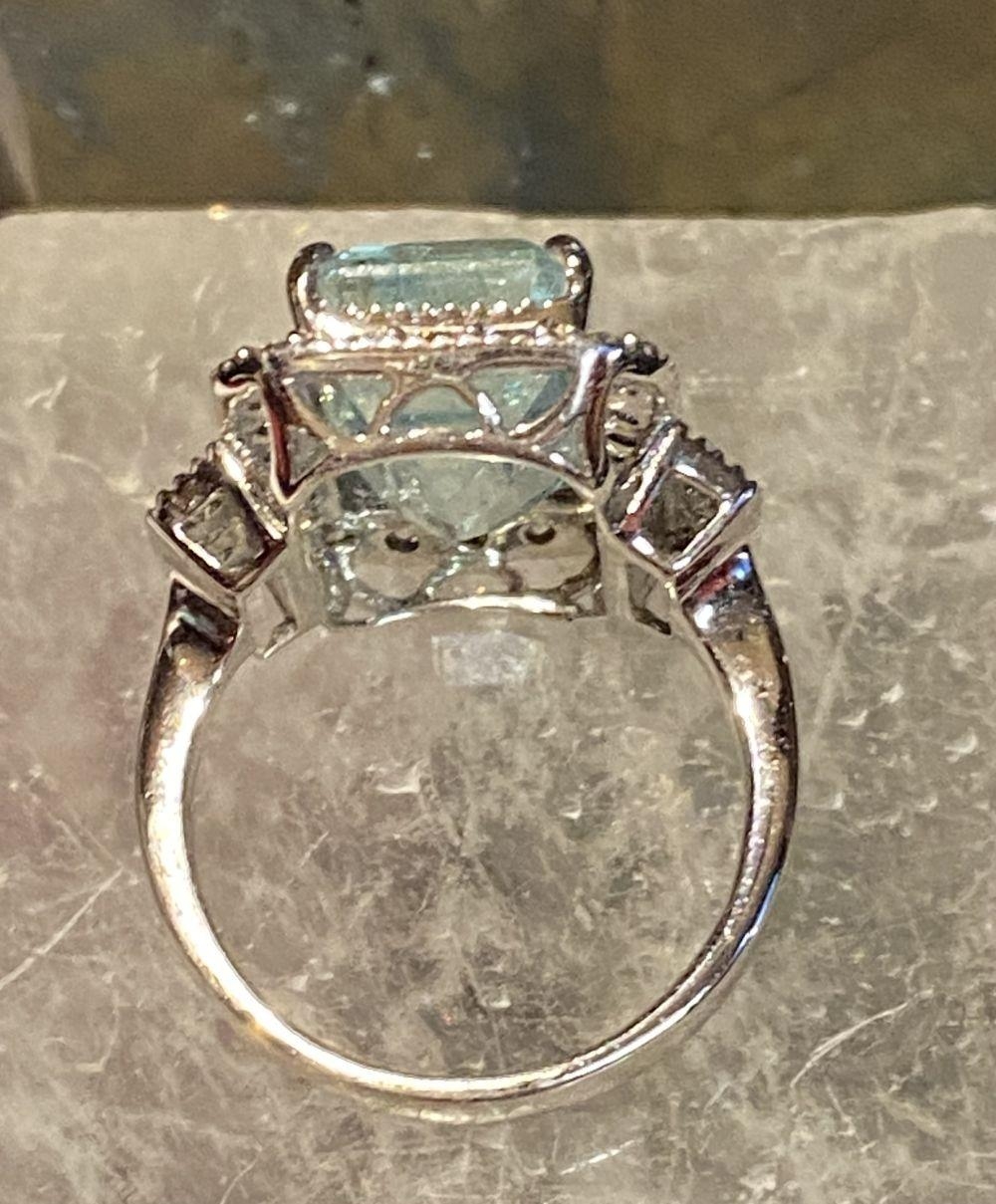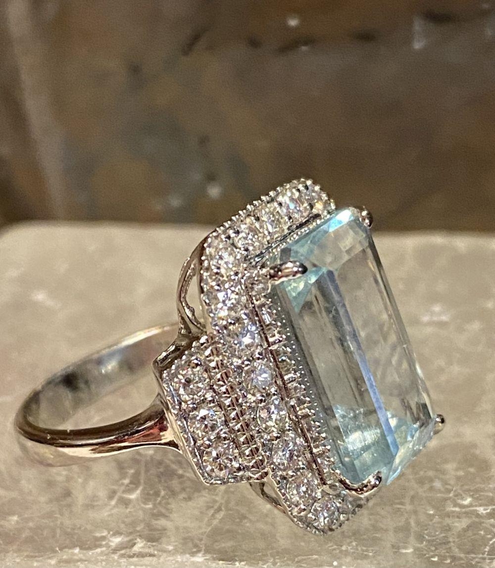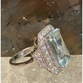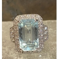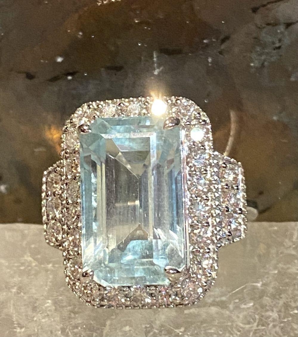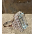 A BEAUTIFUL 18CT WHITE GOLD AQUAMARINE & DIAMOND CLUSTER RING, the central claw set aquamarine weighs 7.59cts, surrounded by a cluster of brilliant cut diamonds that continue on to the shoulder the ring really does have a wow factor to it. The total diamond weight comes in at 1.20cts, with a colour of G & clarity of VS1. Ring size M.