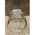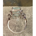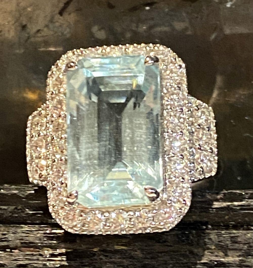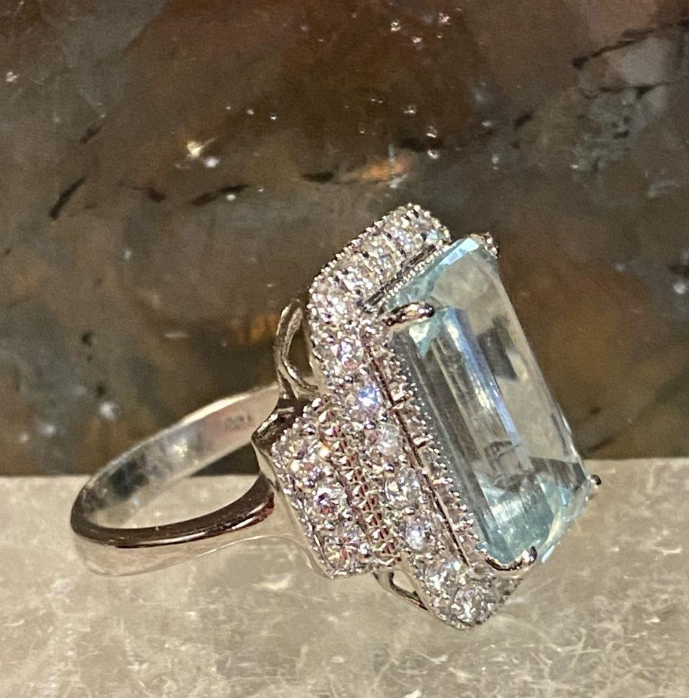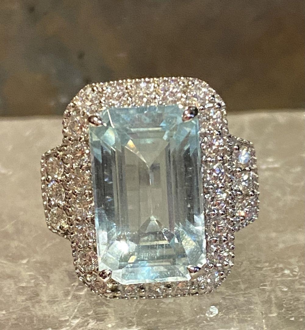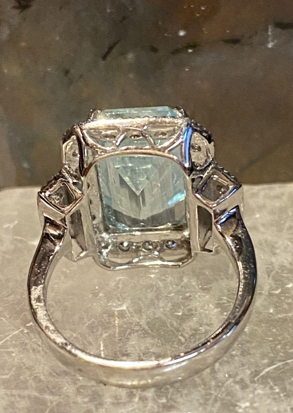 A BEAUTIFUL 18CT WHITE GOLD AQUAMARINE & DIAMOND CLUSTER RING, the central claw set aquamarine weighs 7.59cts, surrounded by a cluster of brilliant cut diamonds that continue on to the shoulder the ring really does have a wow factor to it. The total diamond weight comes in at 1.20cts, with a colour of G & clarity of VS1. Ring size M.
