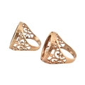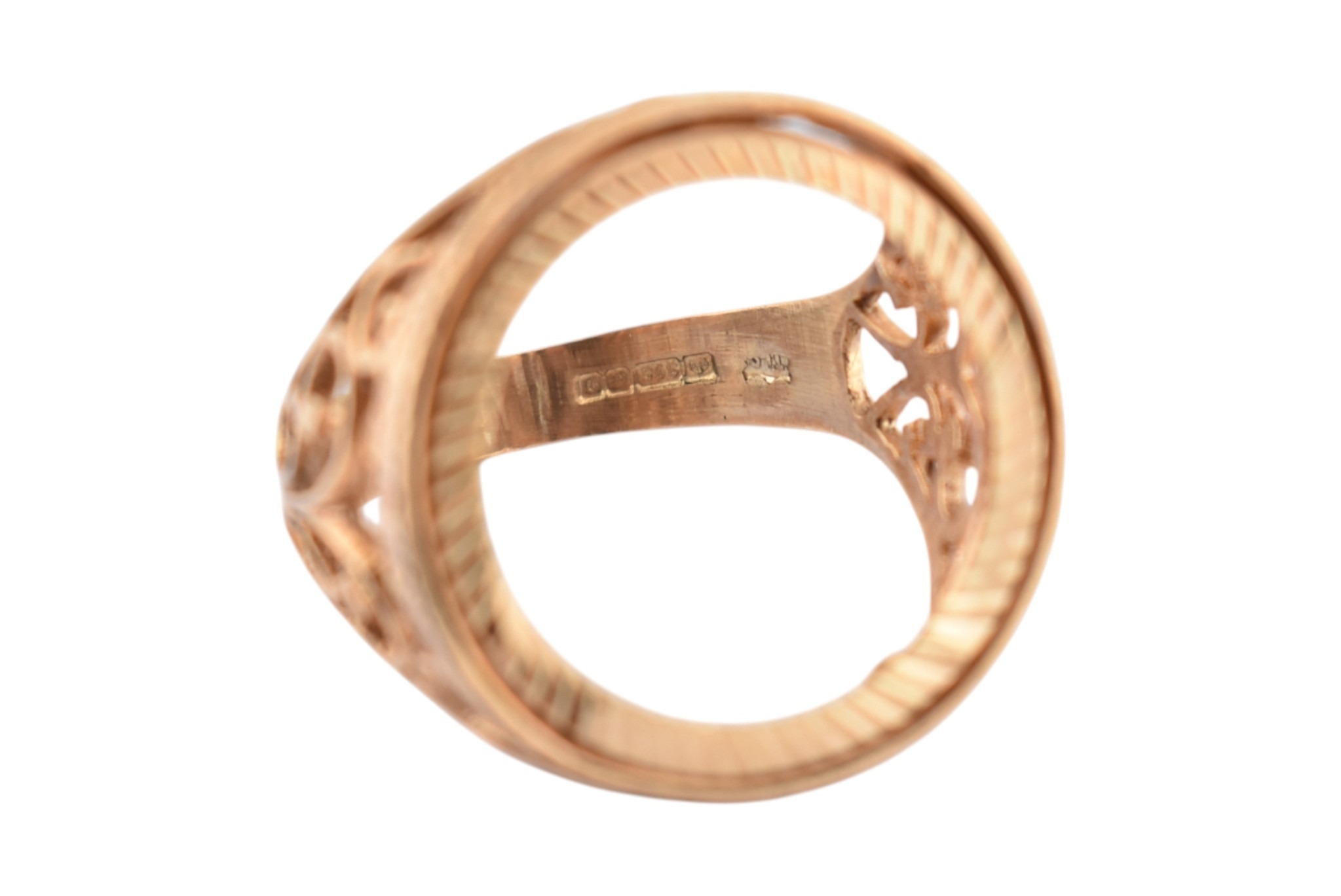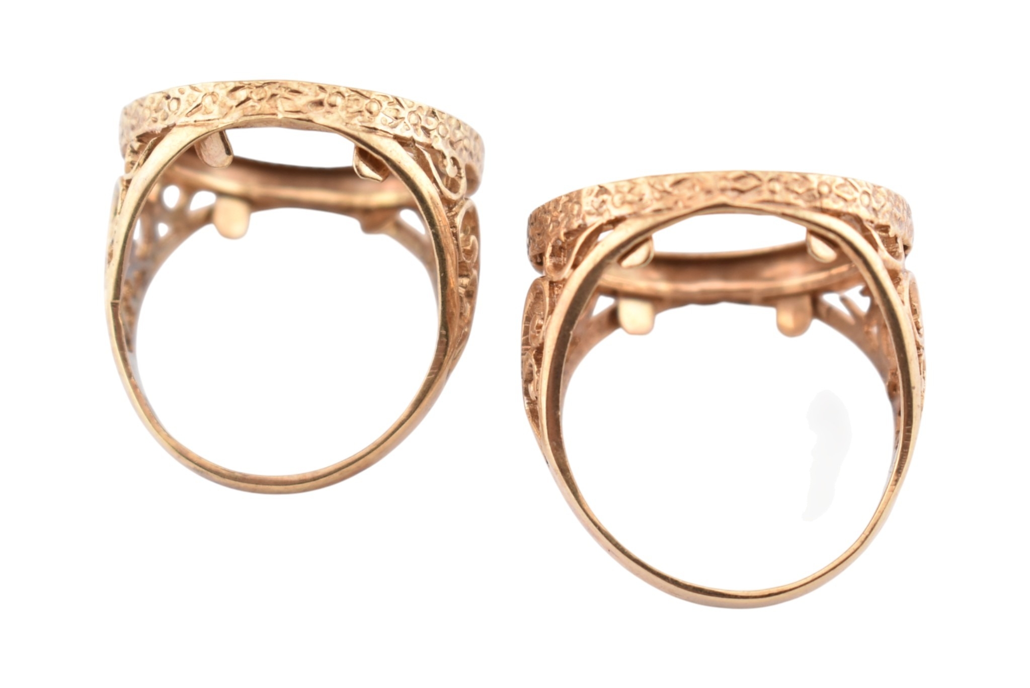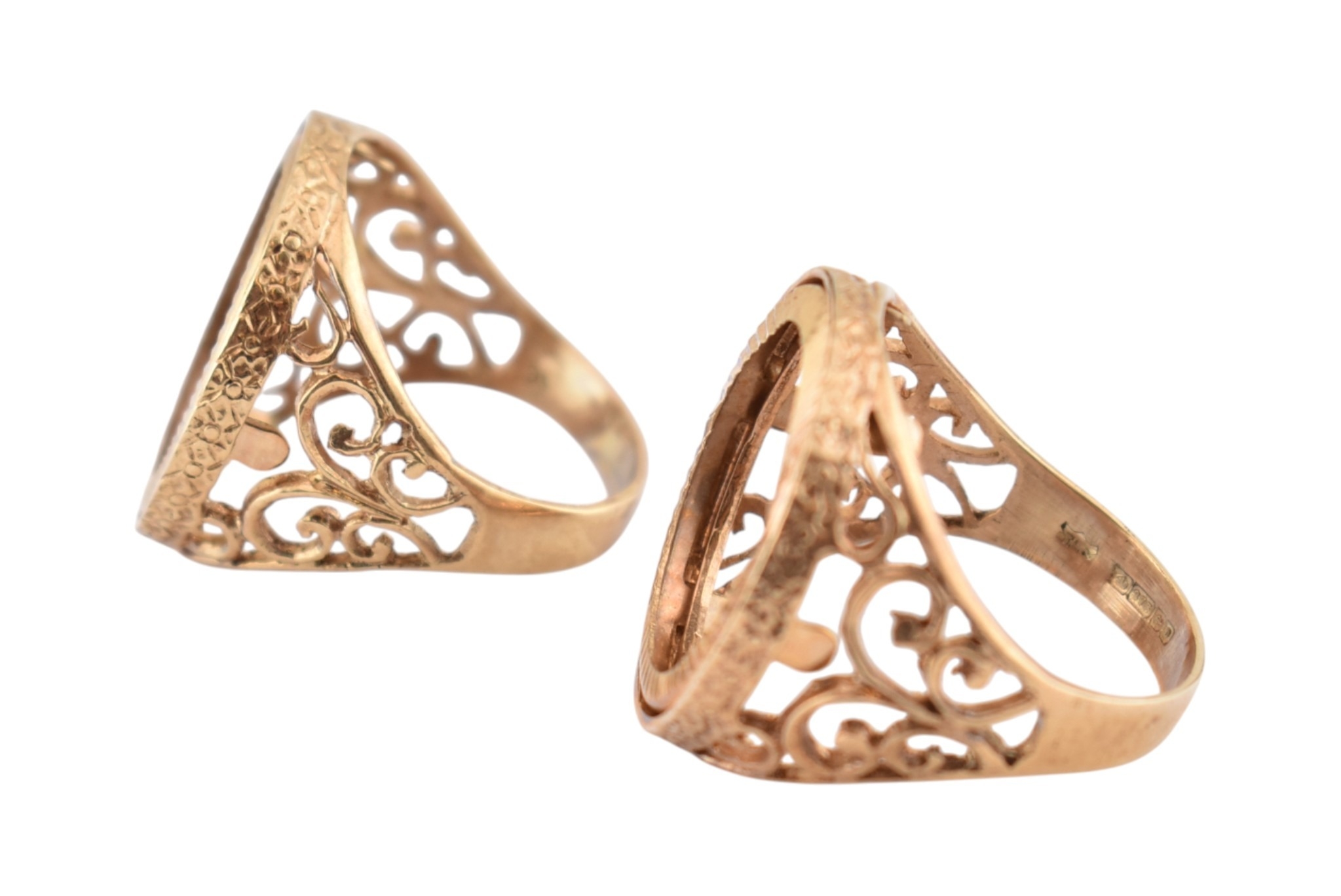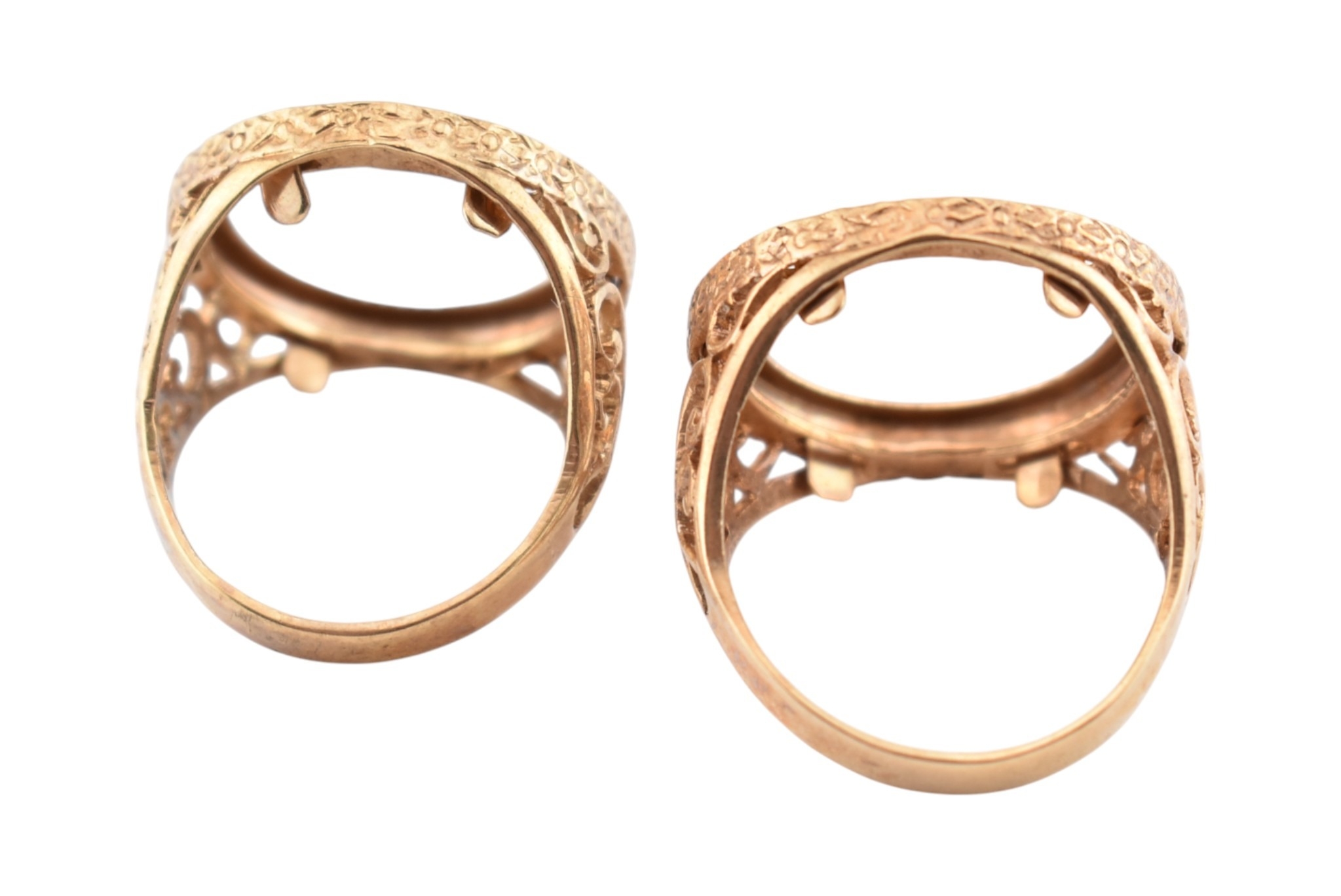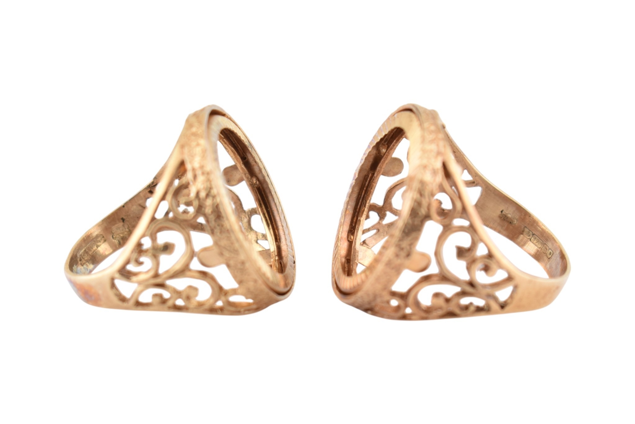 Two hallmarked 9ct gold sovereign rings - mounts. The rings with mounts ( lacking coins ) over pierced shoulders to plain band. Hallmarked Birmingham. Total weight 10.5g. Sizes P & R.5
