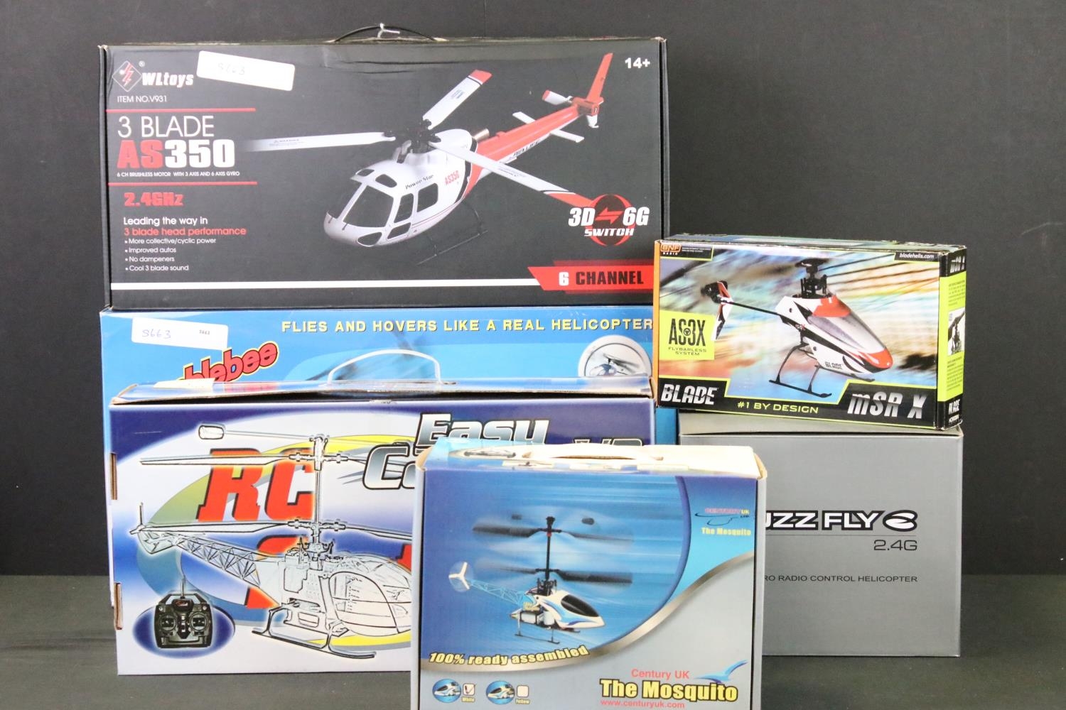 Radio Control - Six boxed R/C radio control helicopters to include RC System Easy Copter V2, Century UK - The Mosquito, Horizon Hobby - BNF Basic Blade mSR X, Buzz Fly 2.4G, WL Toys 3 Blade AS350, and Humblebee. Models appear gd to vg, boxes gd