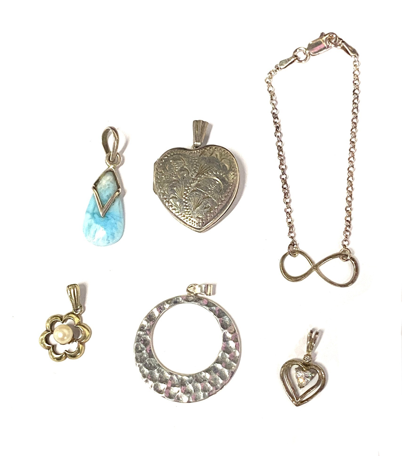 A number of silver pendants to include a heart shaped locket, larimar pendant etc, together with a silver bracelet, gross weight 12.6g