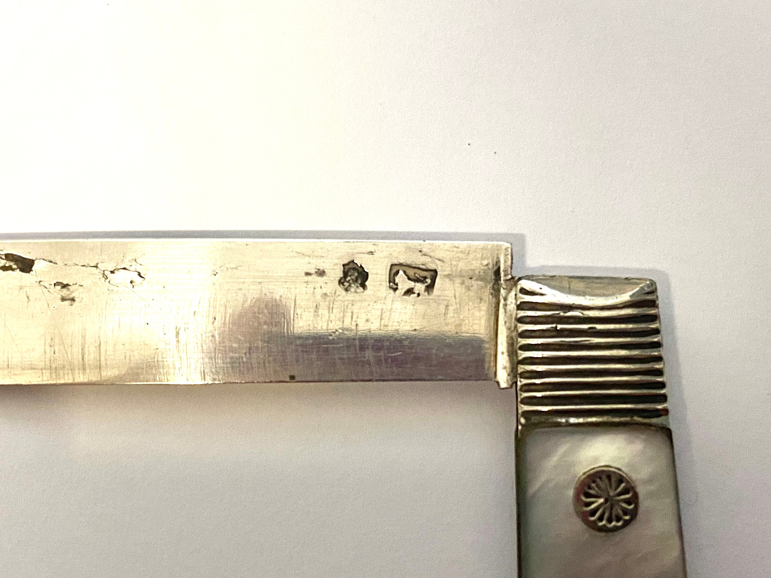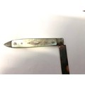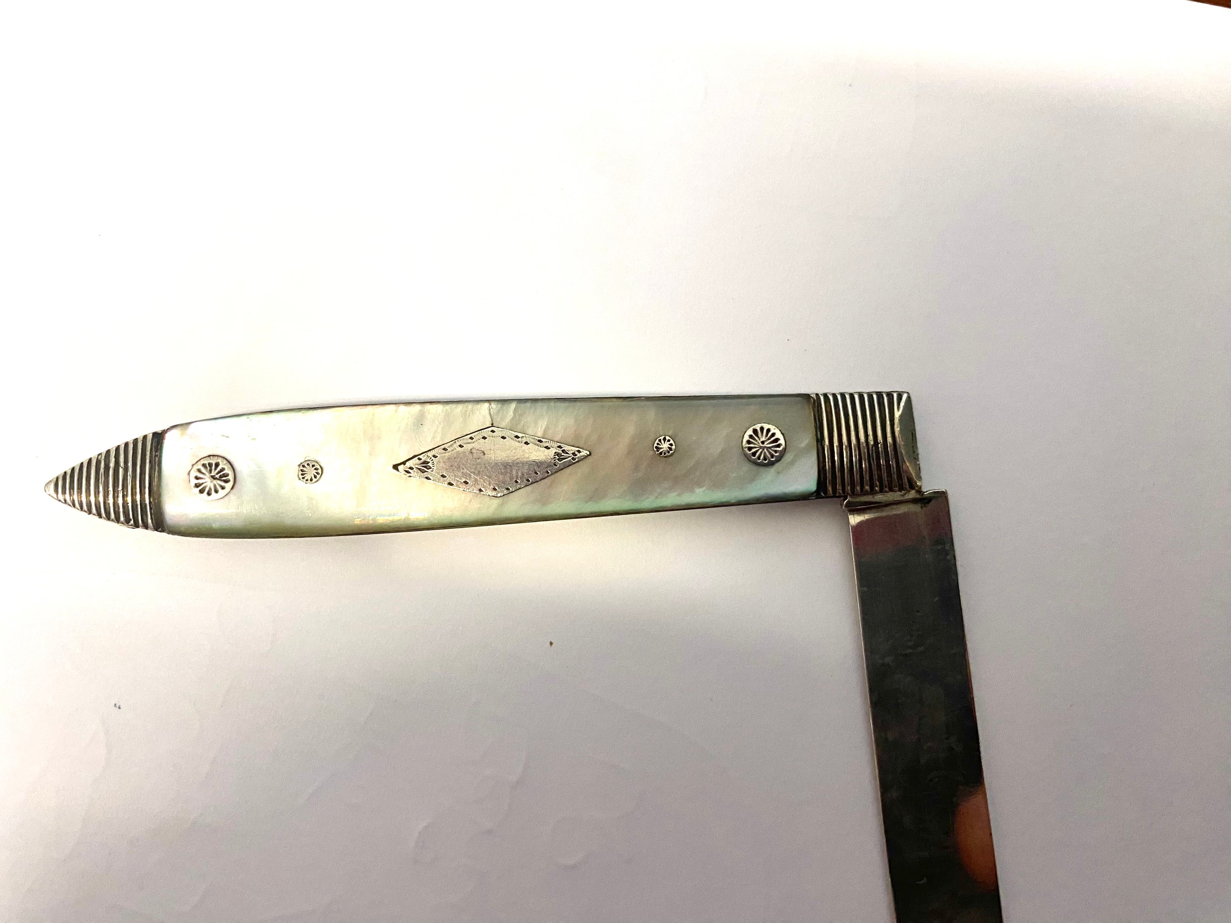 Sterling silver folding fruit knife with a folding blade and mother-of-pearl. Early example with hallmarks with stamp to the blade circa 1828.
