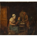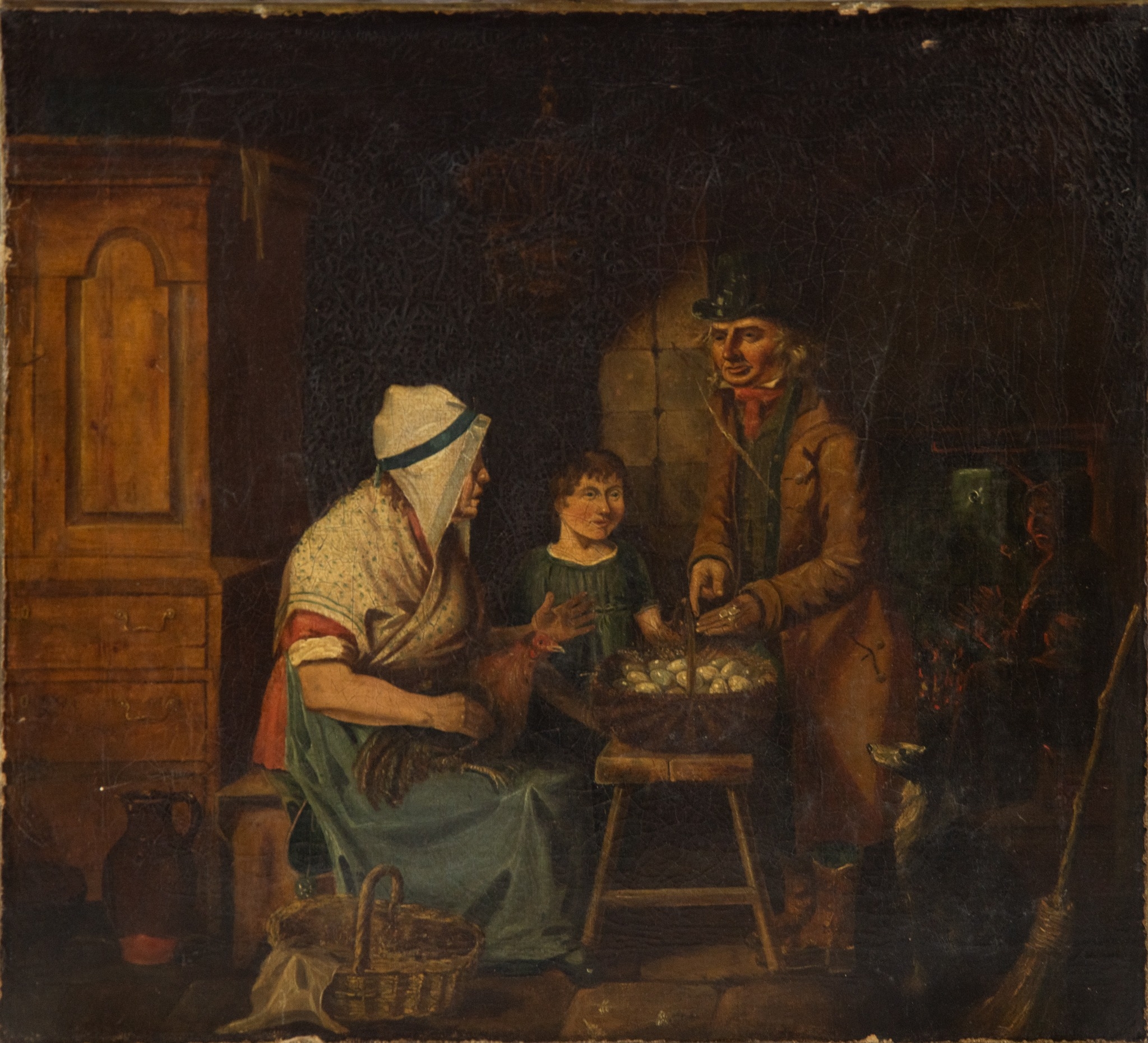 An interior with an elderly seated female figure holding a hen on her lap, selling eggs from a wicker basket, a gentleman offering her coins upon his open hand, a child standing between them, with a figure smoking a clay pipe warming his hands before a fire beyond