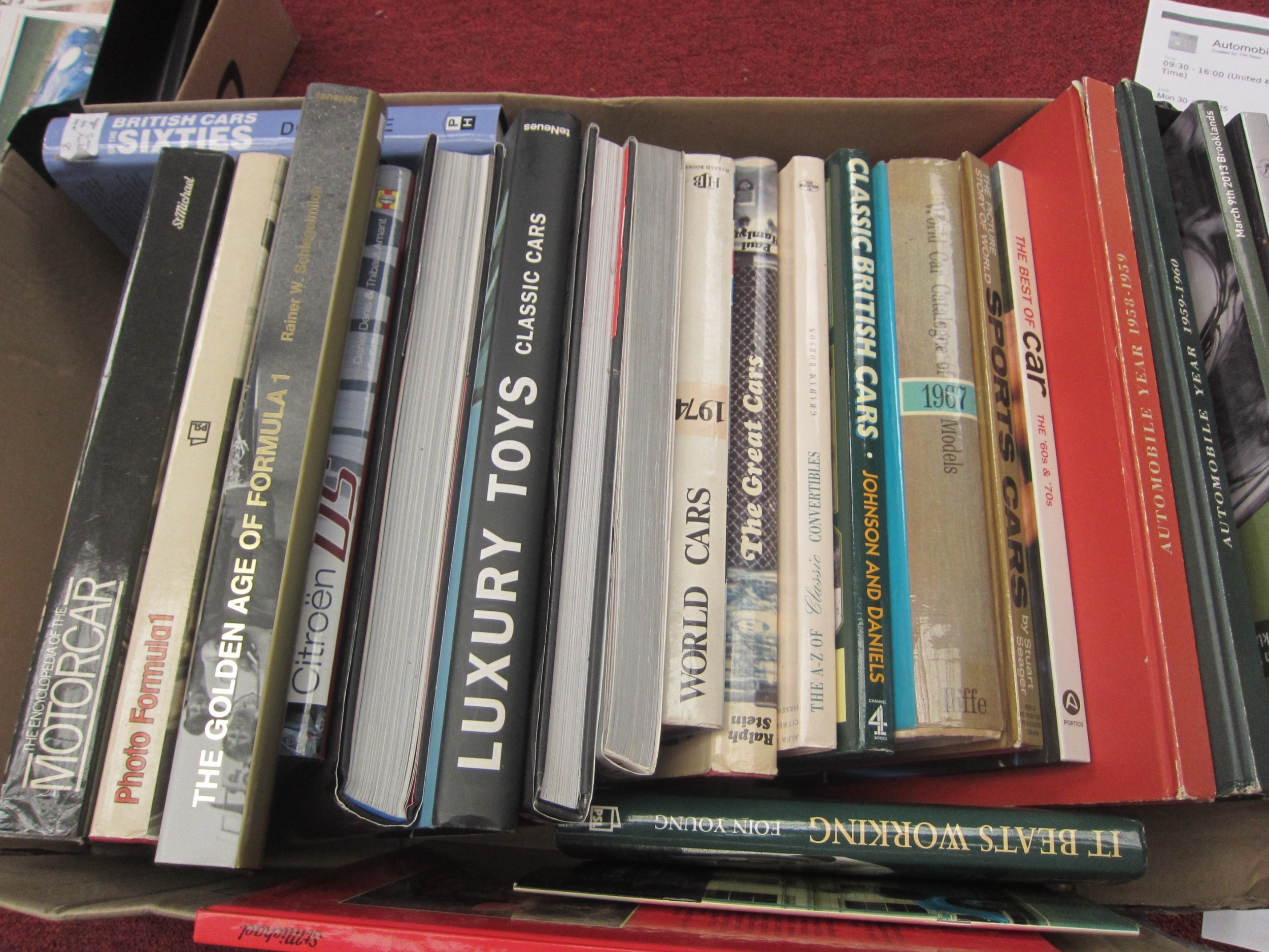 A box of books including Photo Formula One, Luxury Toys Classic Cars, Classic British cars and British Cars of the Sixties etc