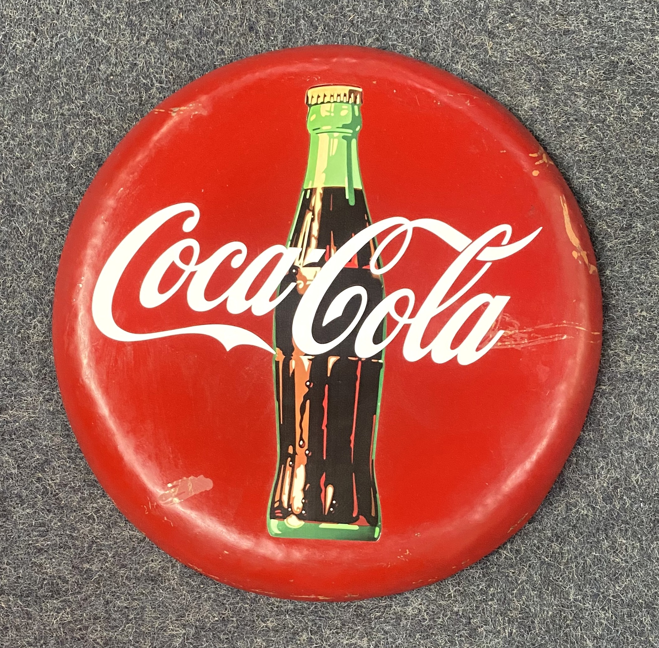 A metal 'bottlecap' style advertising sign for Coca Cola, with printed lettering and bottle 50cm diameter