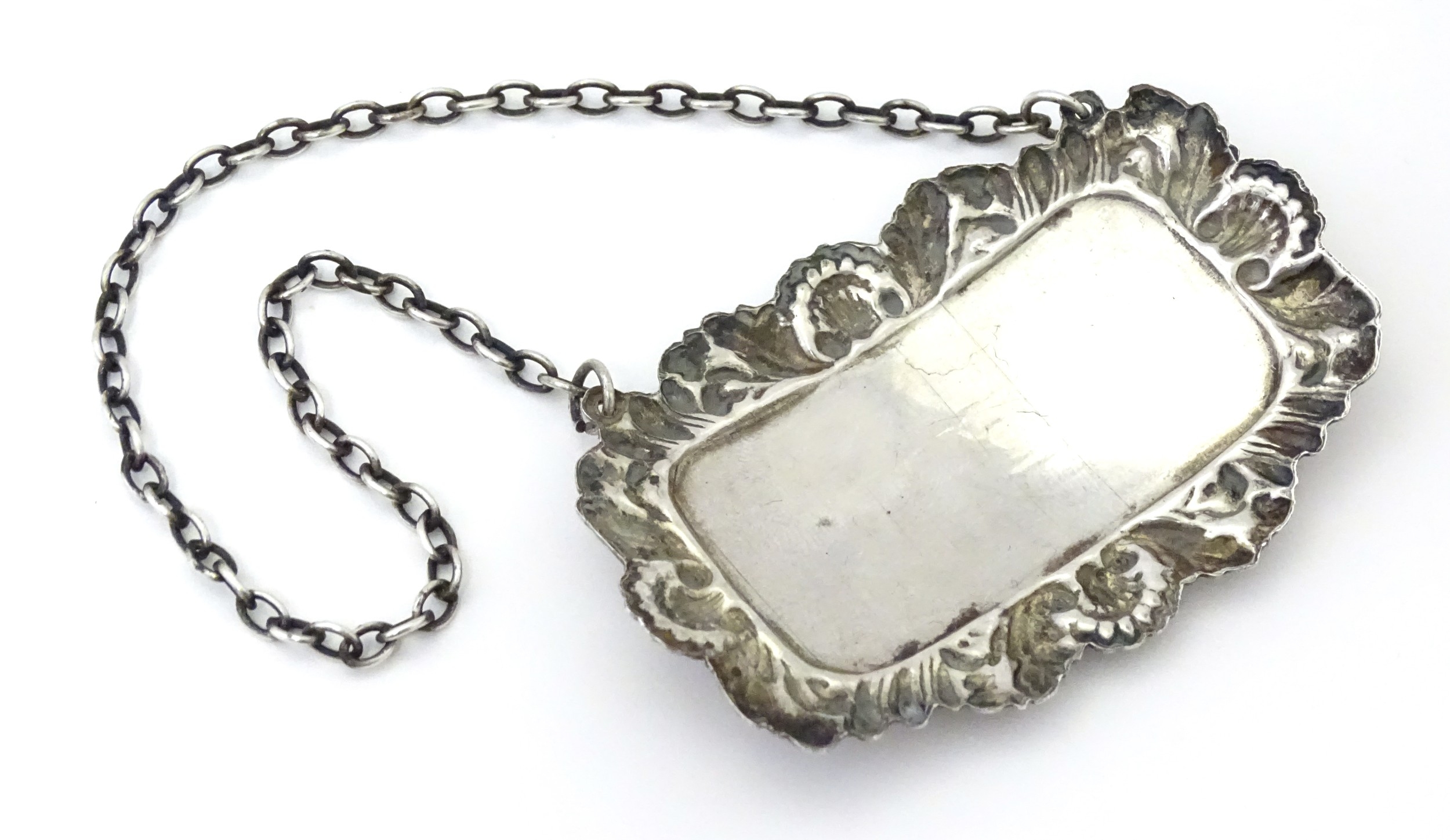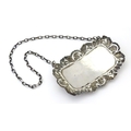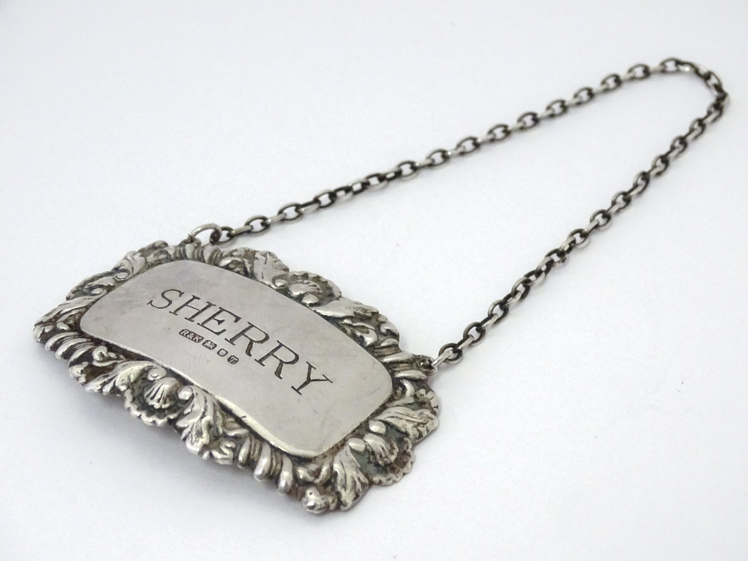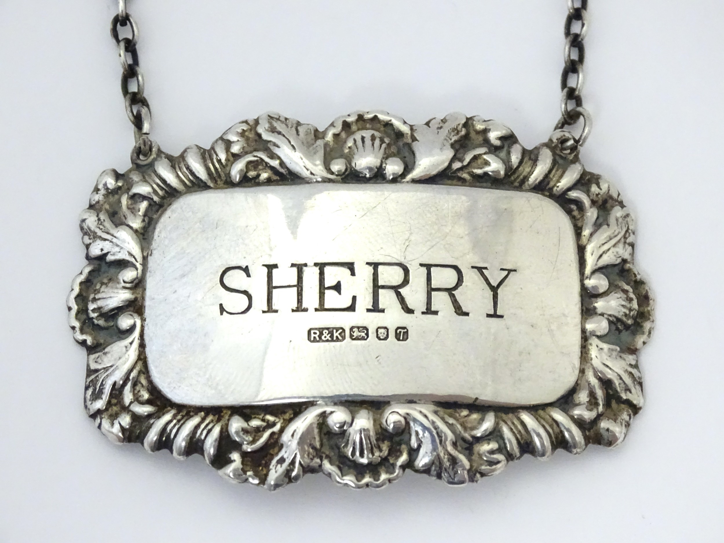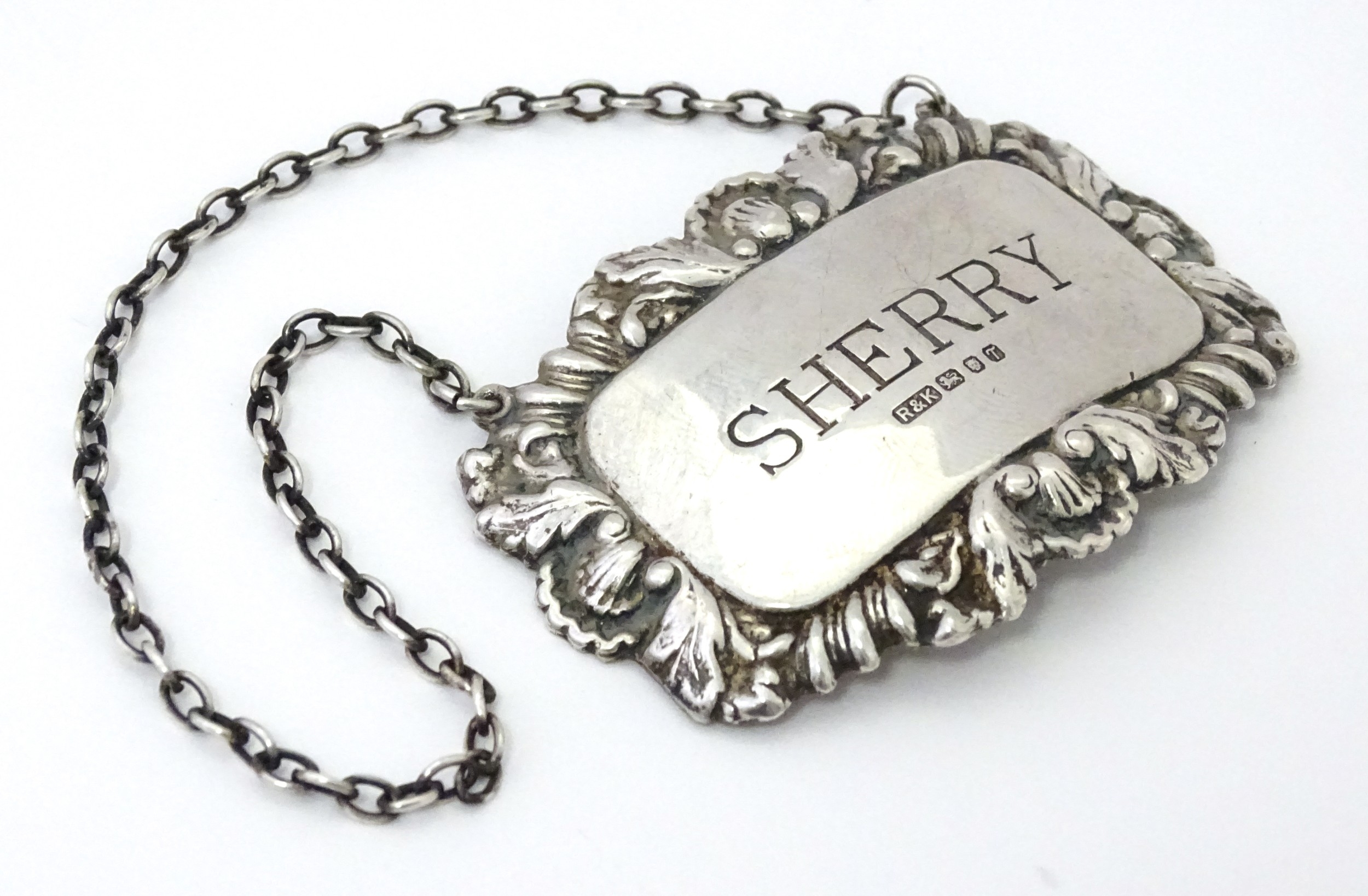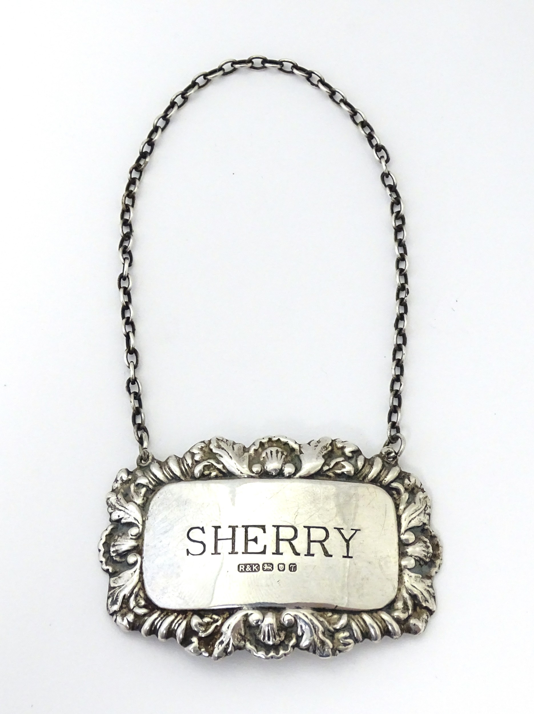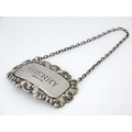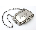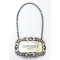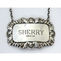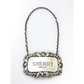 A silver decanter / wine label / bottle ticket for Sherry hallmarked London 1993, maker Richards & Knight. Approx. 2 1/4" wide