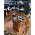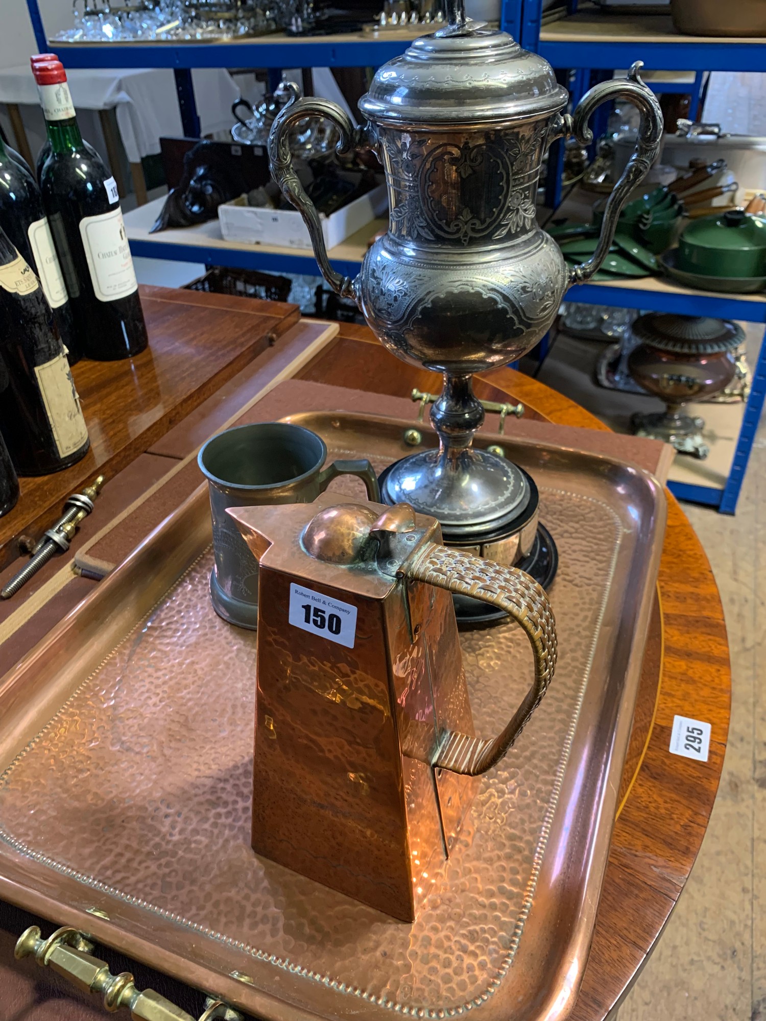 Arts and Crafts hammered jug with cane handle, hammered copper tray, pewter two handled trophy cup with winner shield from 1930 and pewter tankards