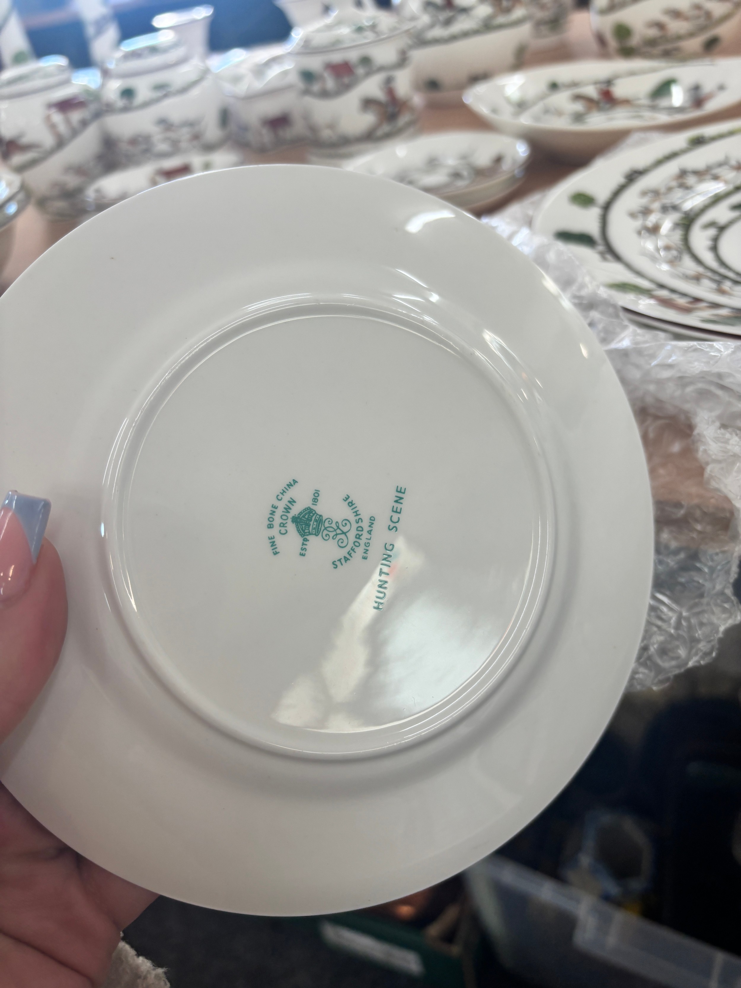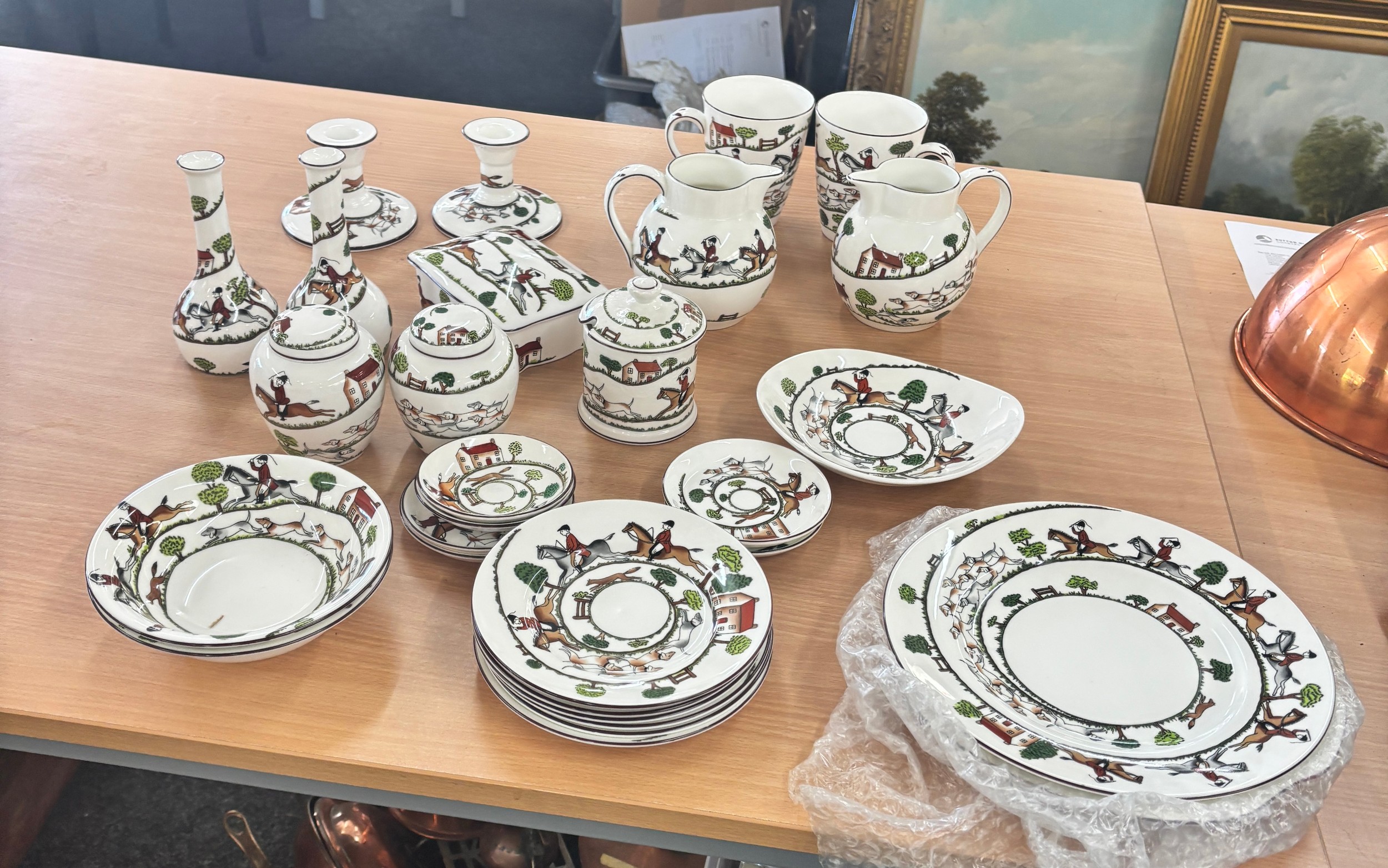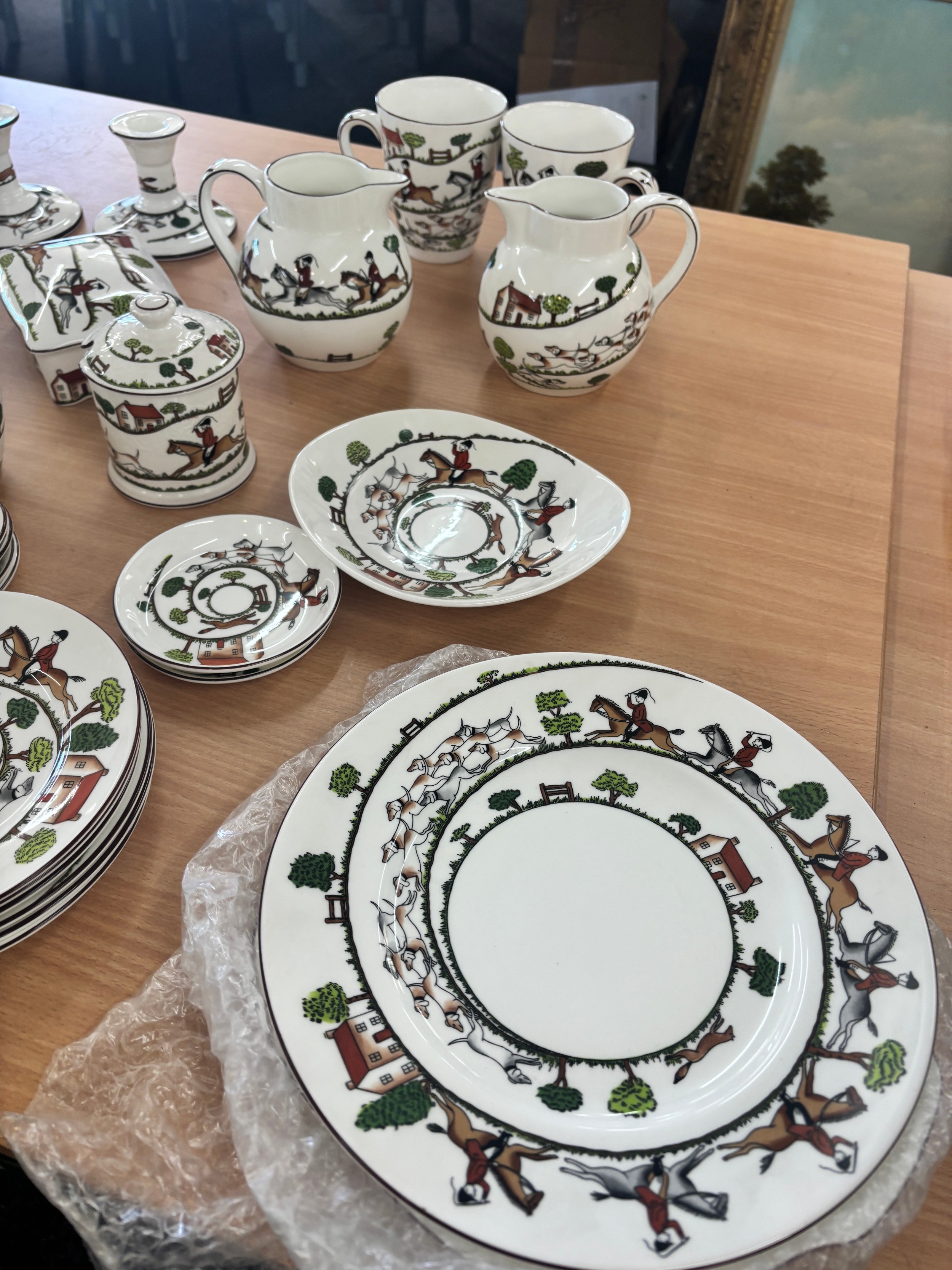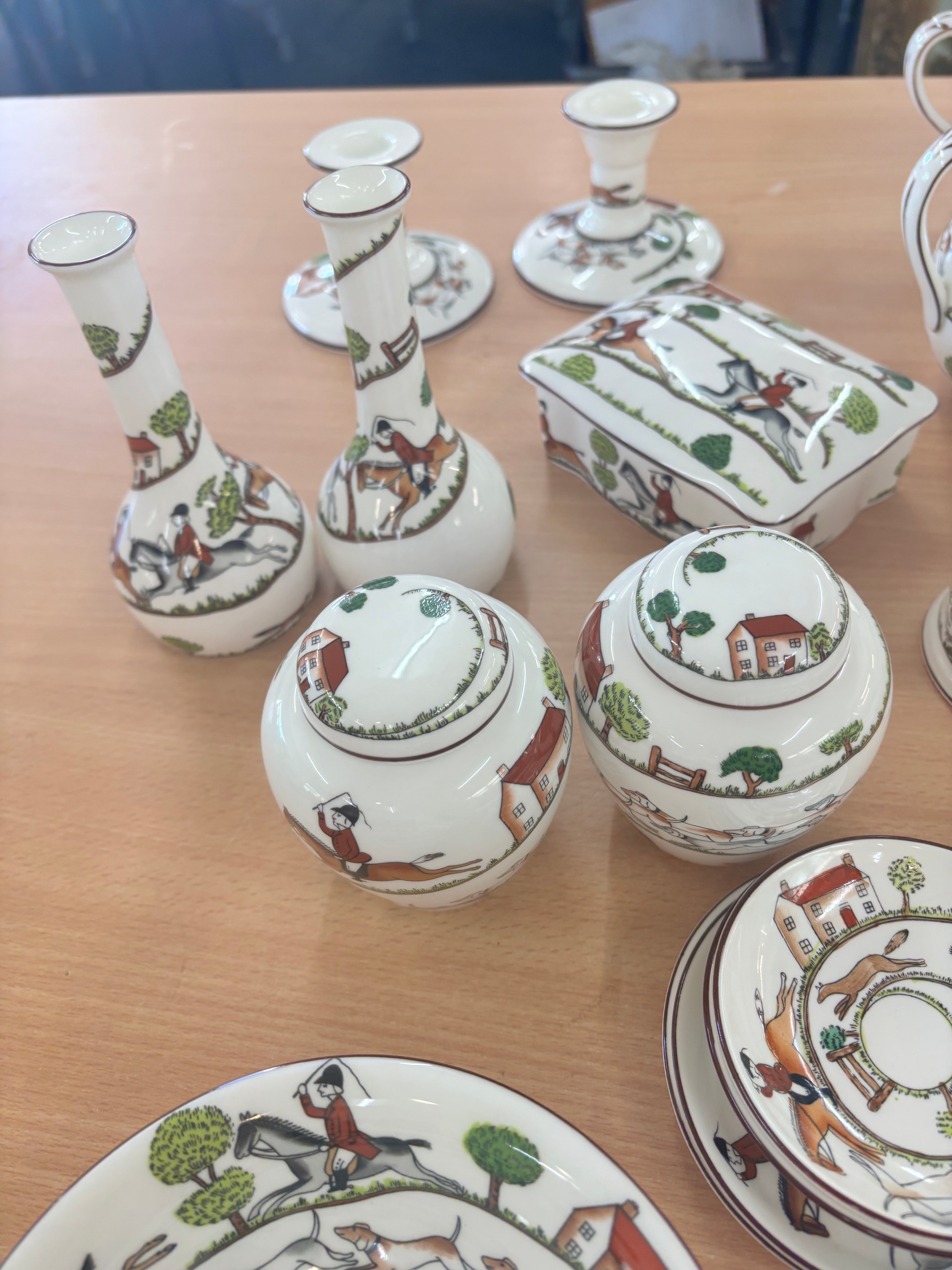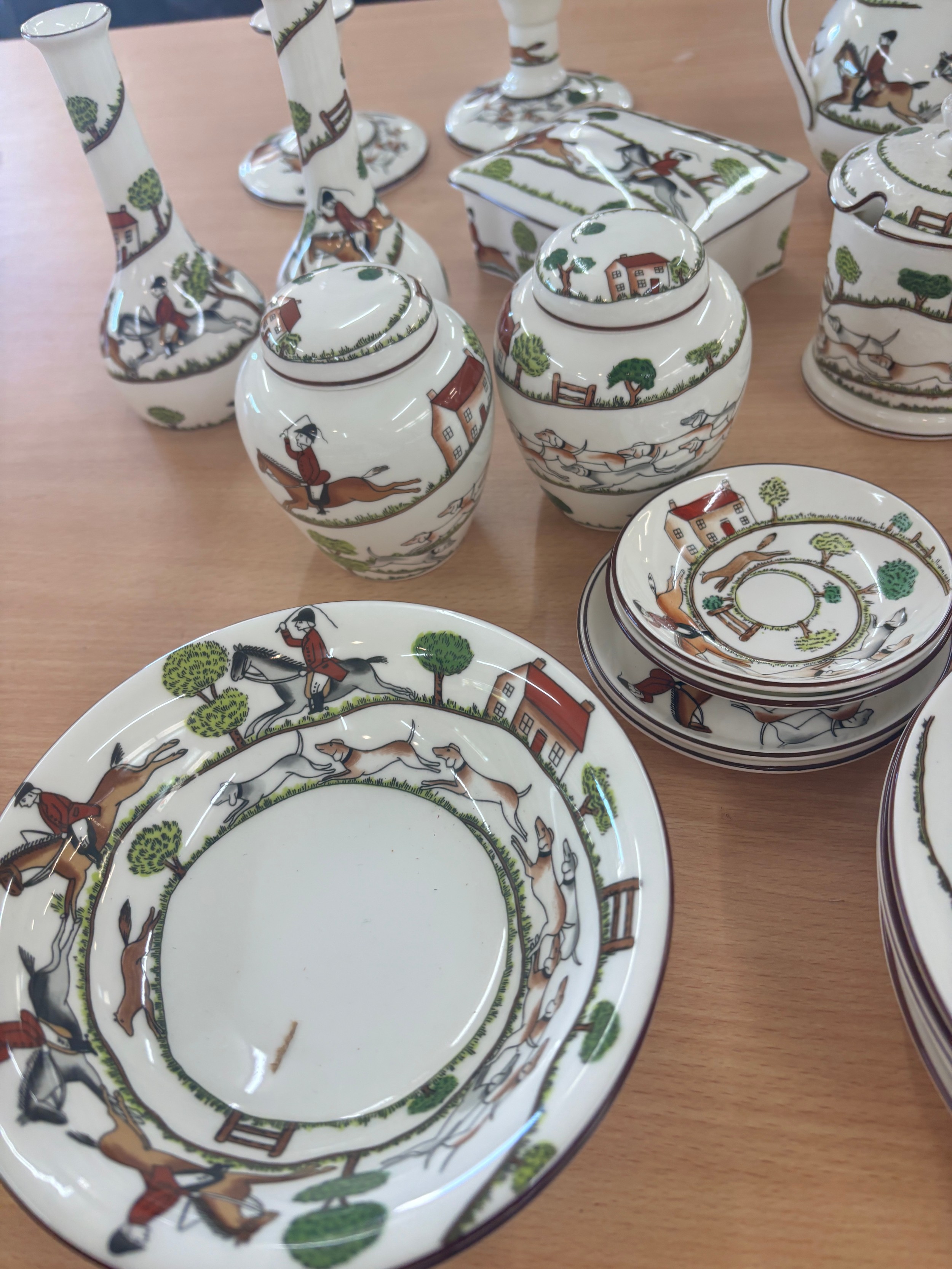 Selection of Crown Staffordshire hunting scene pottery to include plates, jugs, trinkets, vases, cups etc