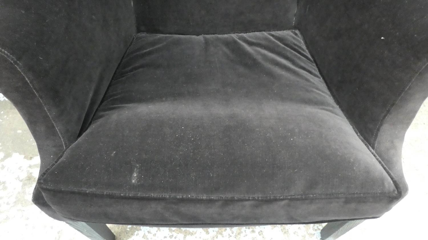 WINGBACK ARMCHAIRS, a pair, with a black velvet finish, 85cm W x 122cm H. (2) (some sun fading)