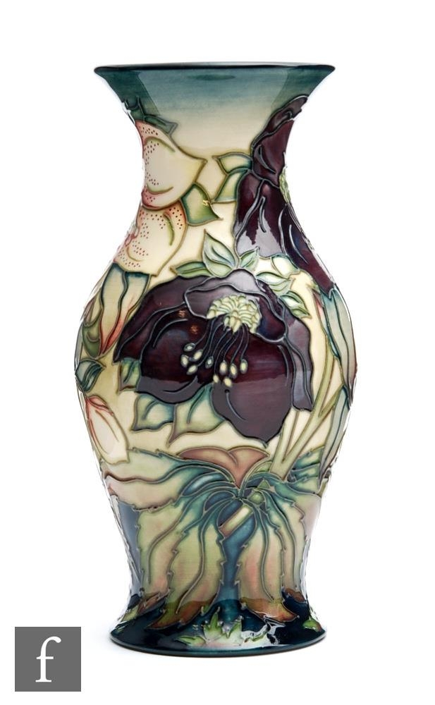 A Moorcroft Pottery vase decorated in the Hellebore pattern designed by Nicola Slaney, impressed mark and signed N. Slaney in gold, boxed, height 19cm.