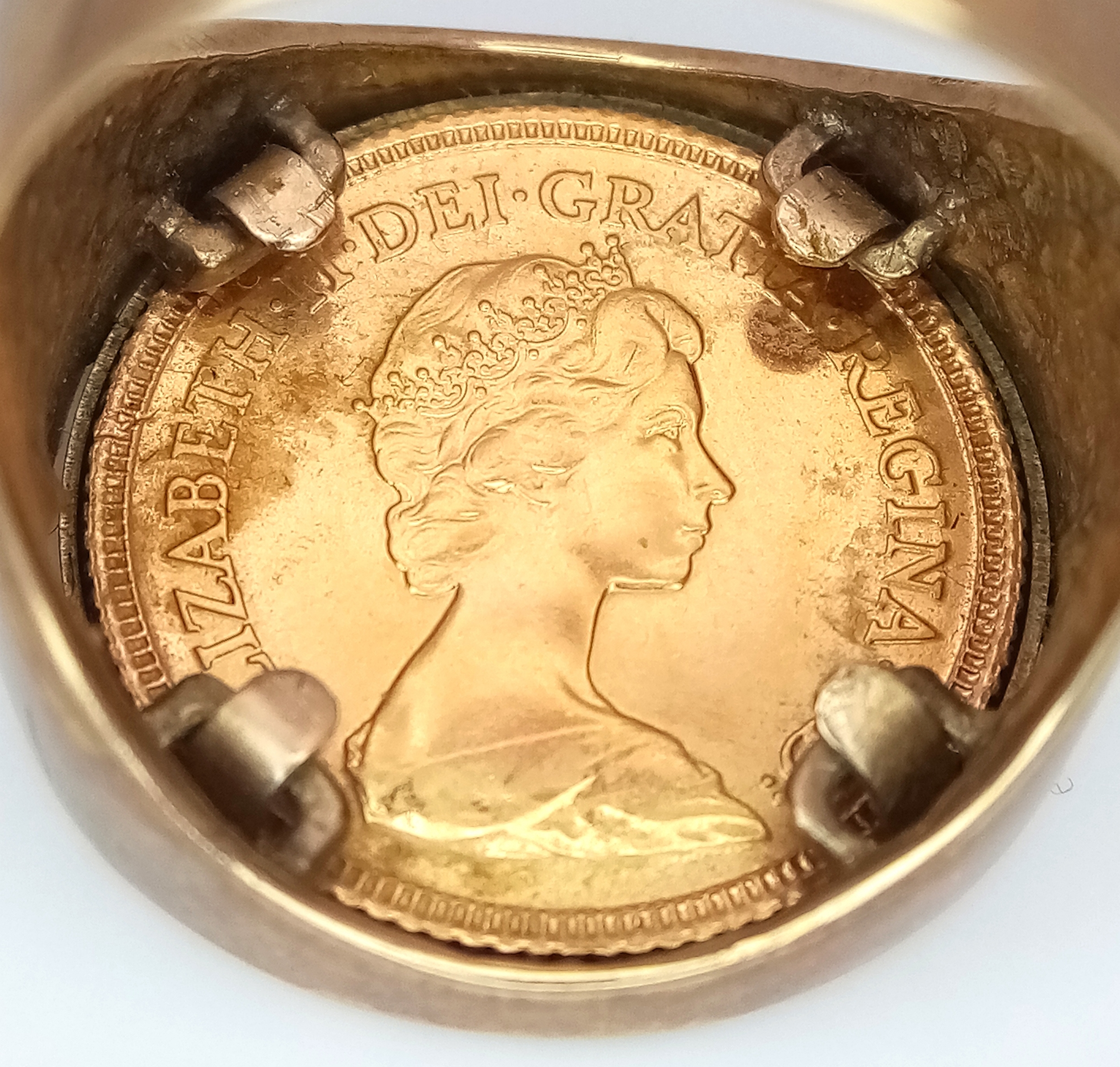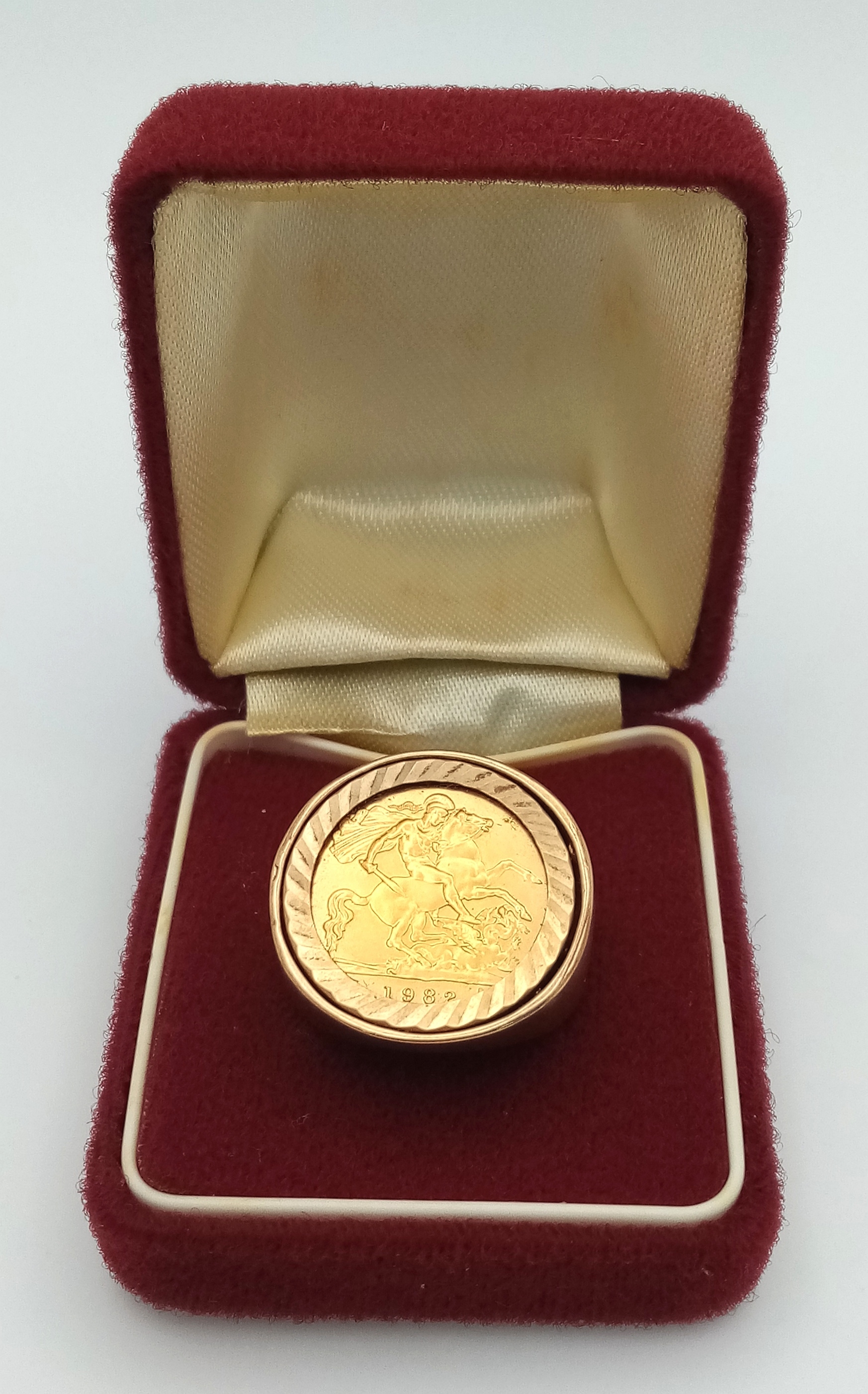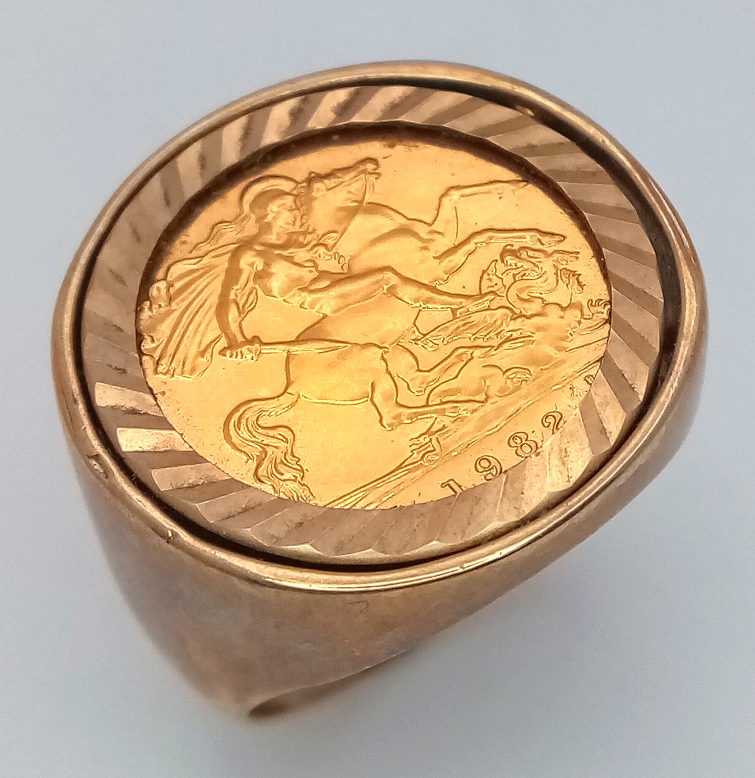 A Classic Half Sovereign Ring. A 1982 Queen Elizabeth II, 22k gold half sovereign coin set in a 9K Setting. 11.6g total weight. Size R 1/2.