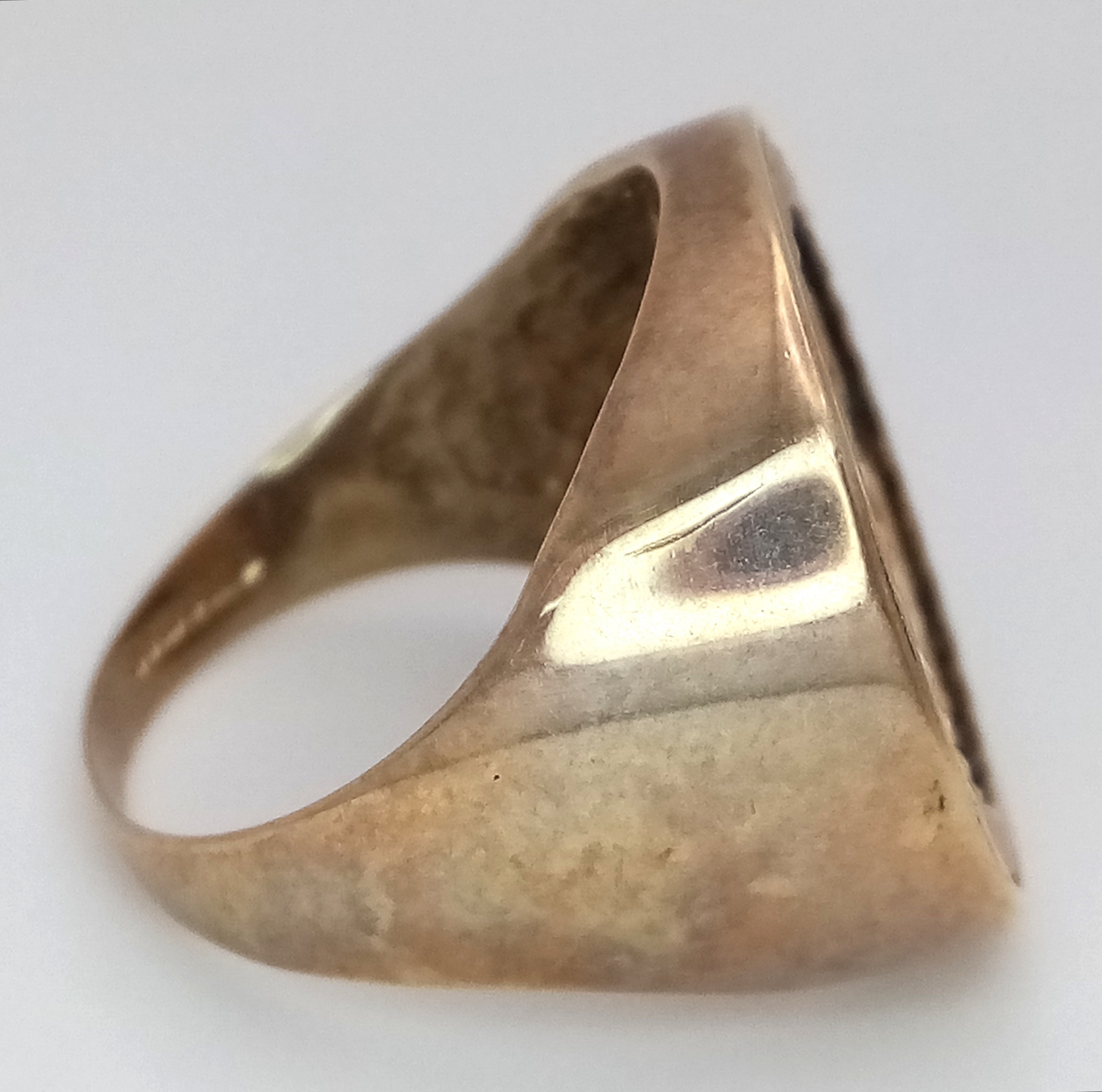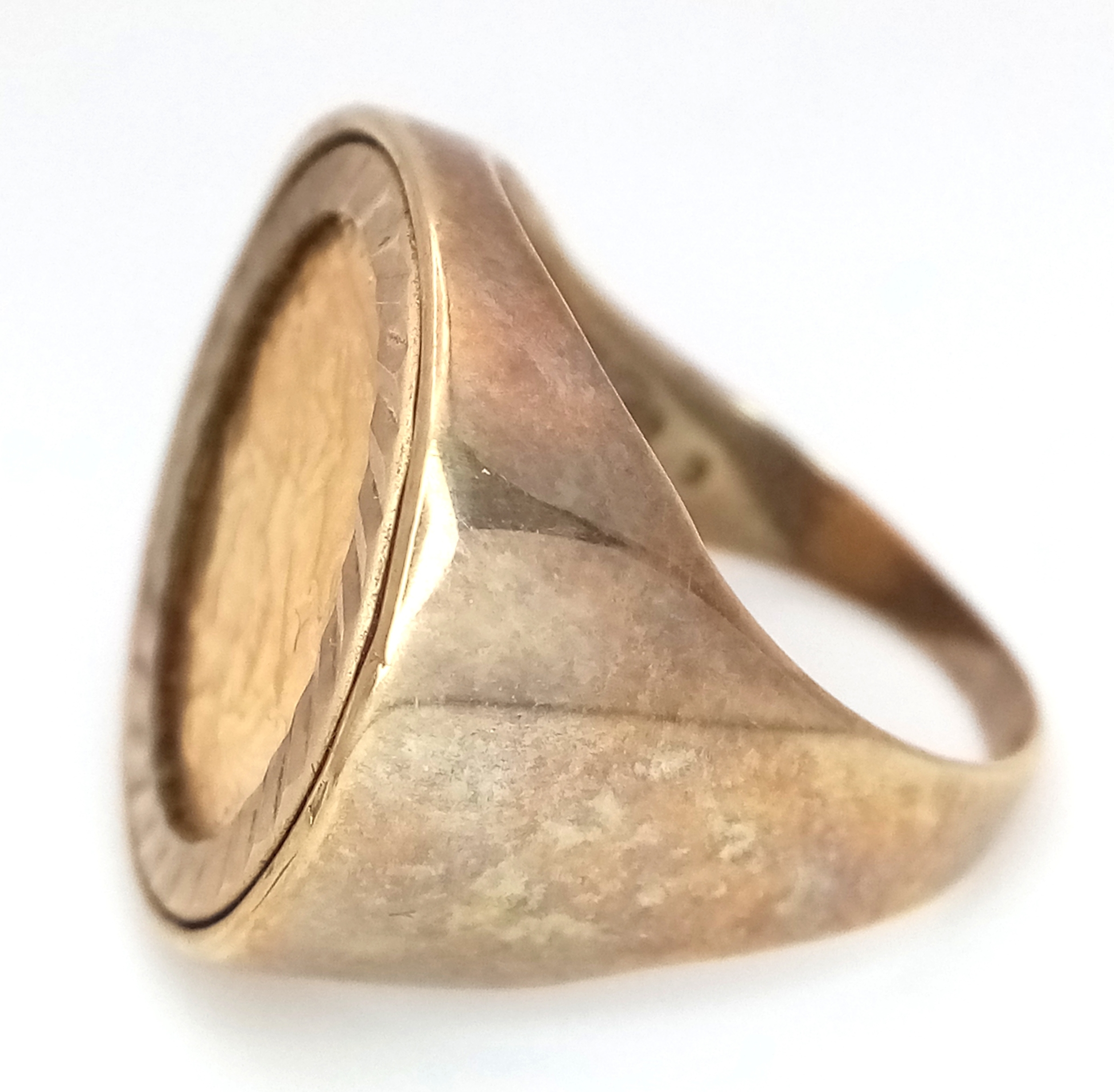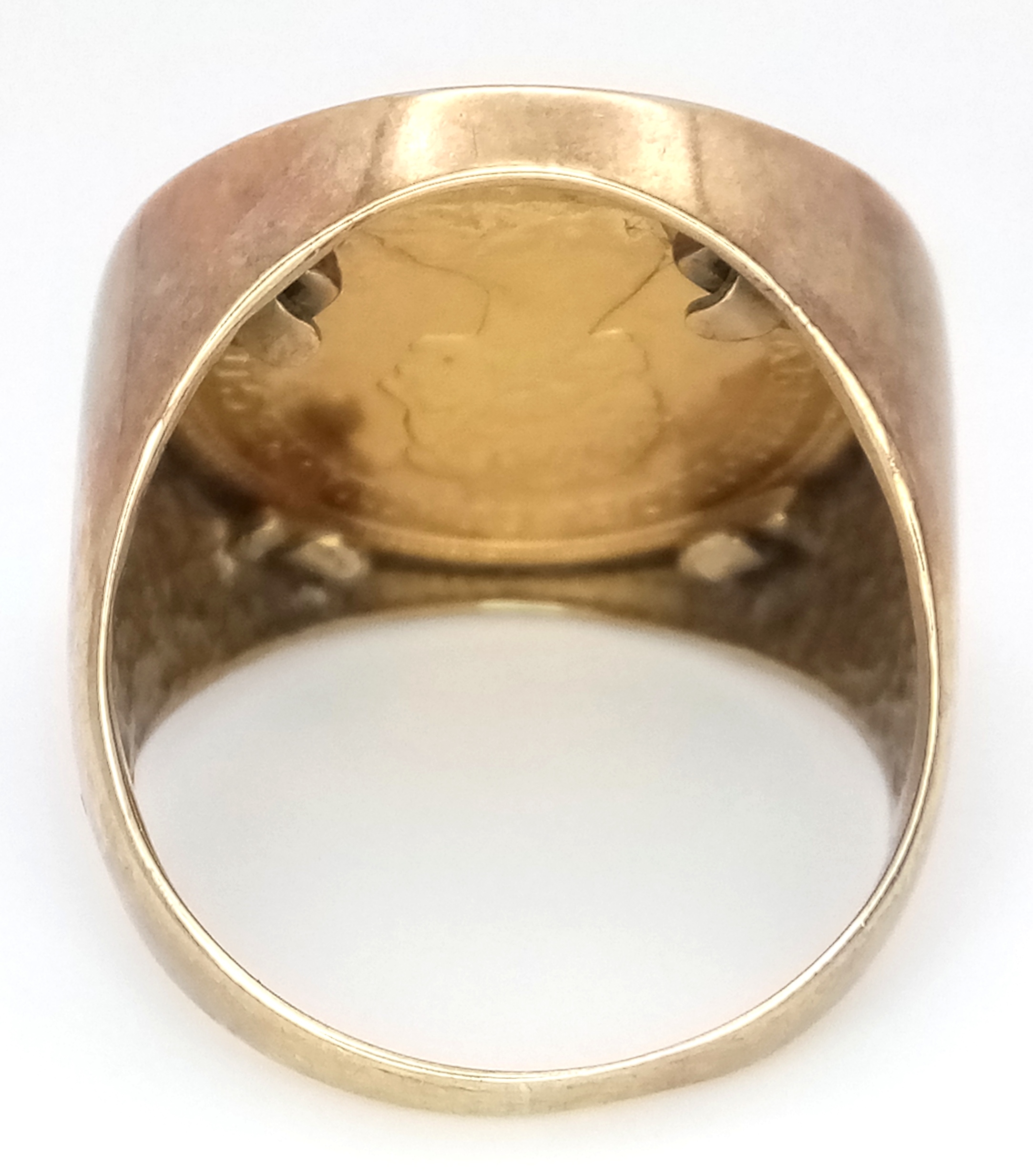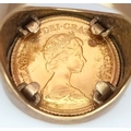 A Classic Half Sovereign Ring. A 1982 Queen Elizabeth II, 22k gold half sovereign coin set in a 9K Setting. 11.6g total weight. Size R 1/2.