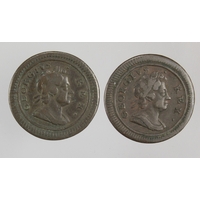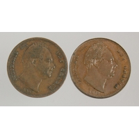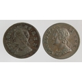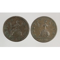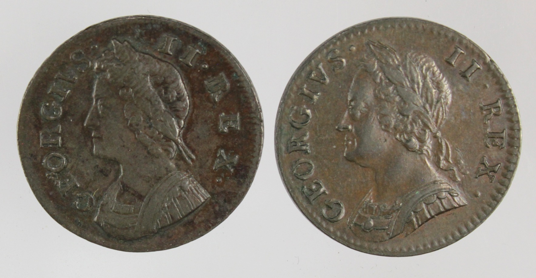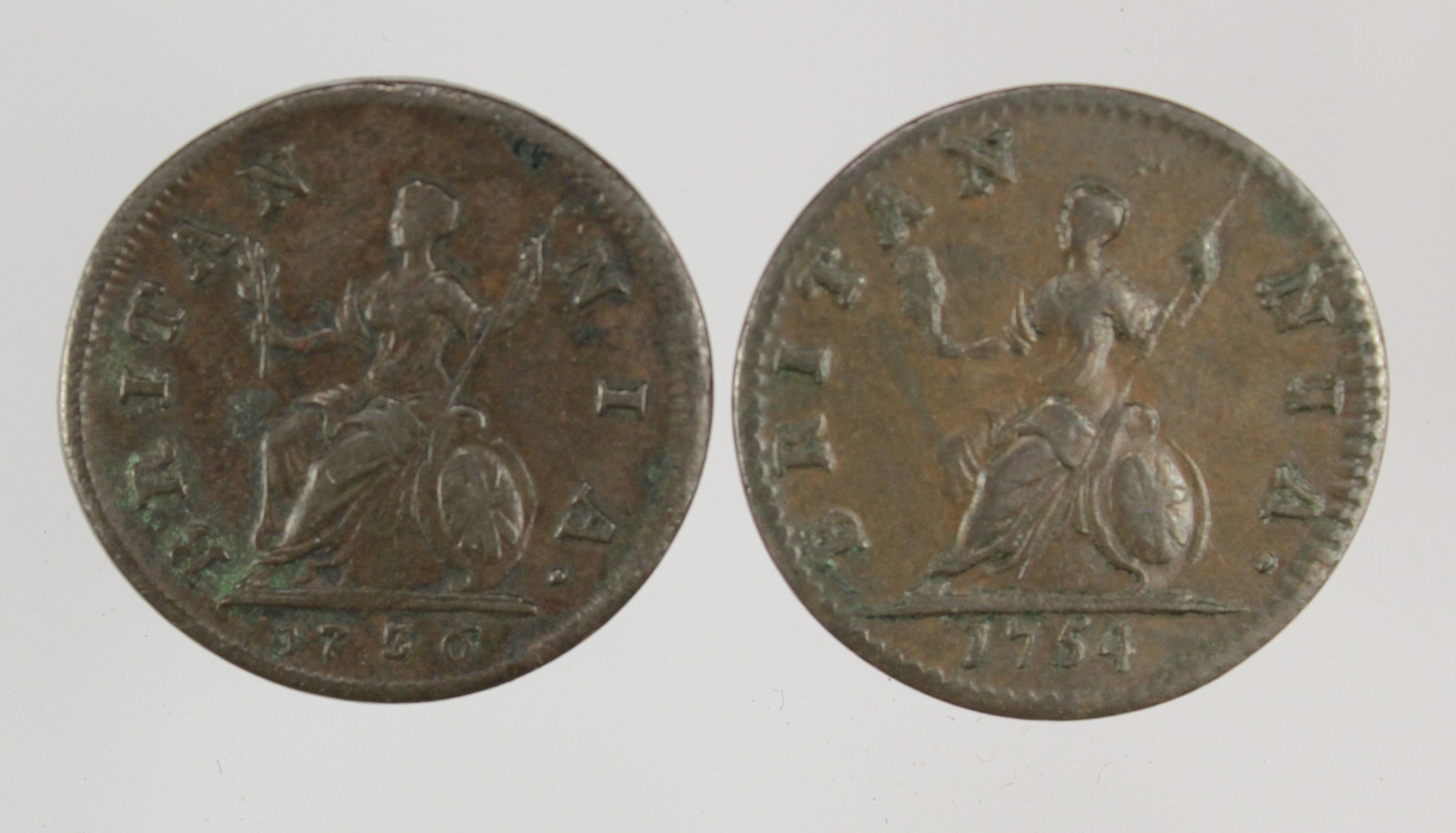 Farthings (2) George II: 1736 VF a touch of verdigris, and 1754 (interesting die flaw reverse) GVF.