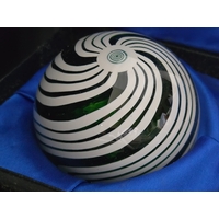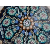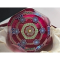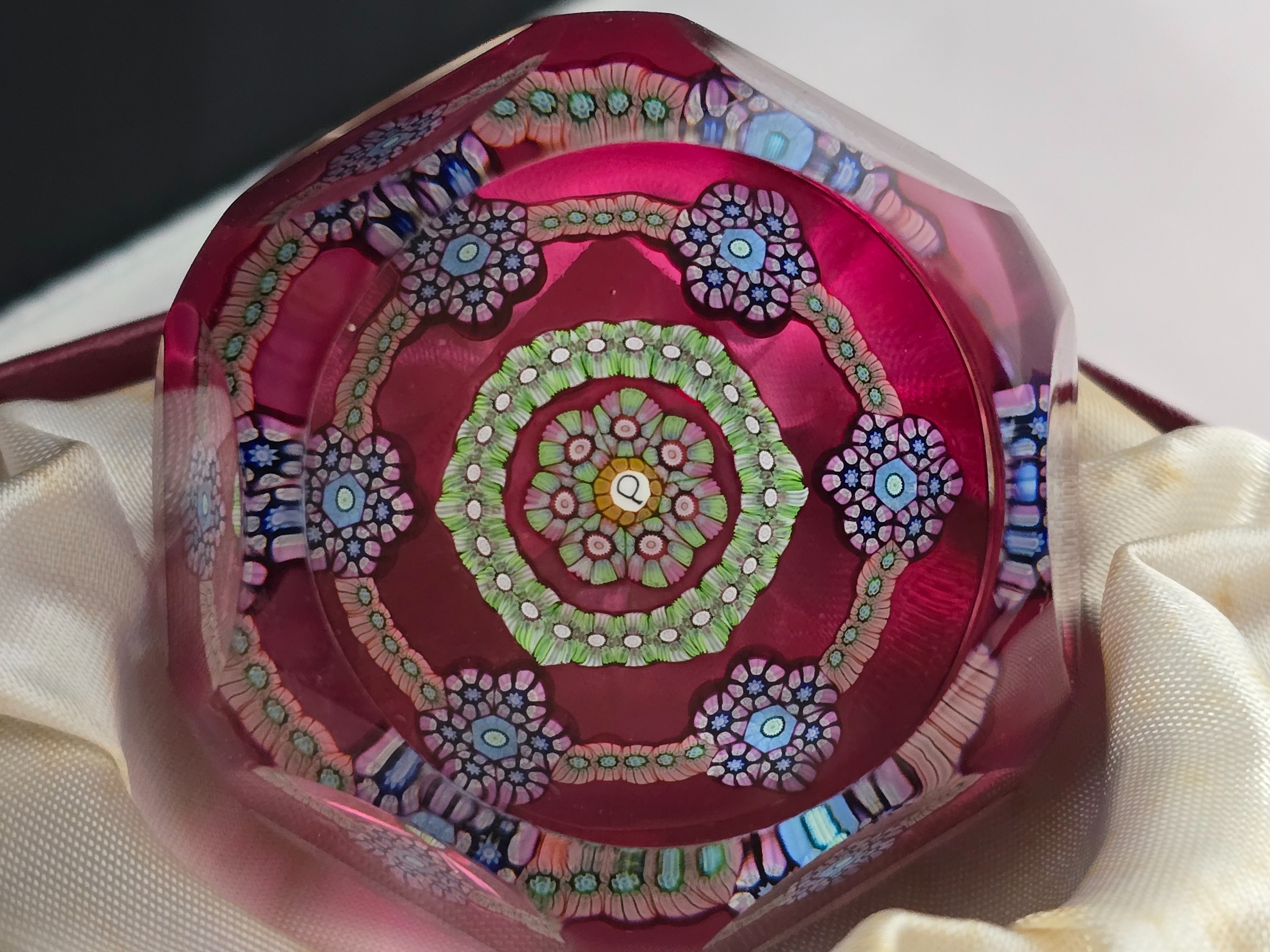 Perthshire Paperweight: PP77. Pretty medium Patterned millefiori weight on translucent pale ruby ground. Faceted. Excellent condition, 63mm diam . Boxed