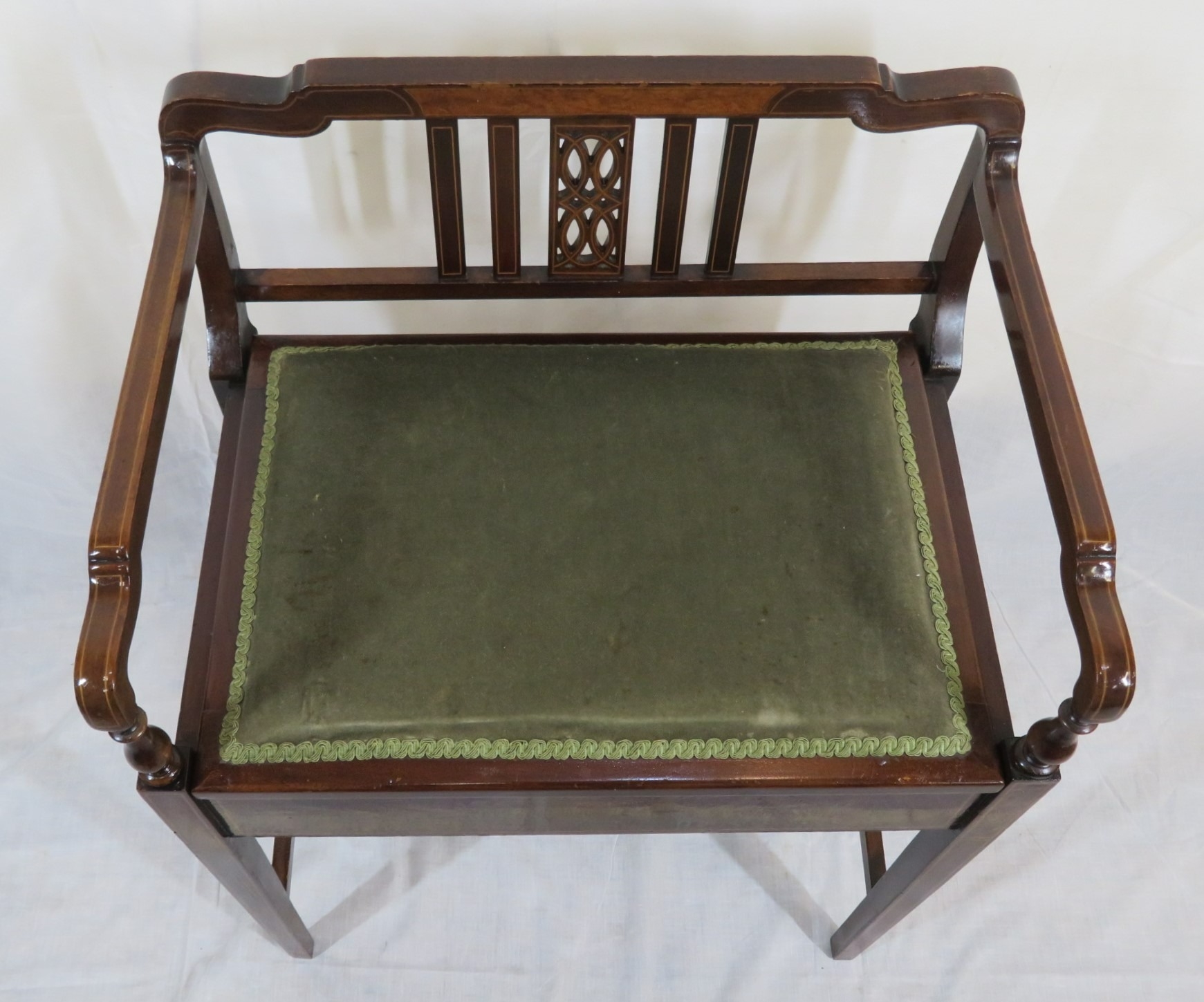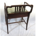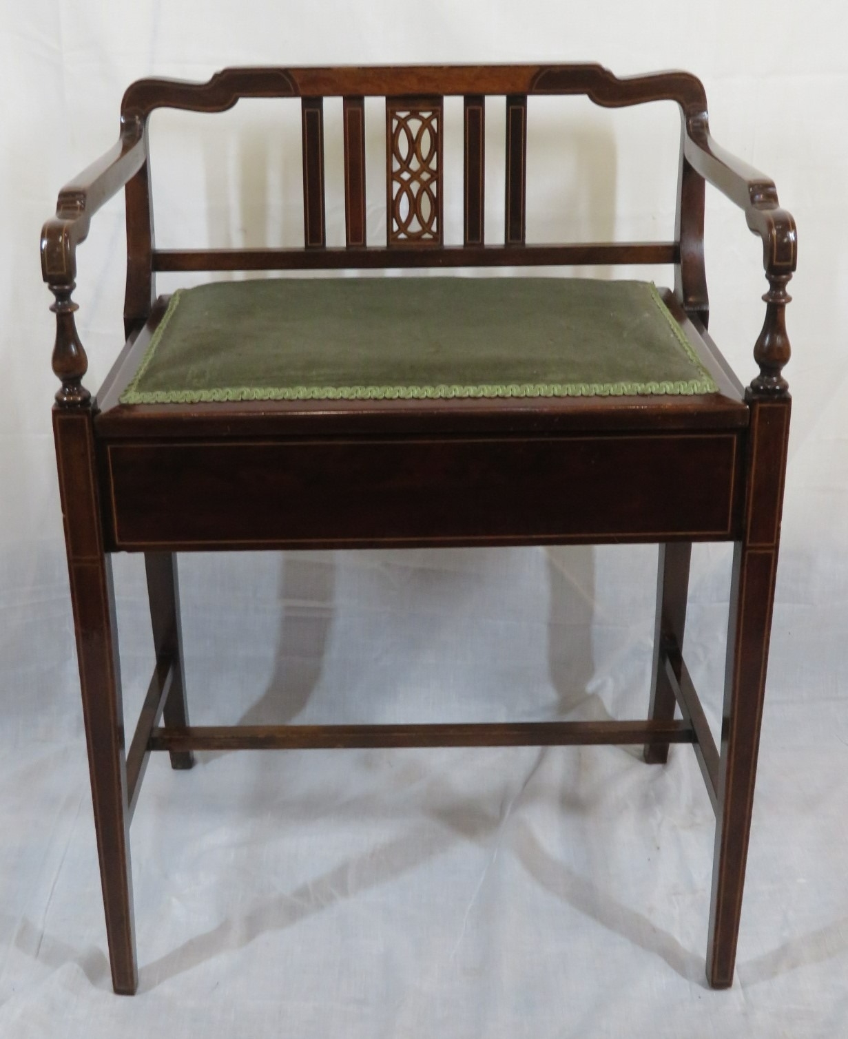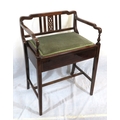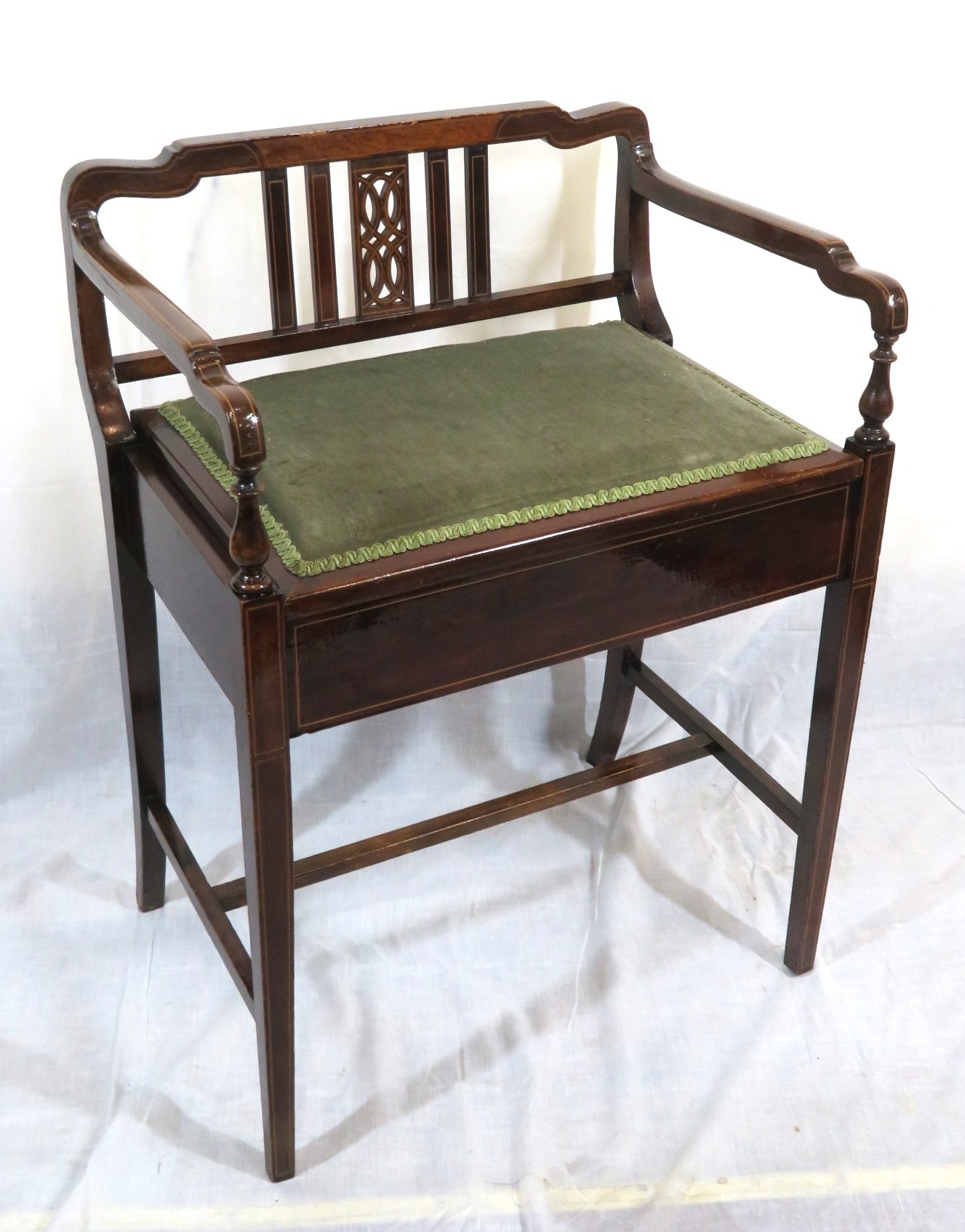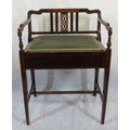 Edwardian inlaid mahogany piano seat with inlaid rails, lift-u upholstered seat, on tapering legs with stretchers