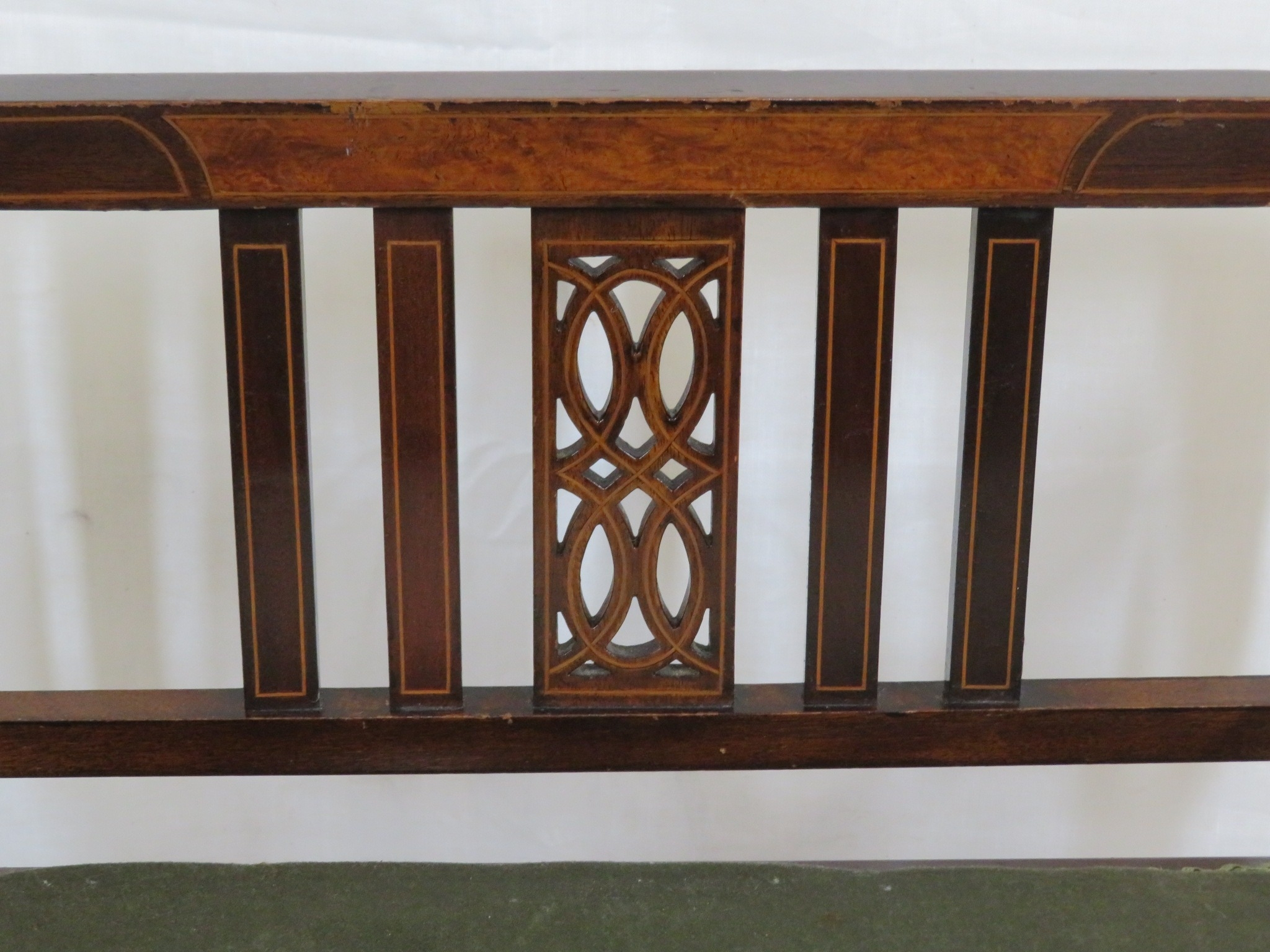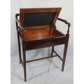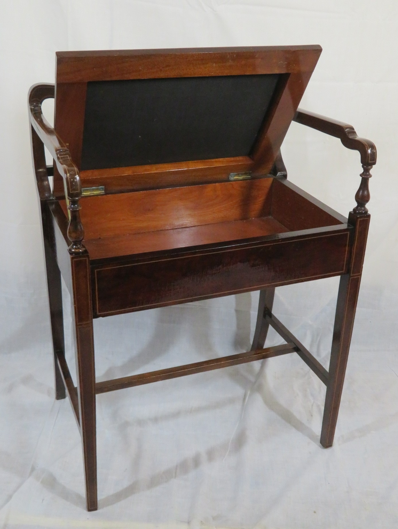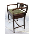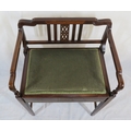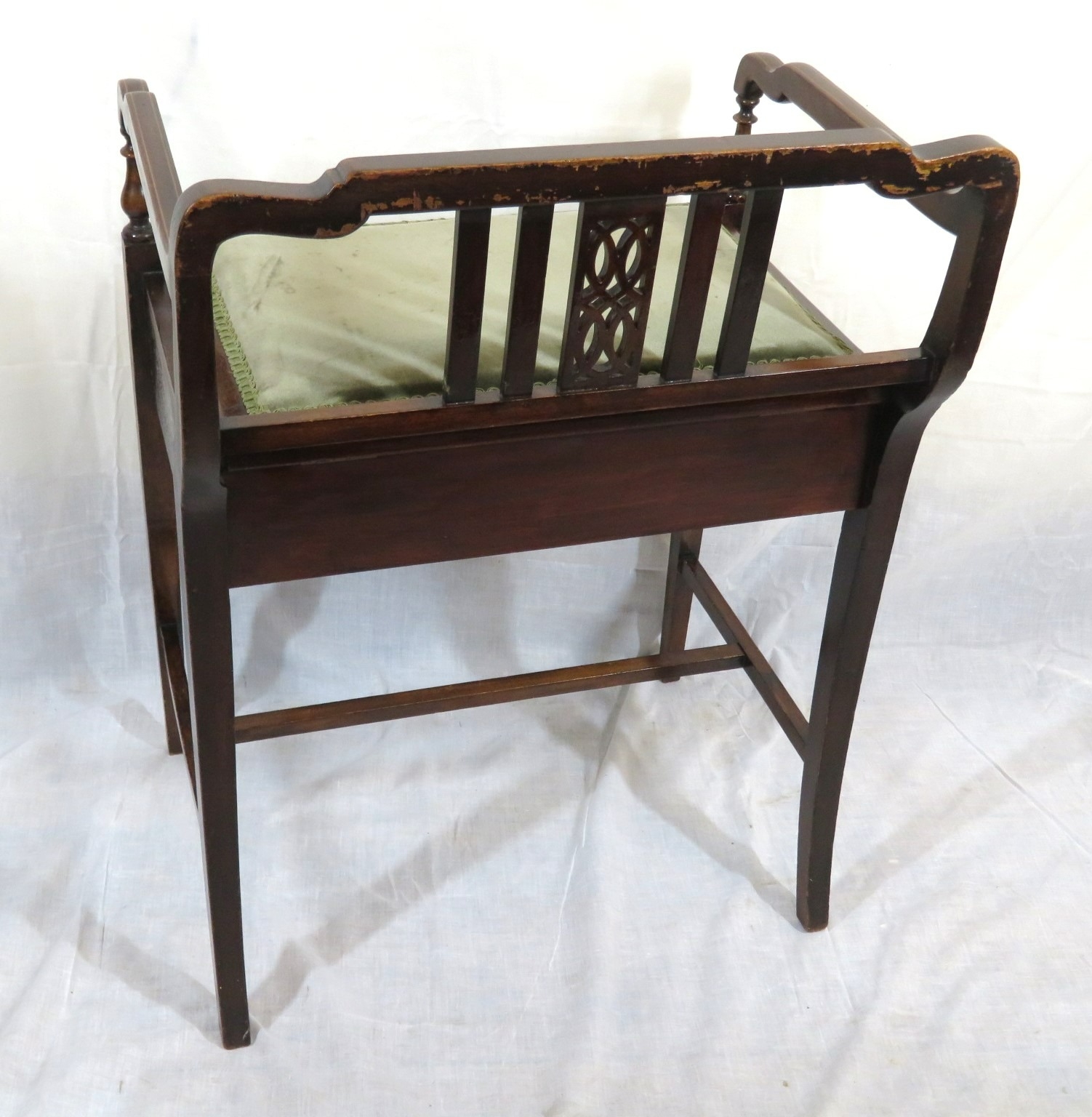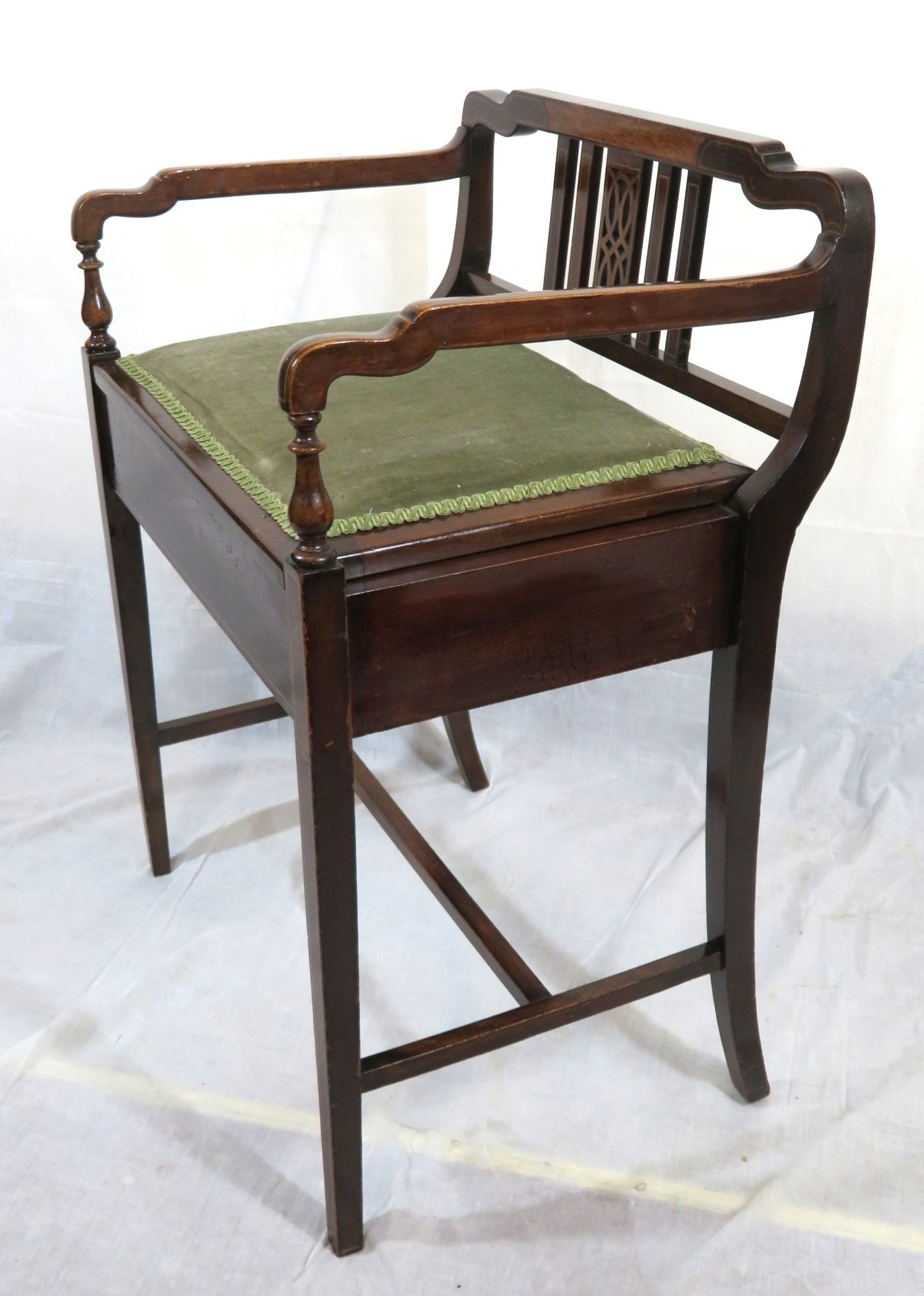 Edwardian inlaid mahogany piano seat with inlaid rails, lift-u upholstered seat, on tapering legs with stretchers