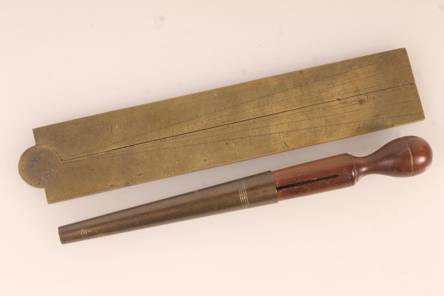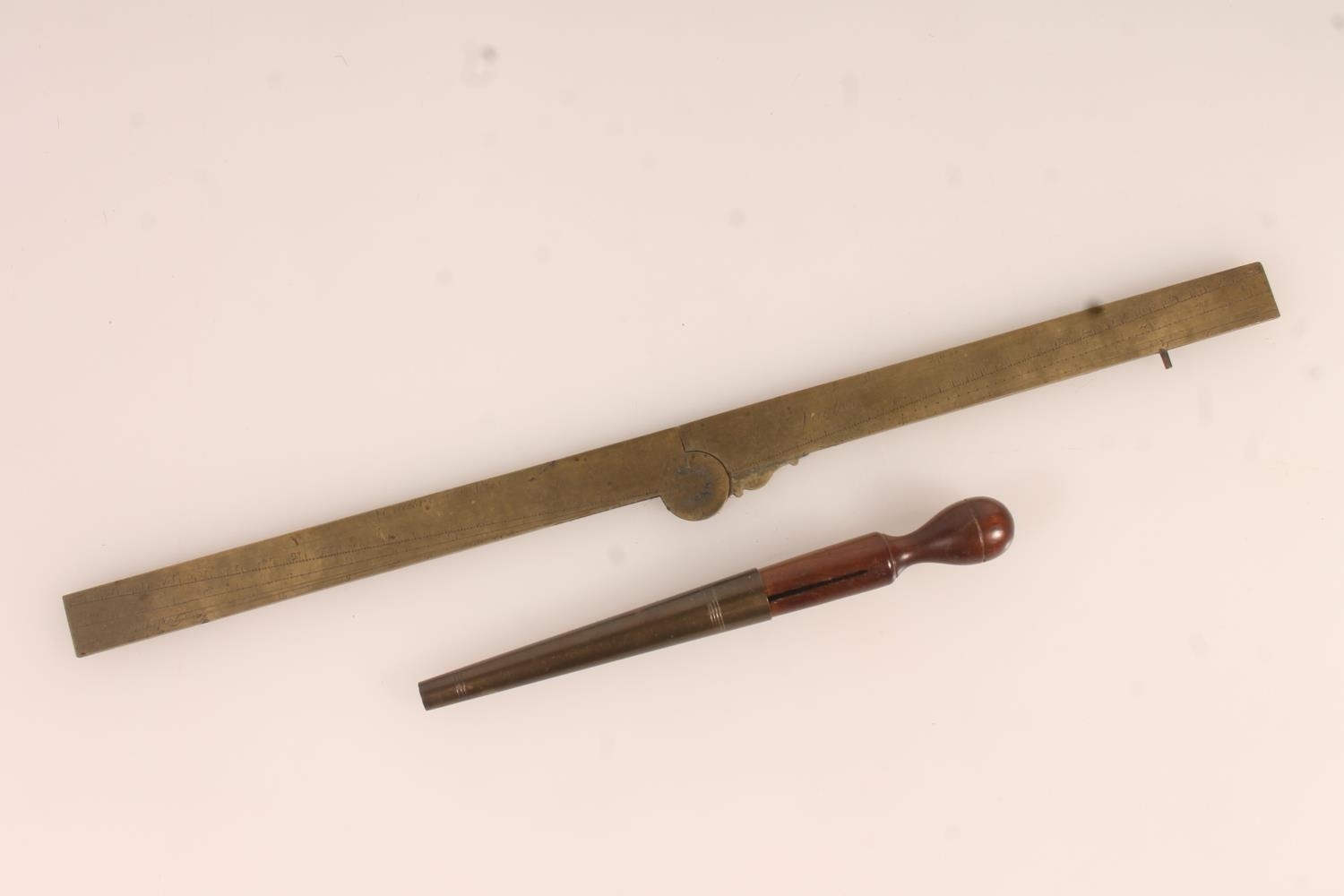 19thC French brass folding navigational rule and a 19thC treen tool with internal cutting blade.