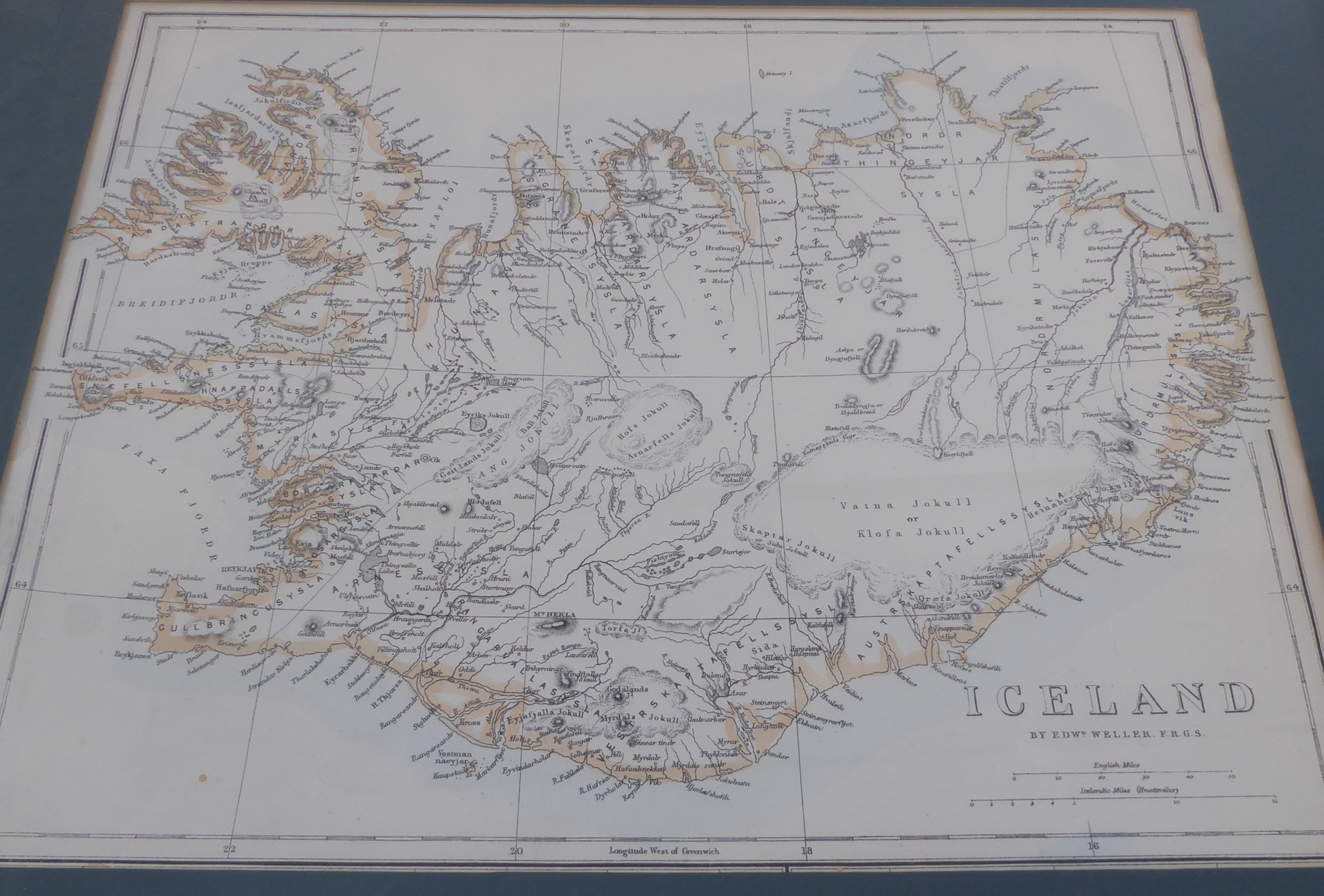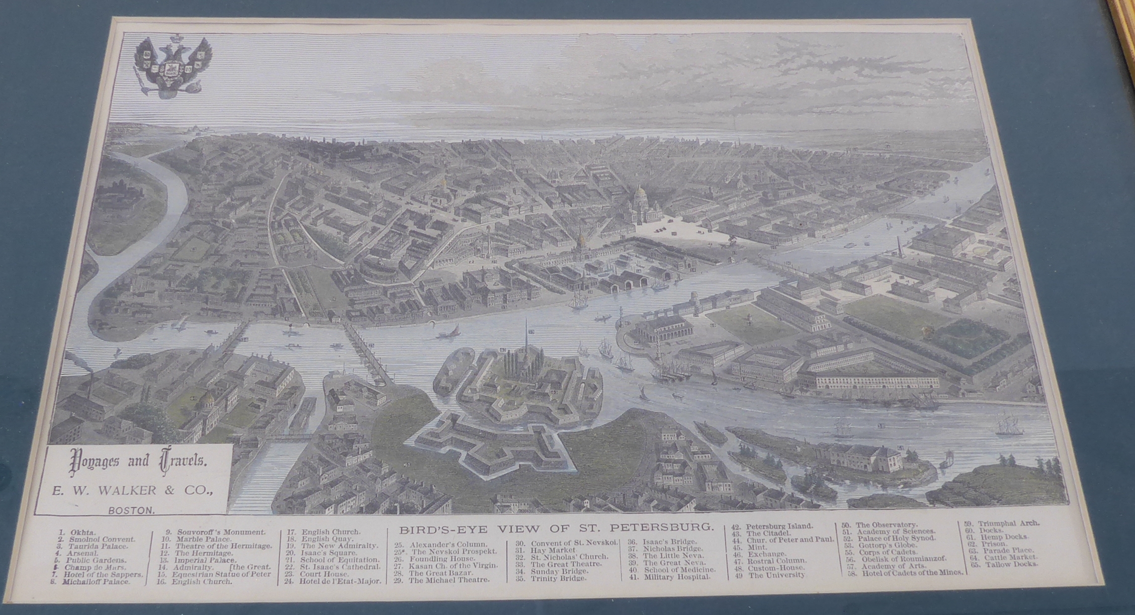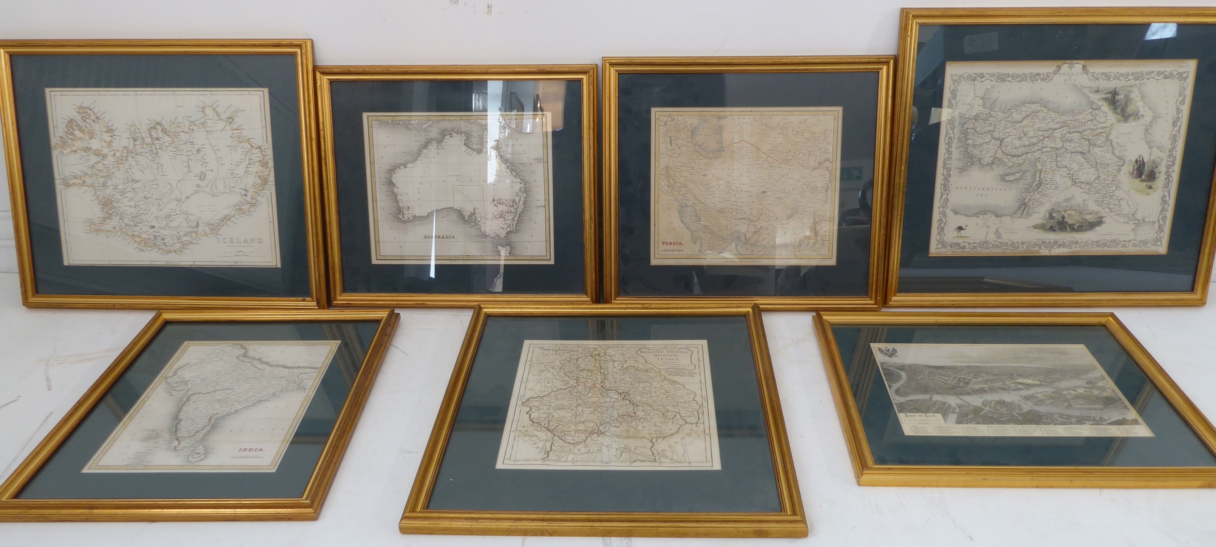 Seven mostly 19th century hand-coloured antiquarian map engravings to include India, bird's-eye view of St. Petersburg, Iceland by Edward Weller, Bohême Silésie Moravie Lusace (18th / 19th century), Turkey in Asia, Australia and Persia. Later glazed gilt frames. Some fading commensurate with age, but mostly in good condition.