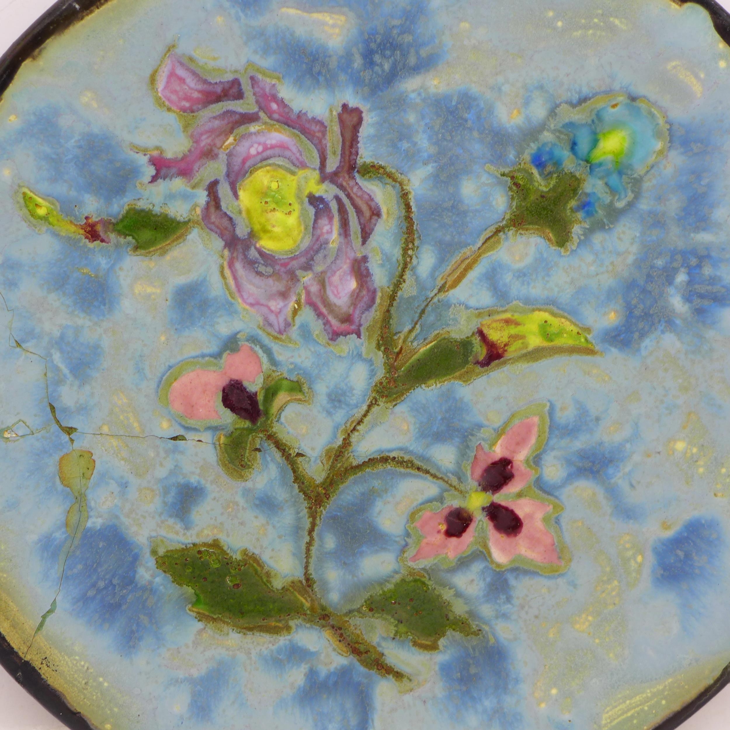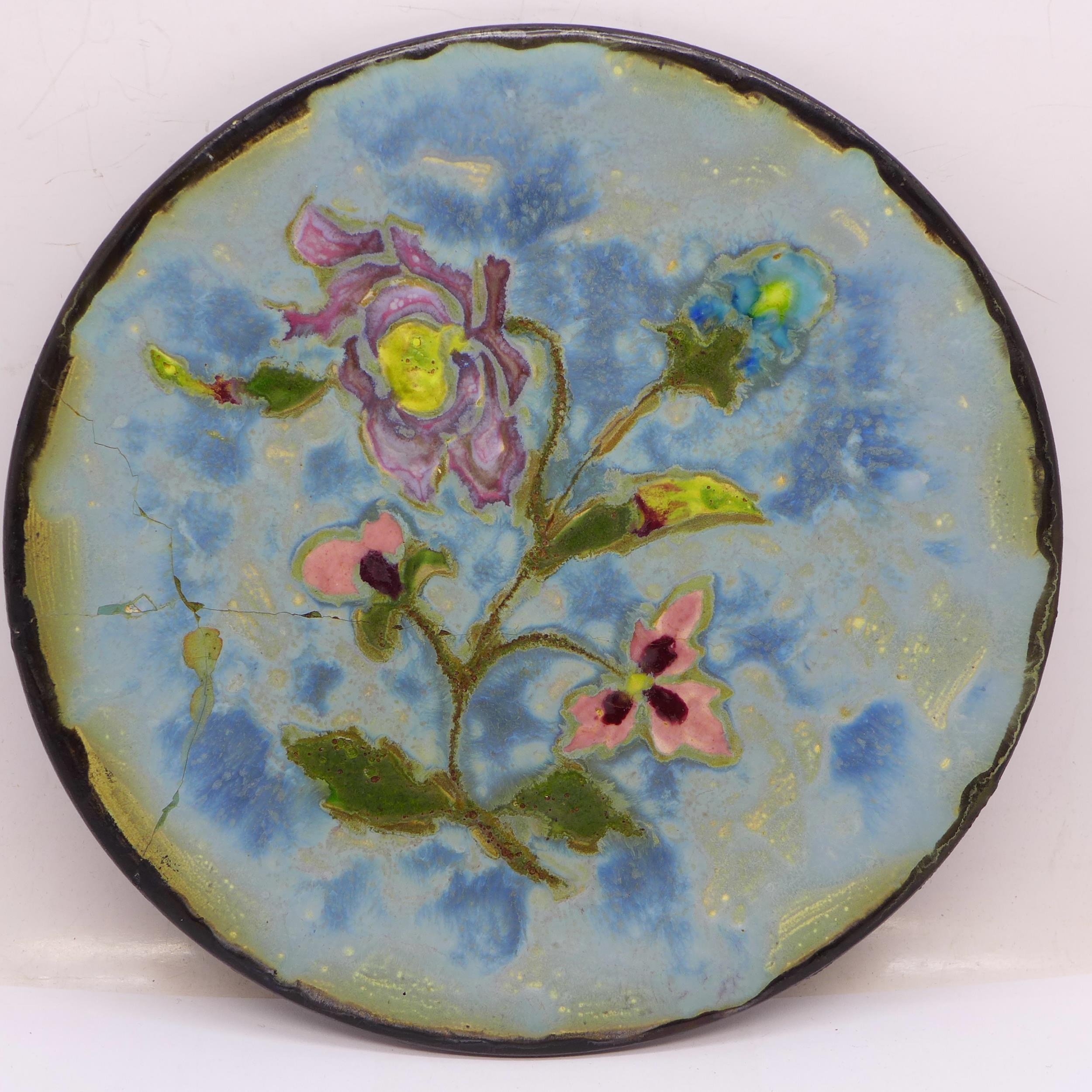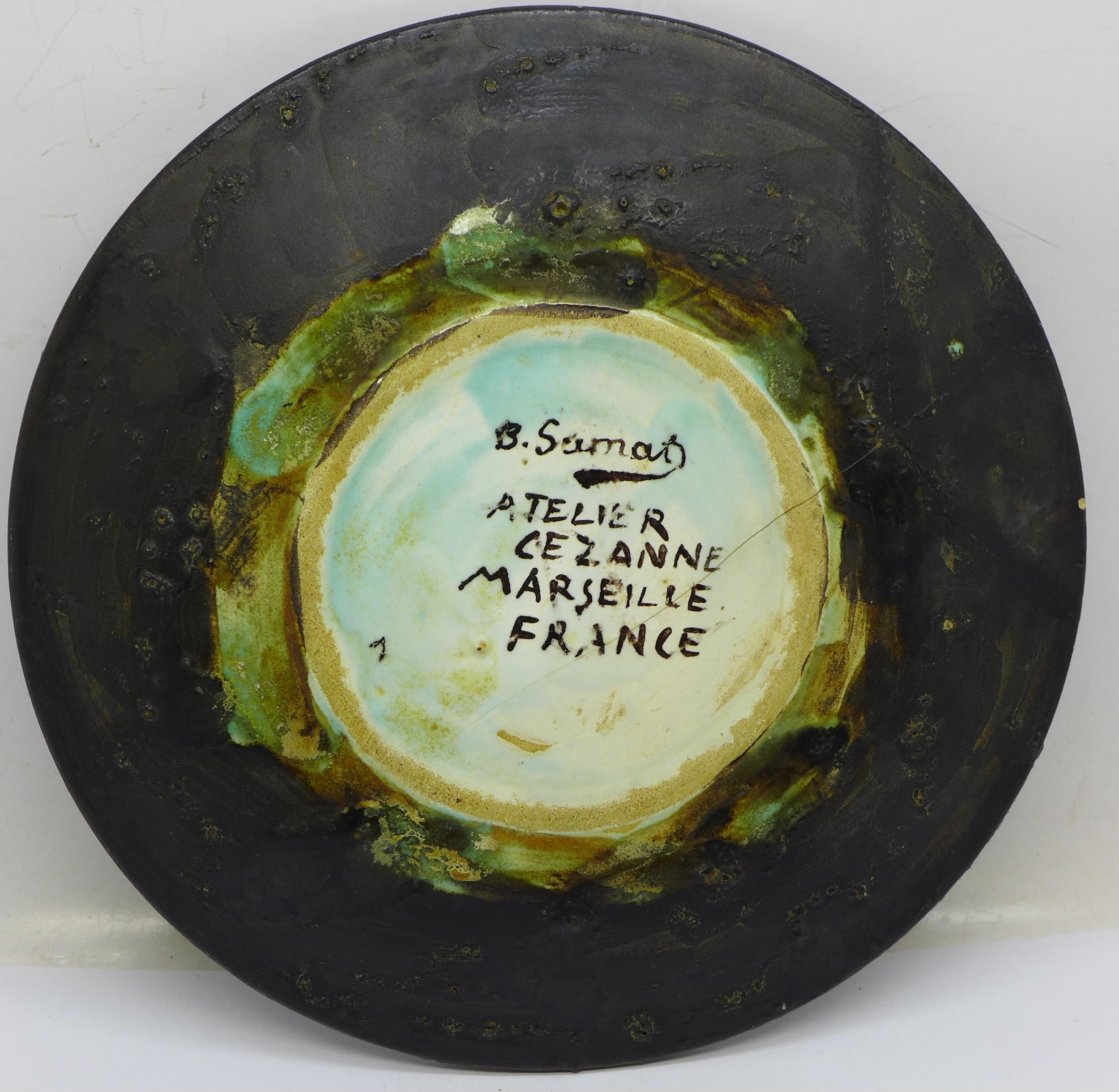 An enamelled and hand decorated plate, reverse marked B Samah, Atelier Cezanne, Marseille, France, 18cm, a/f