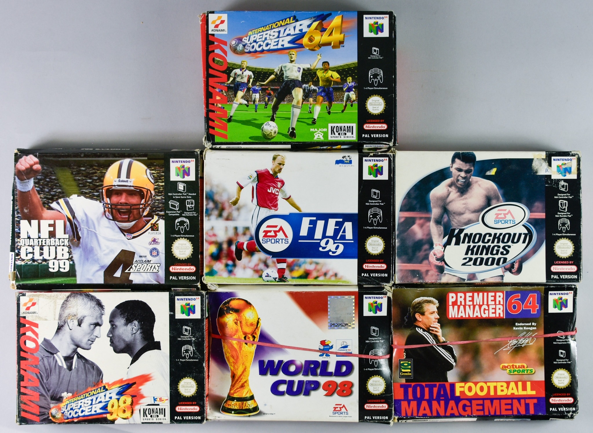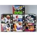 Nintendo 64 Seven Games - "Knockout Kings 2000", "Fifa 99", "World Cup 98", "International Superstar Soccer 98", "International Superstar Soccer 64", "Premier Manager 64" and "NFL Quaterback Club 99", all in original boxes with instruction manuals