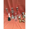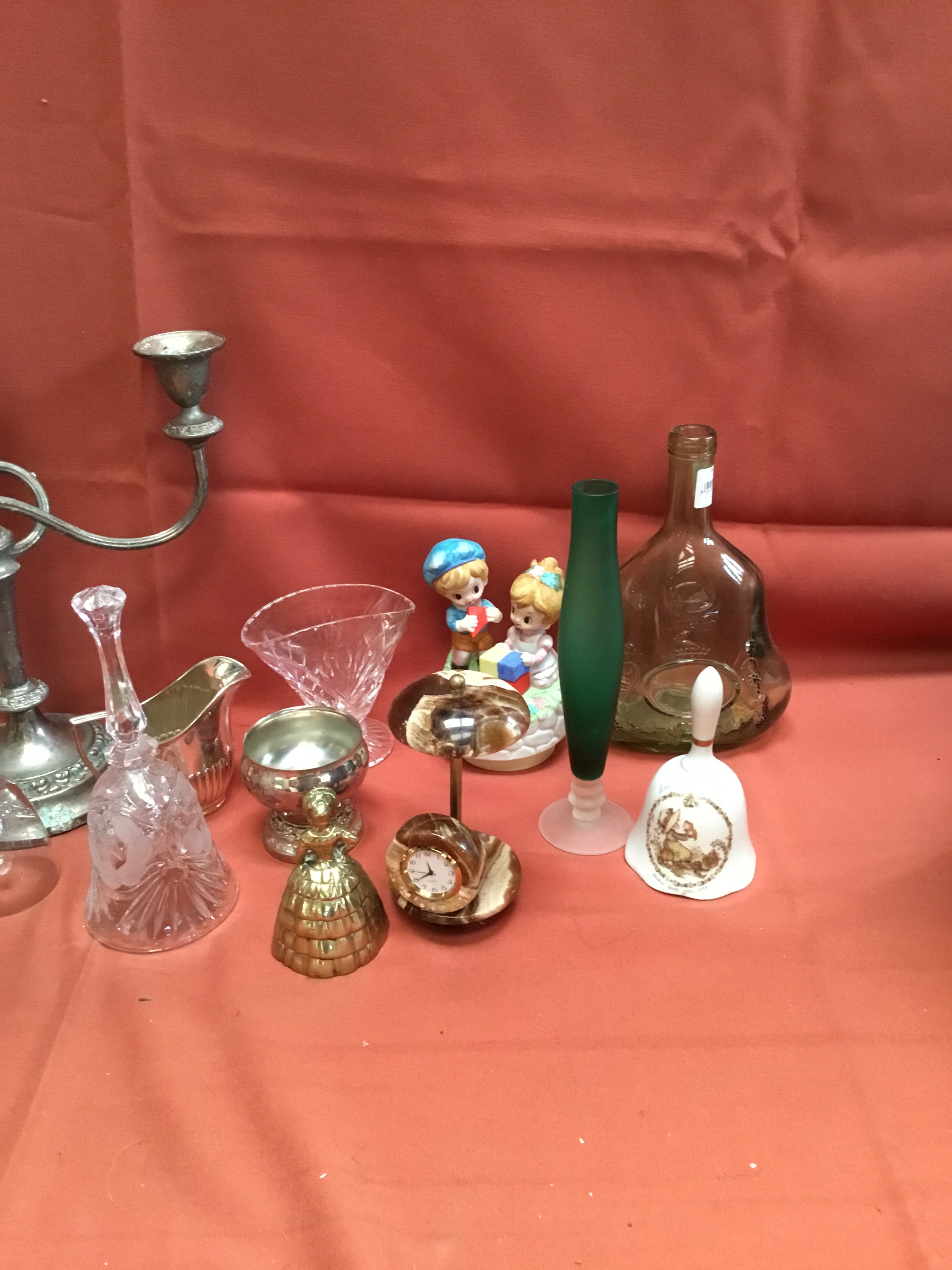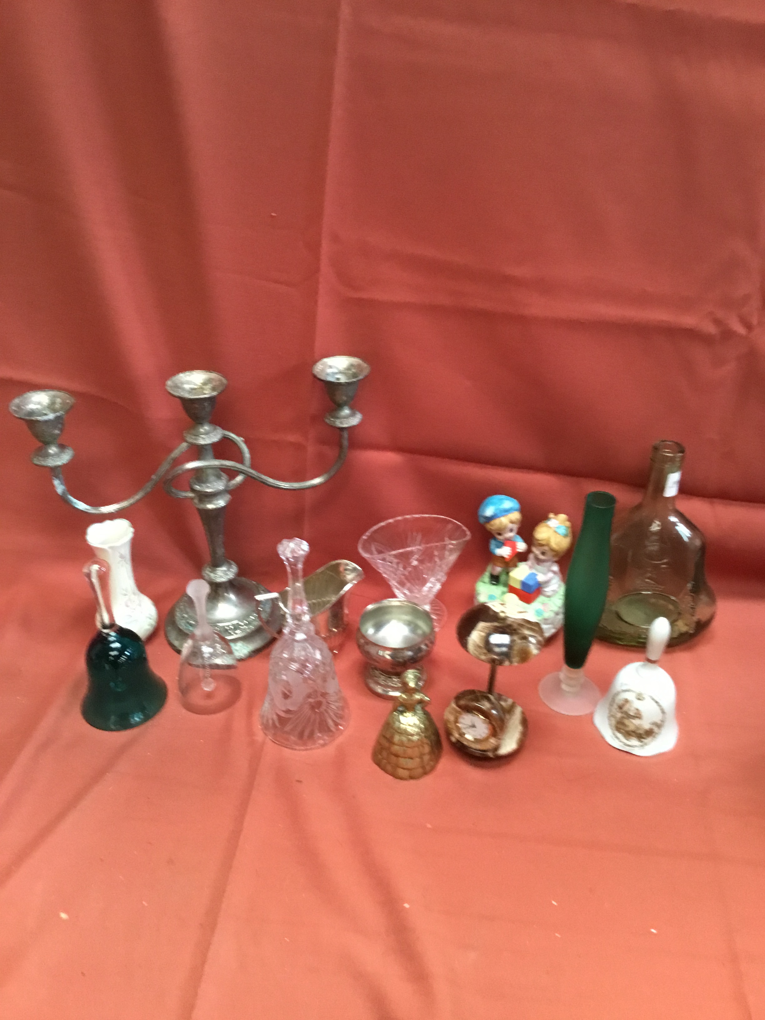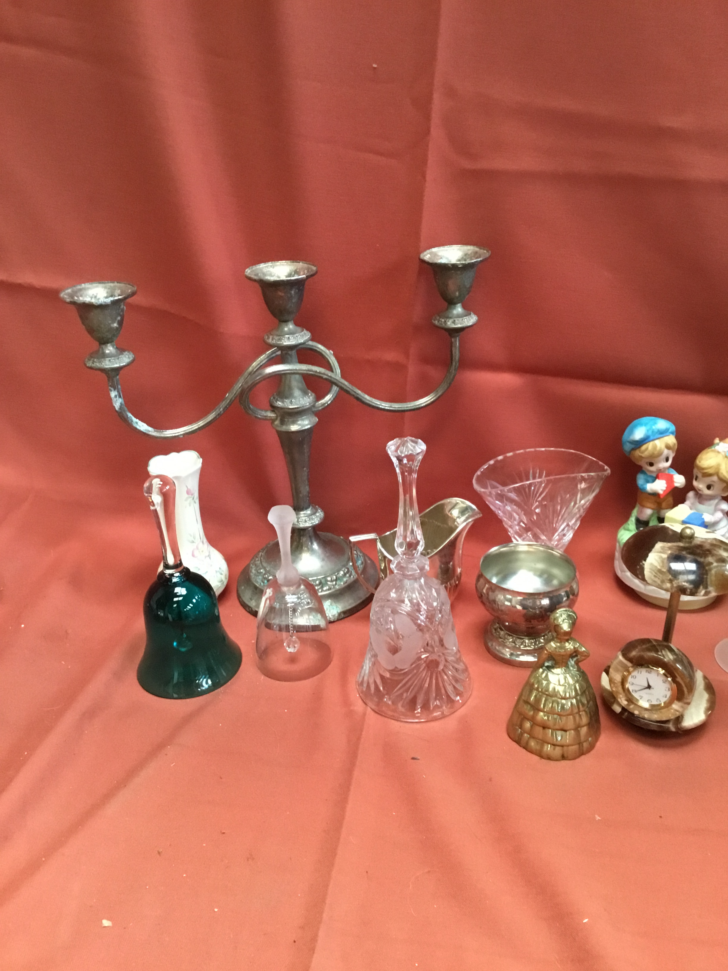 Collectible lot inc candelabra, glass & brass bells & more
