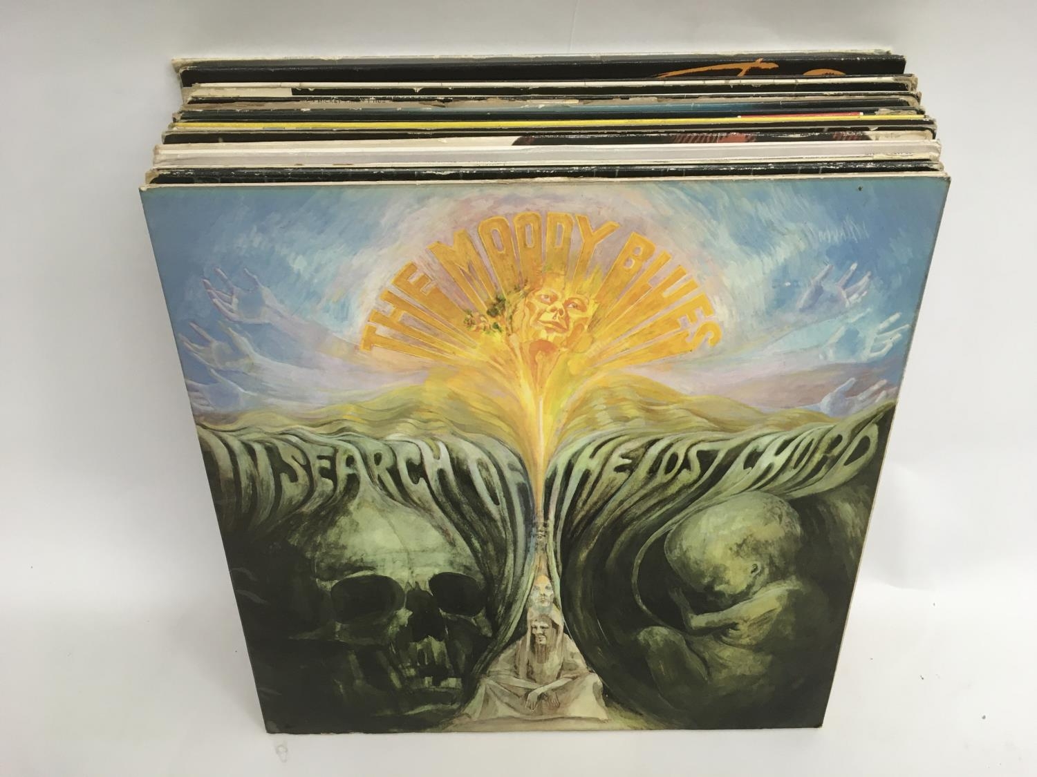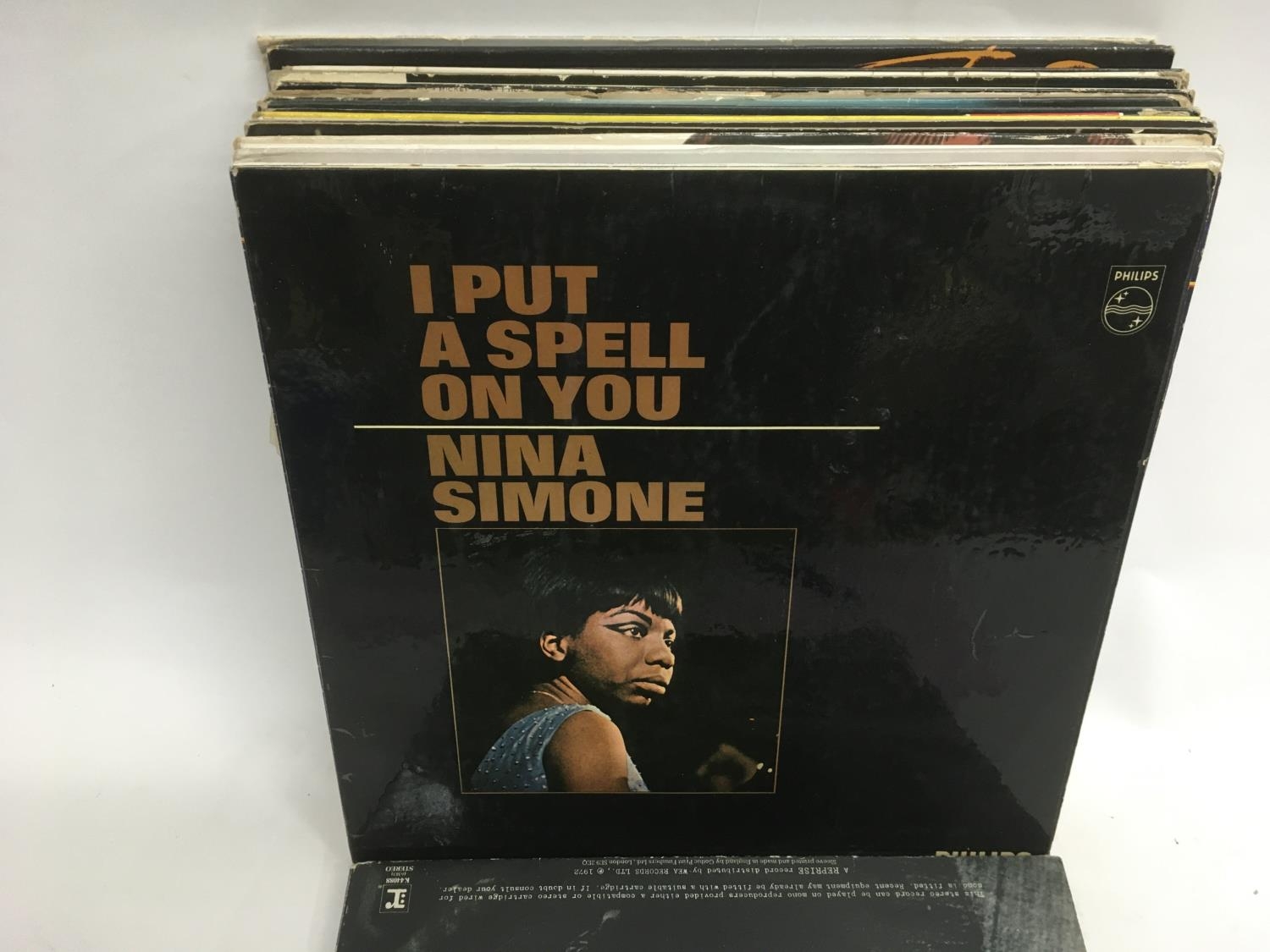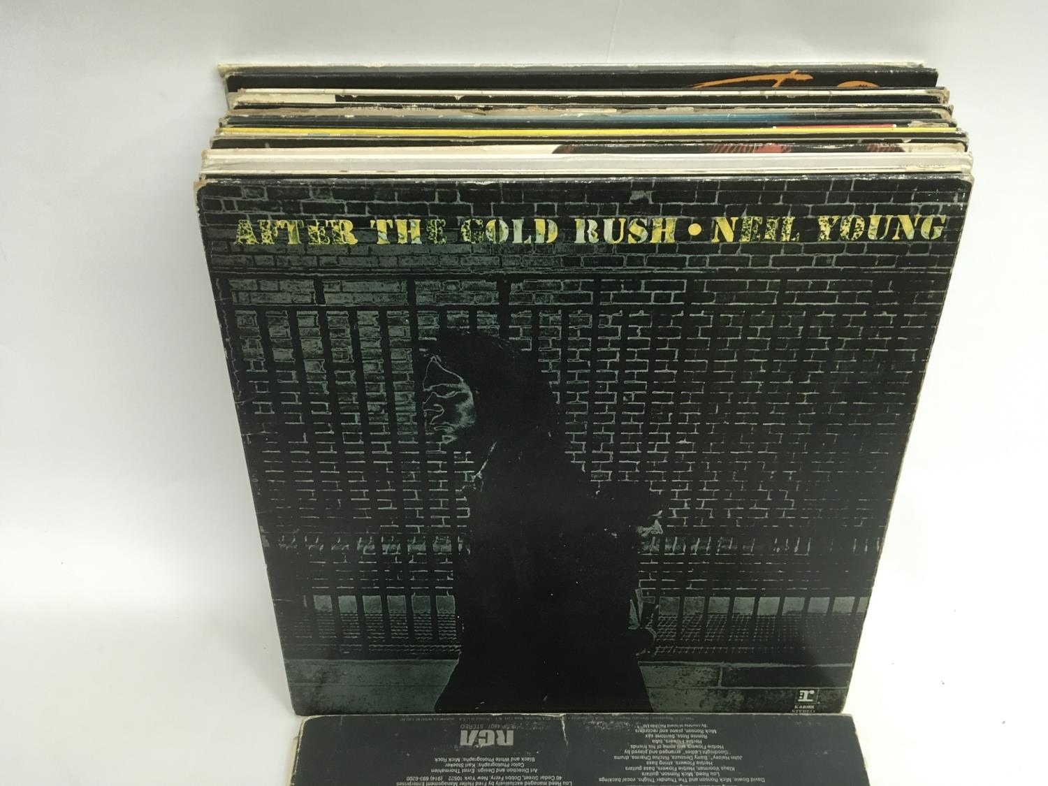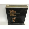A bag containing LPs by various artists including Neil Young, Lou Reed, Nina Simone and others.