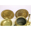 Collection of silver plate and brassware to include: brass jardiniere, three pairs of brass candlesticks, a three piece silver plated tea service and other items (1 box)