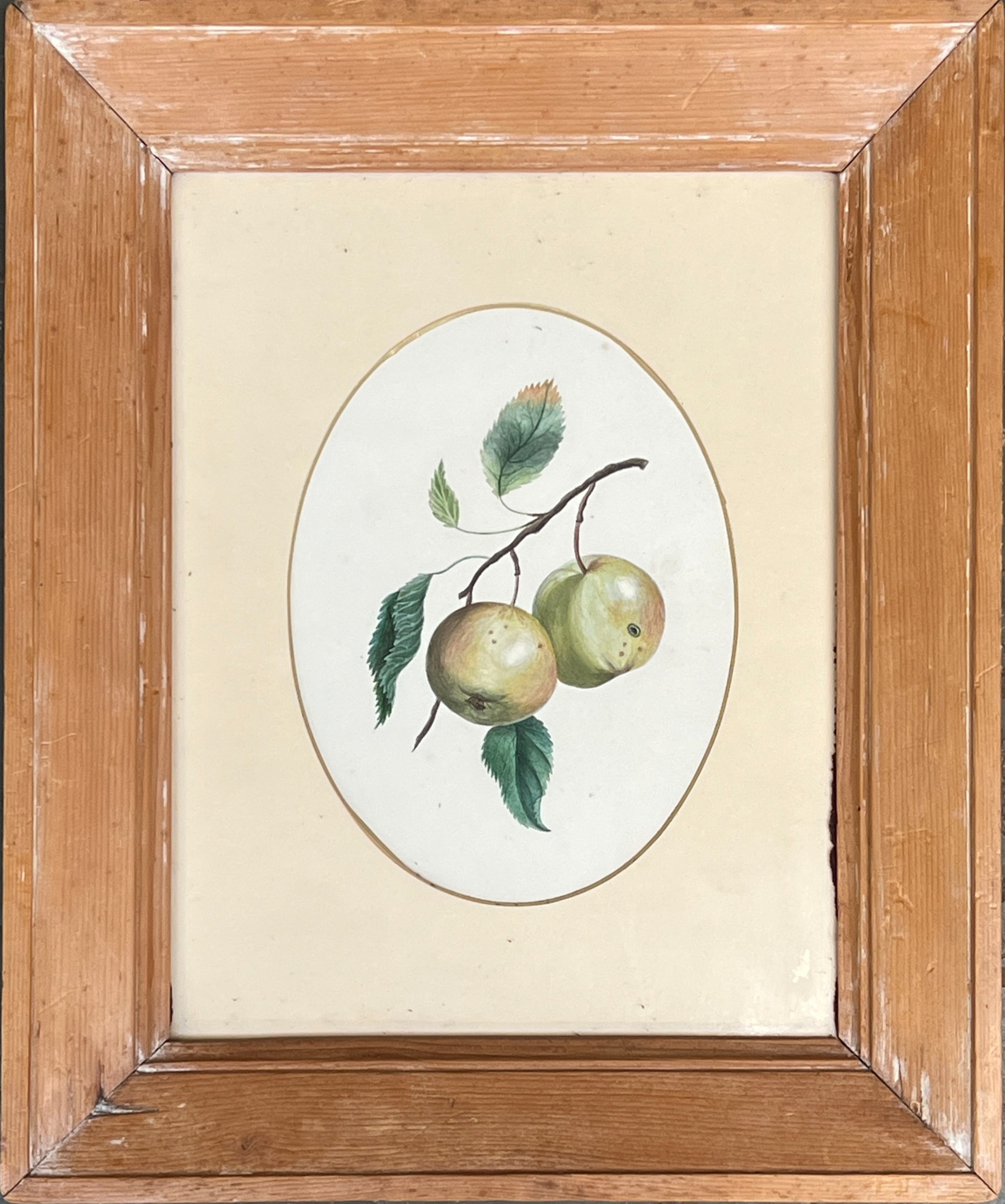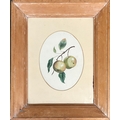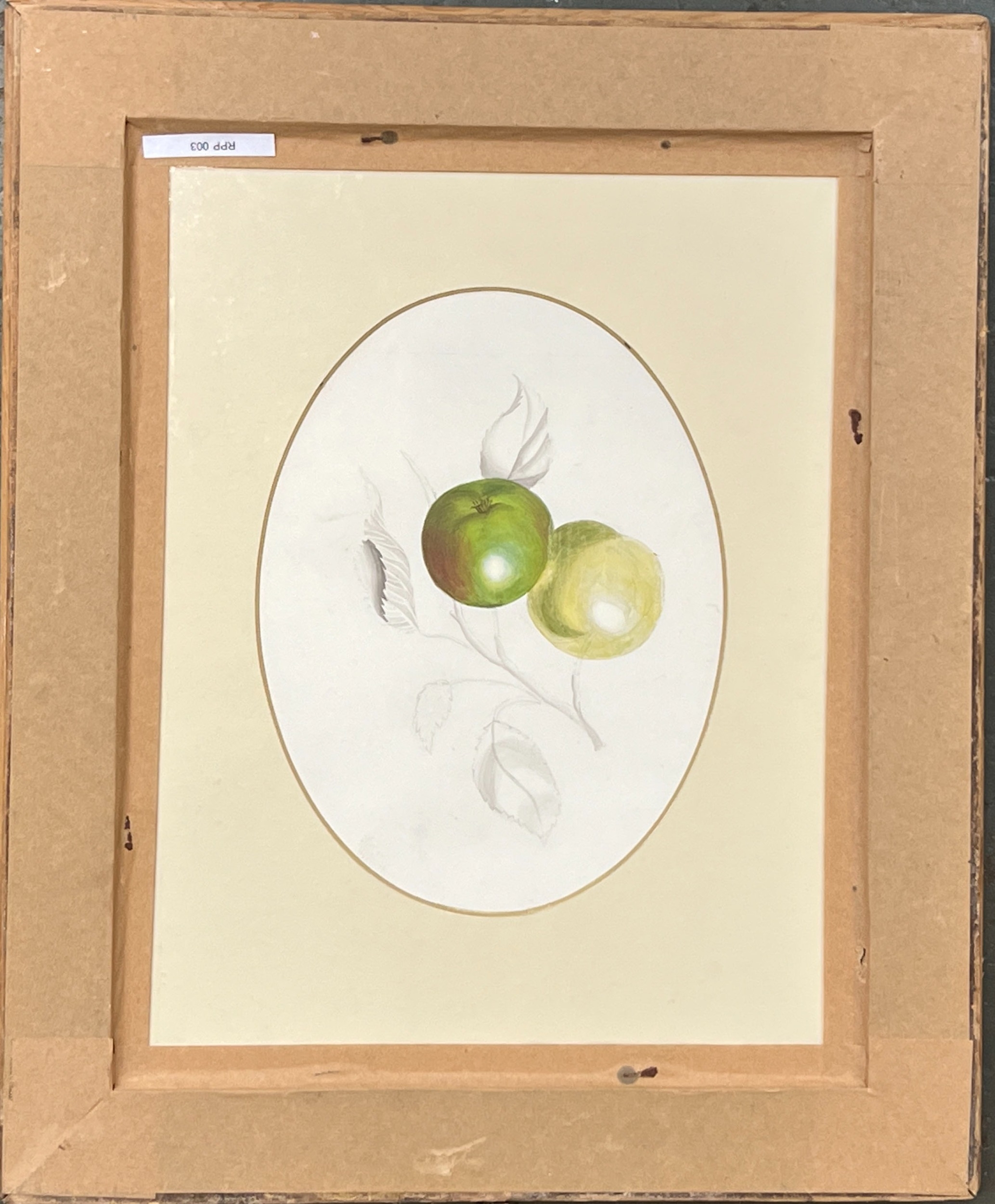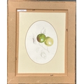 A framed page from a 19th sketchbook, two apple studies, watercolour and pencil, glazed both sides, each approx. 20x15cm within the mount