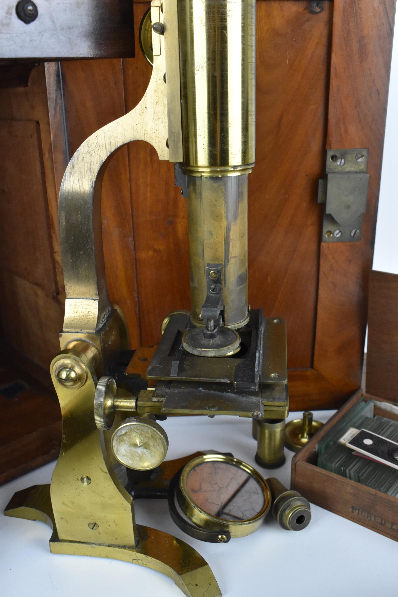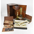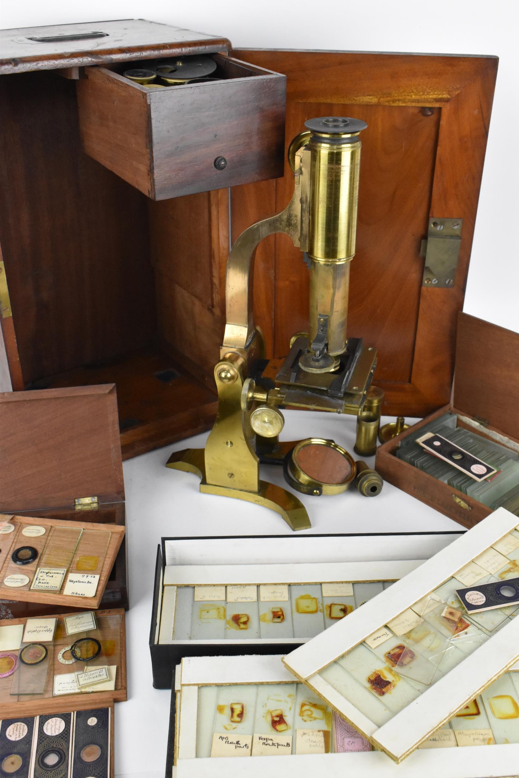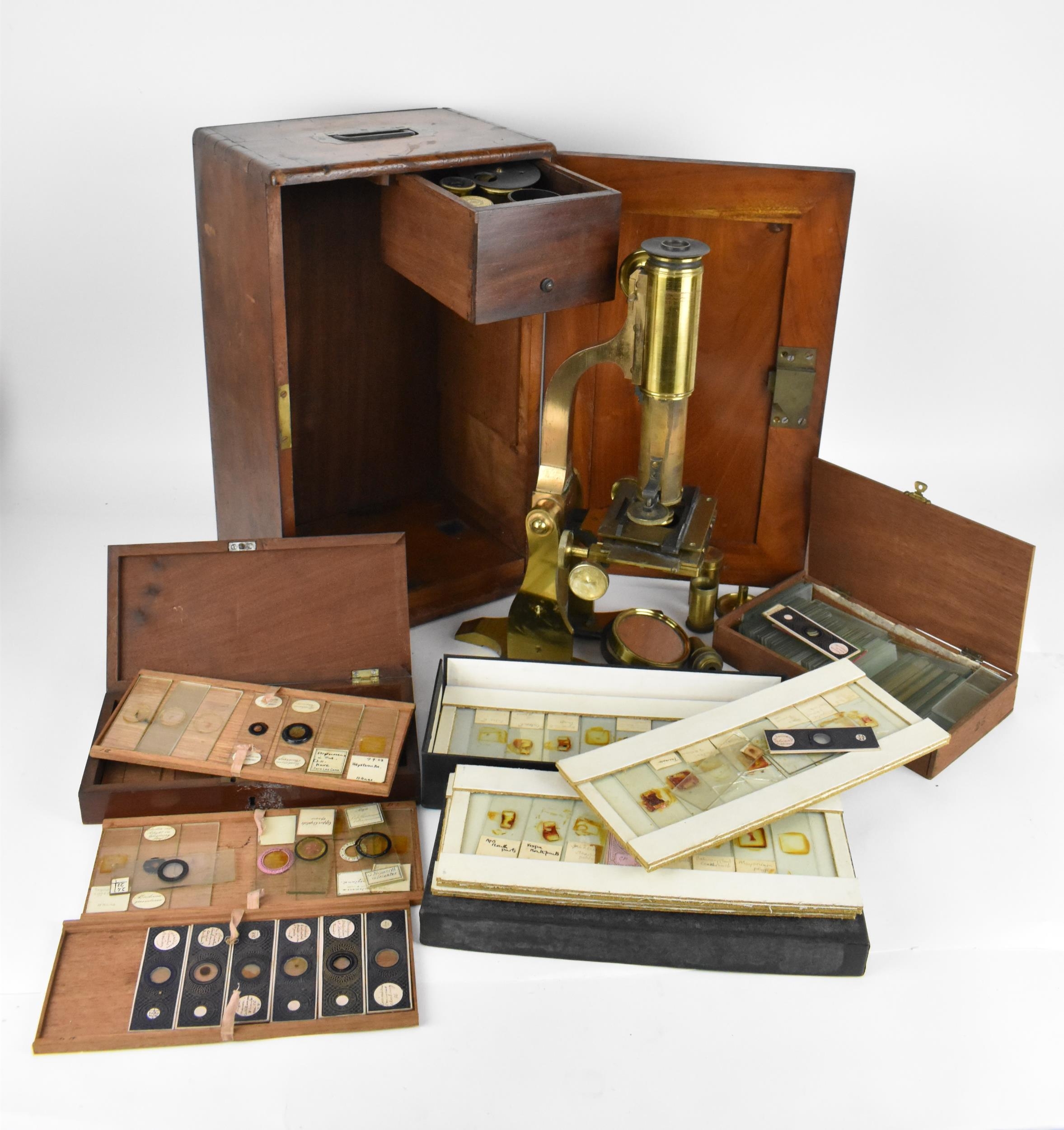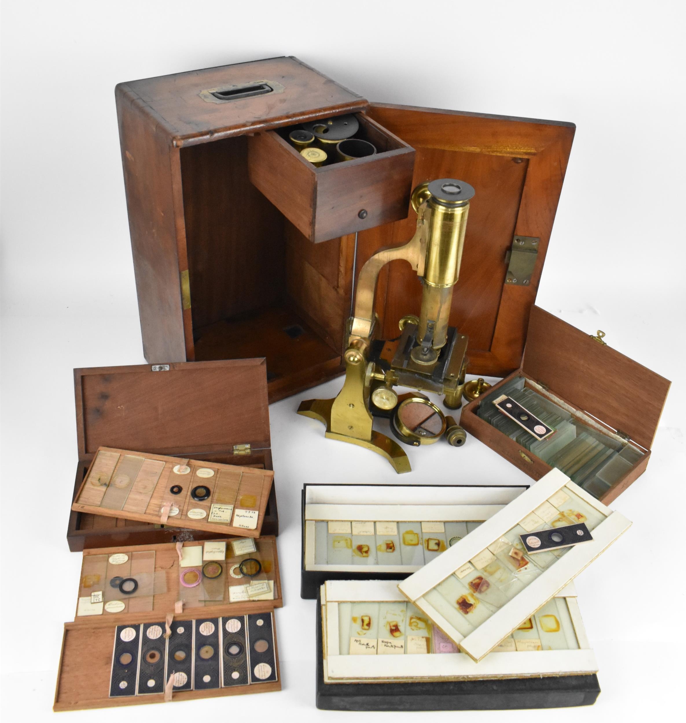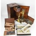 A 19th century brass microscope by Salmon (100 Fenchurch St., London) in a mahogany box with brass flush handle to the top, with additional lens and cased trays of various scientific slides