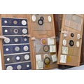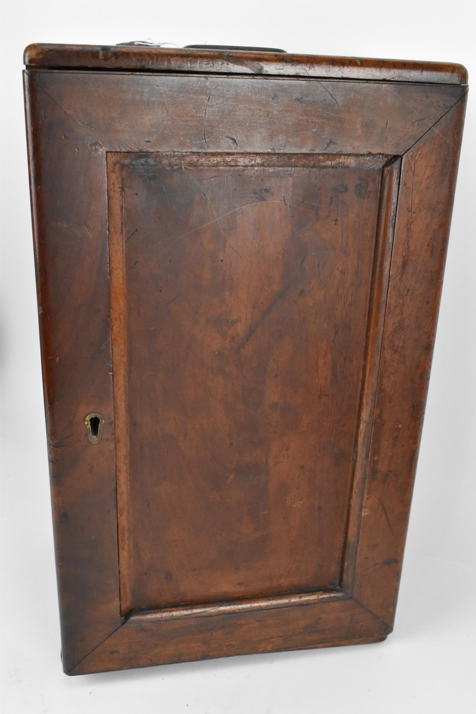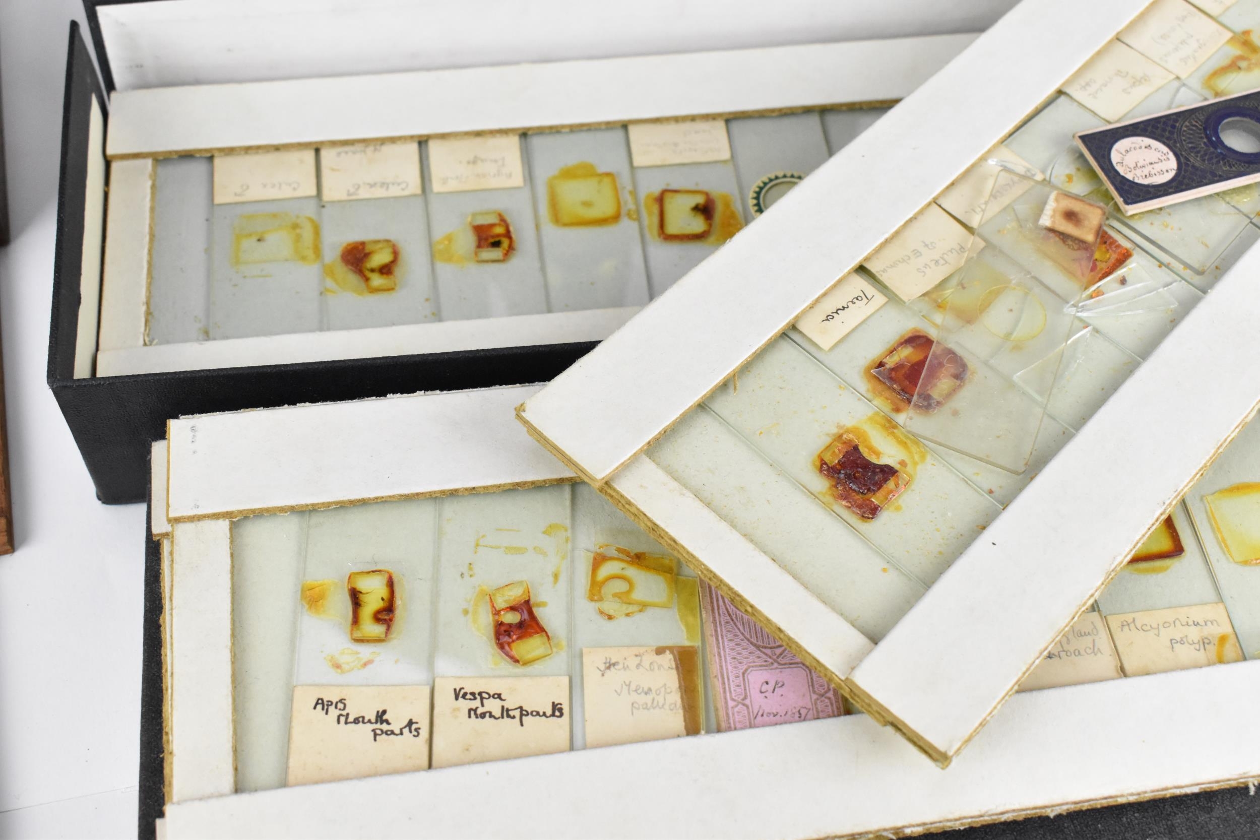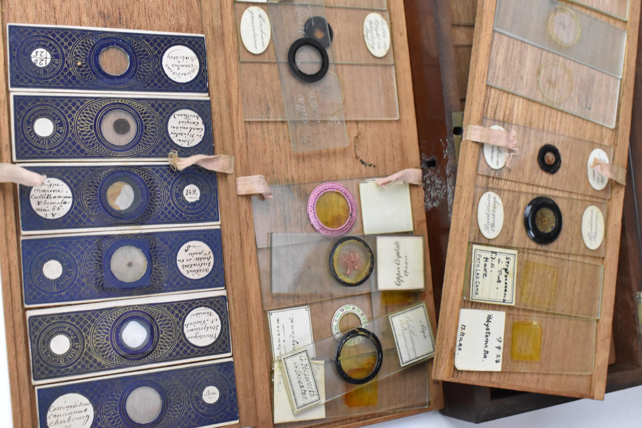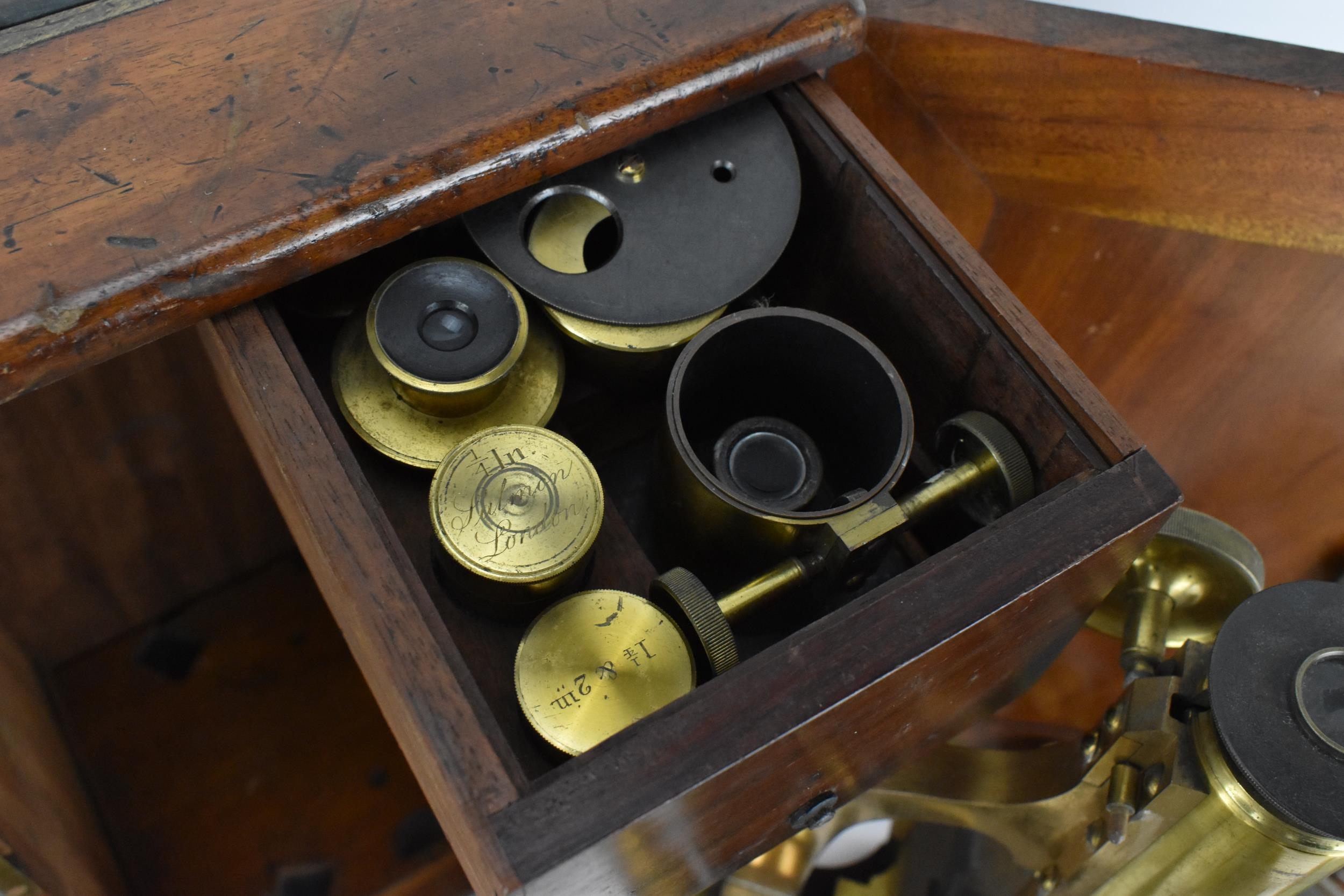 A 19th century brass microscope by Salmon (100 Fenchurch St., London) in a mahogany box with brass flush handle to the top, with additional lens and cased trays of various scientific slides