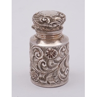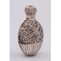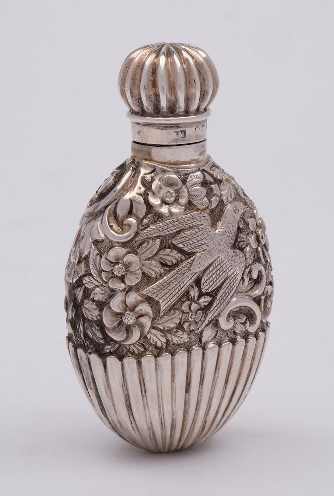A Victorian silver scent bottle, maker Sampson Mordan & Co, London, 1888: of oval outline with embossed love birds amongst flowering shrubs and half-reeded decoration, 9cm. high, 53gms, 1.72ozs.