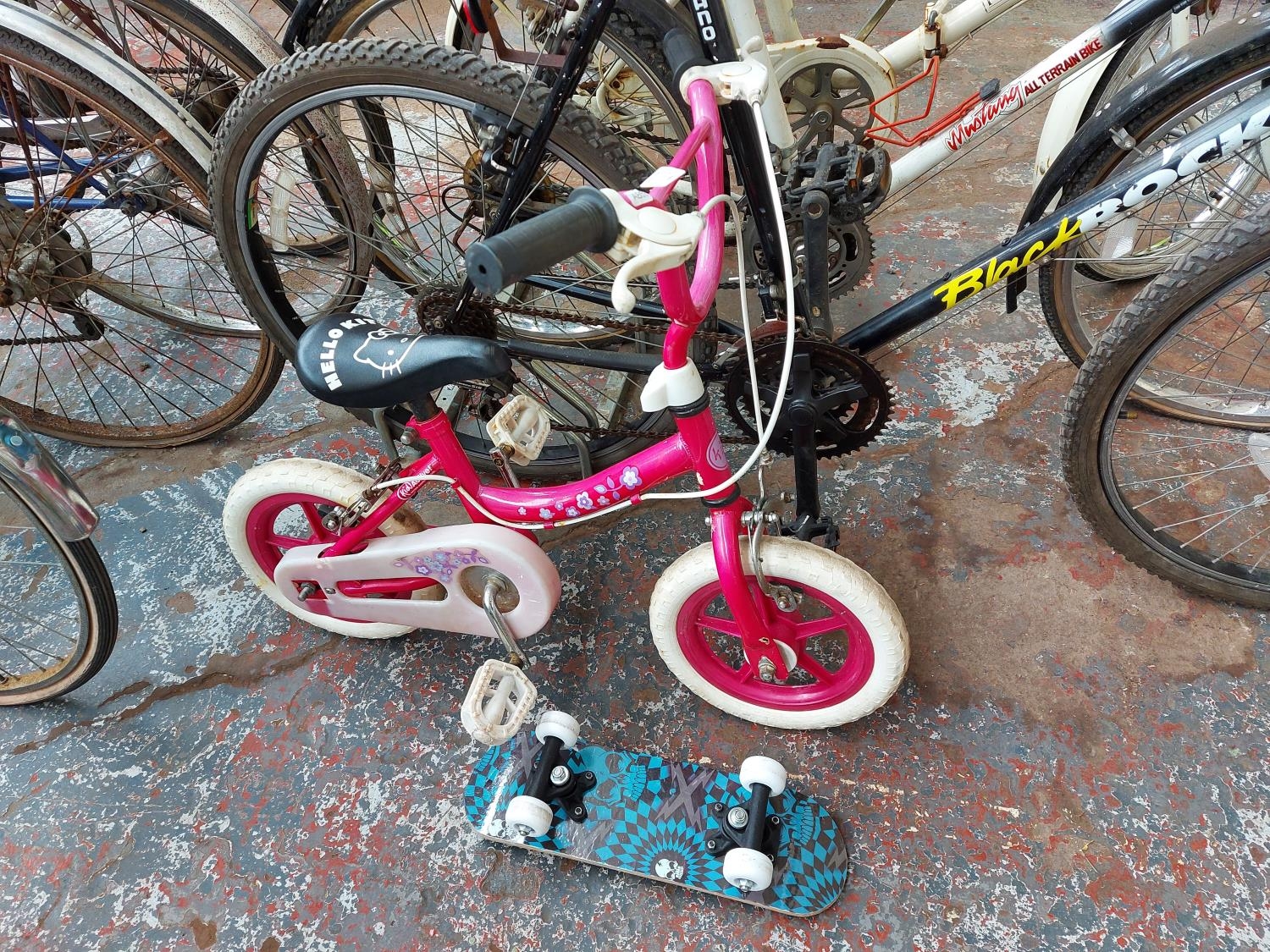 Two items to include a pink Hello Kitty BMX together with a small skateboard with skull design