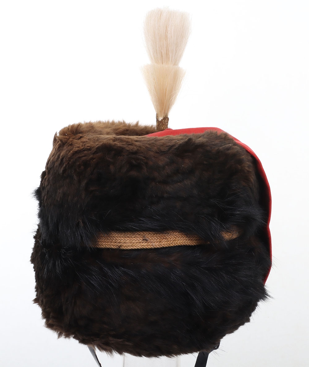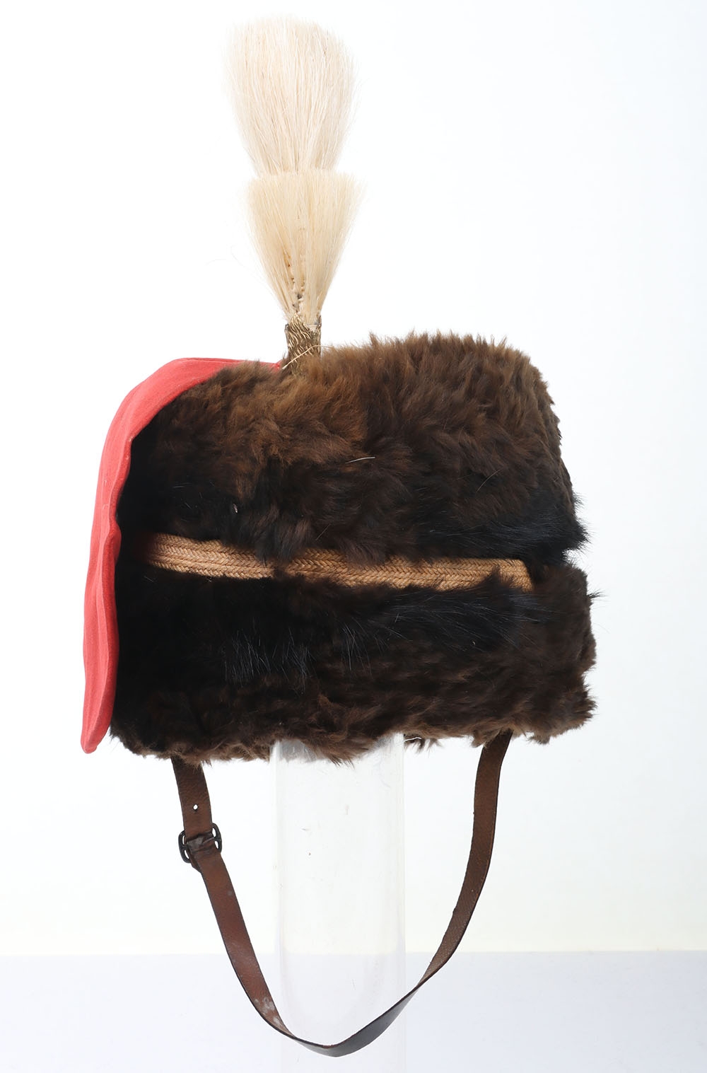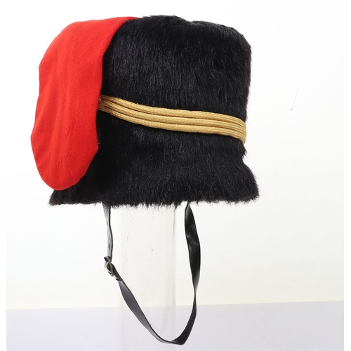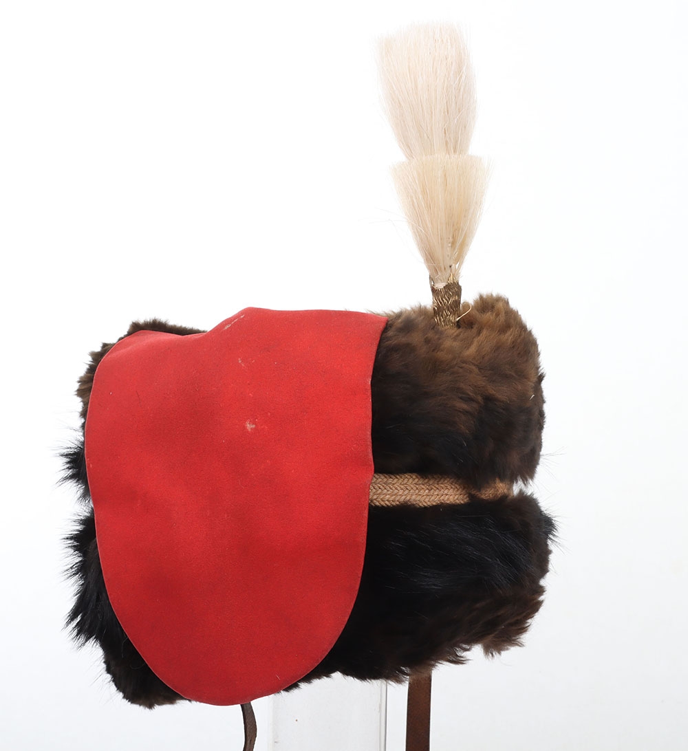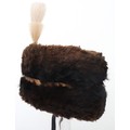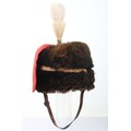 Royal Horse Artillery fur busby with scarlet bag, leather chin strap, yellow cord triple busby lines . In sound condition, but bag damaged and cords faded.