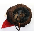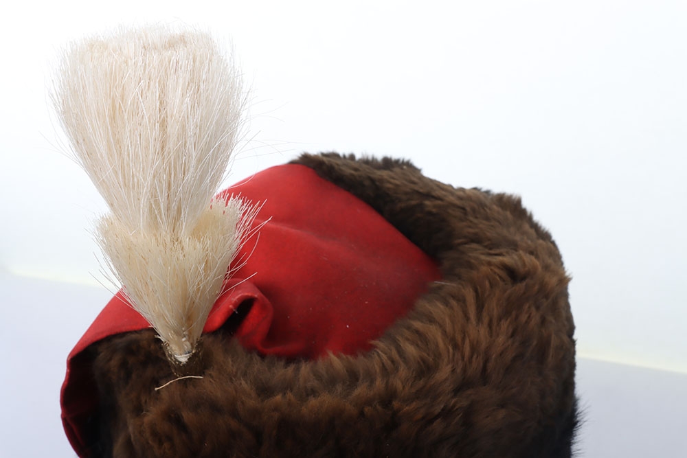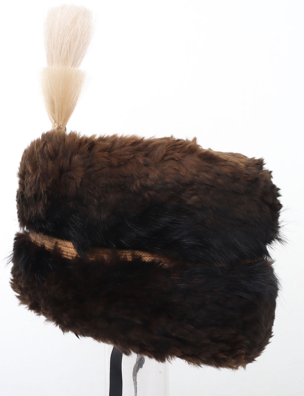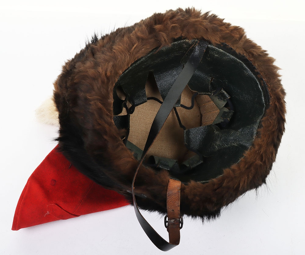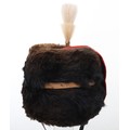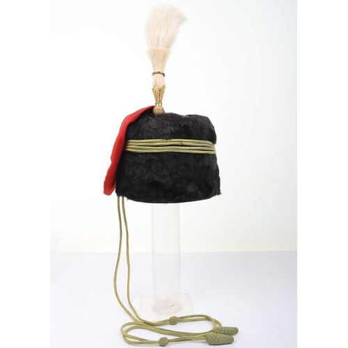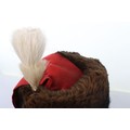 Royal Horse Artillery fur busby with scarlet bag, leather chin strap, yellow cord triple busby lines . In sound condition, but bag damaged and cords faded.