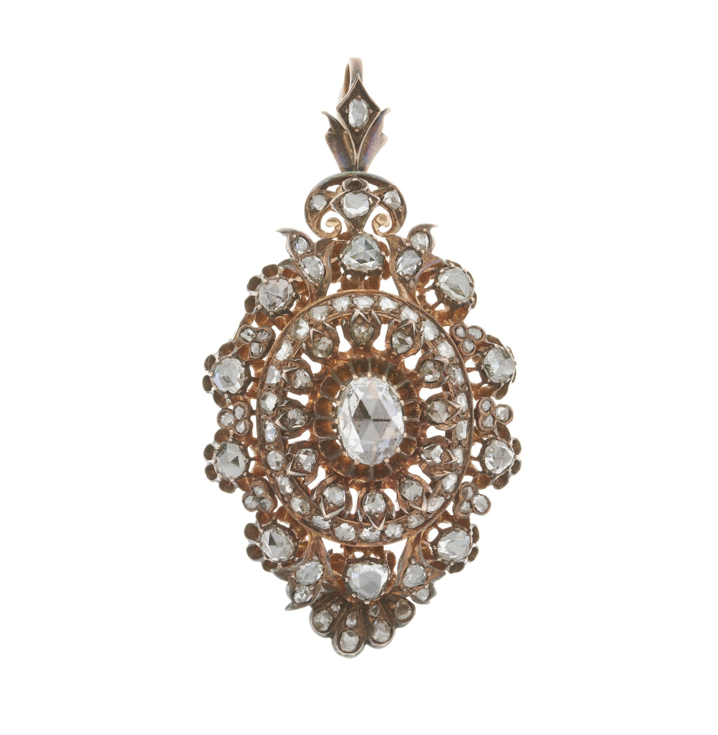 A 19th century silver and gold, rose-cut diamond cluster pendant, principal diamond measures approximately 8.6mm by 6.4mm, length 5.9cm, 18.4g