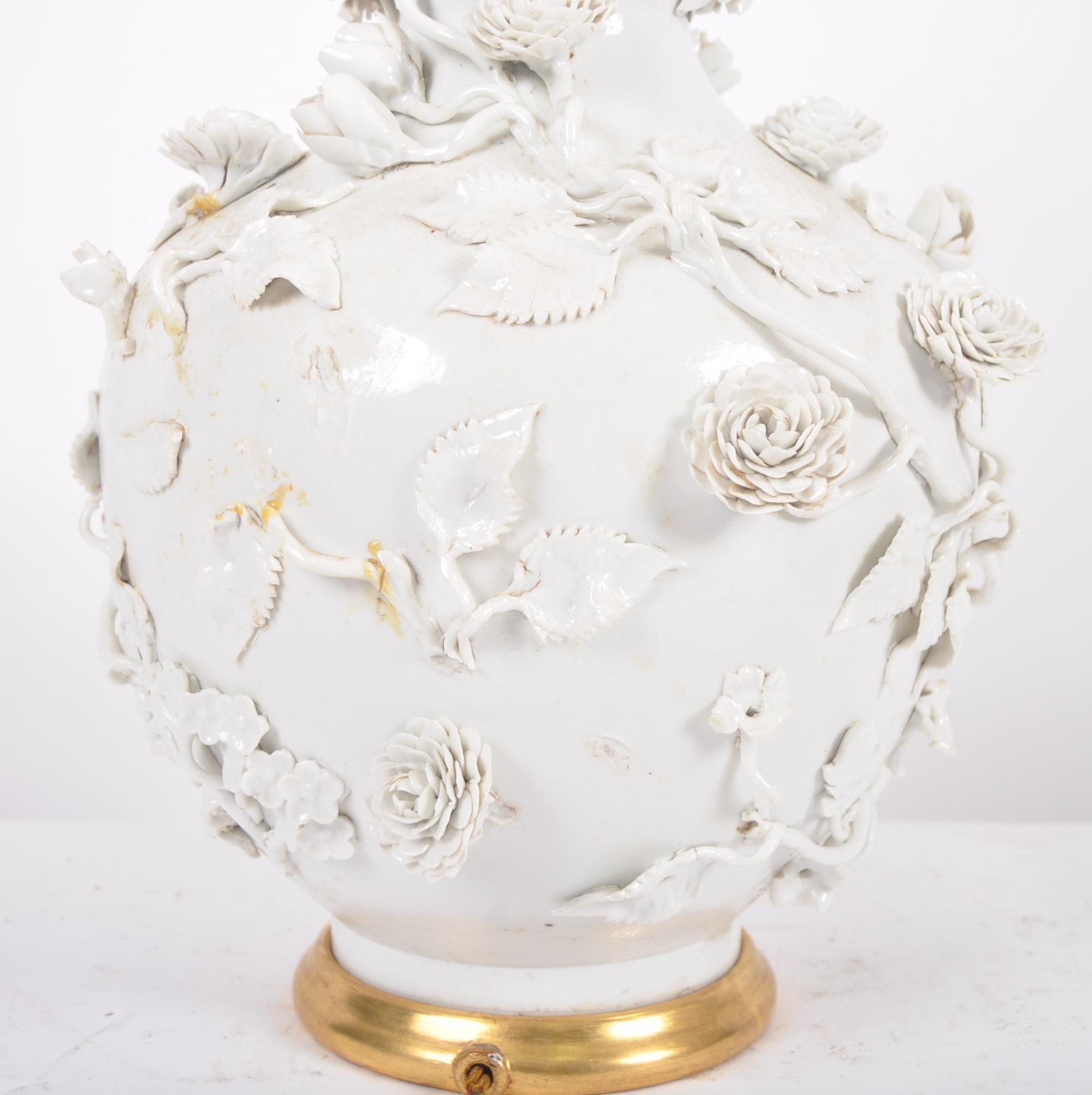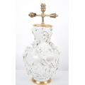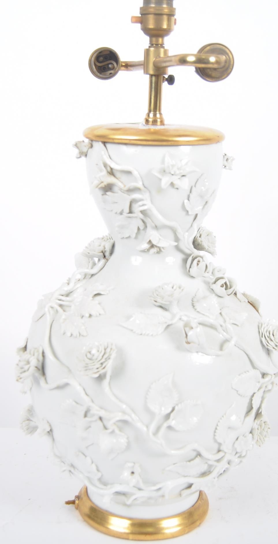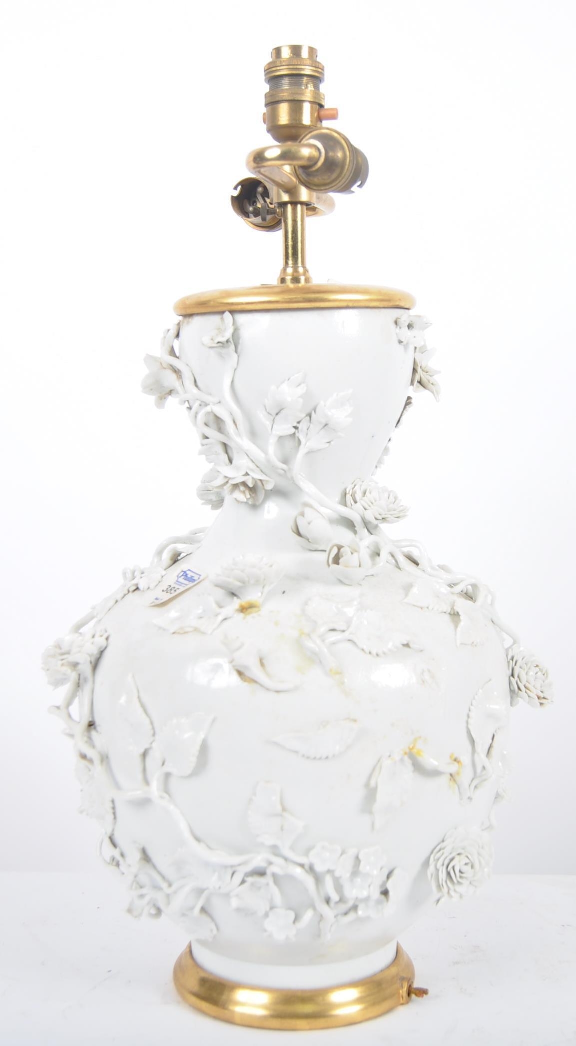 An 18th Century Chinese blanc de chine dehua porcelain vase converted to a lamp in 20th Century France. Large size with the bulbous form bodies decorated with scenes of flowers & leaves in relief. Triple bulb sconce to top. Measures approx; 51cm tall.
