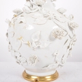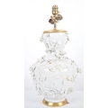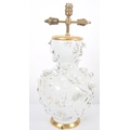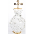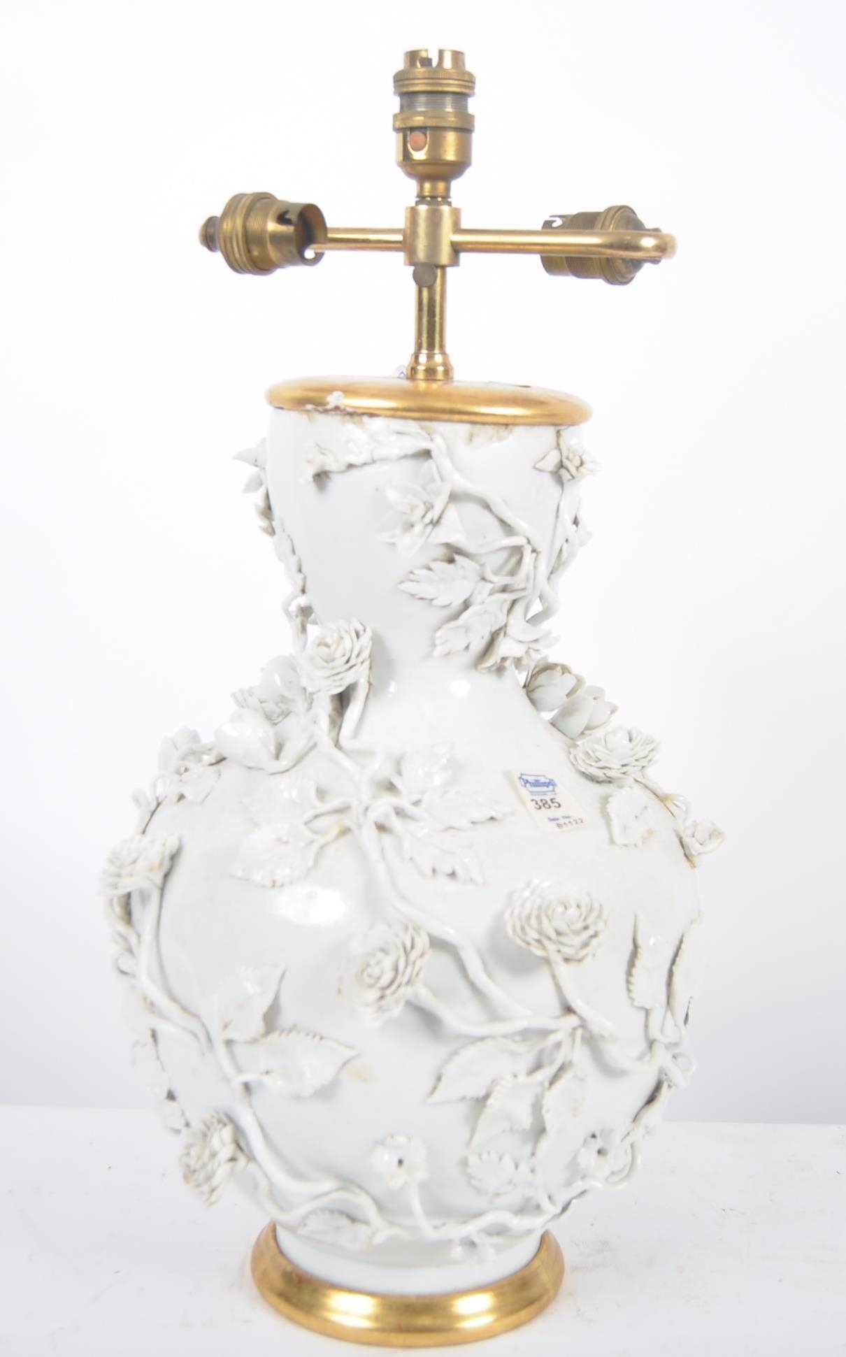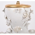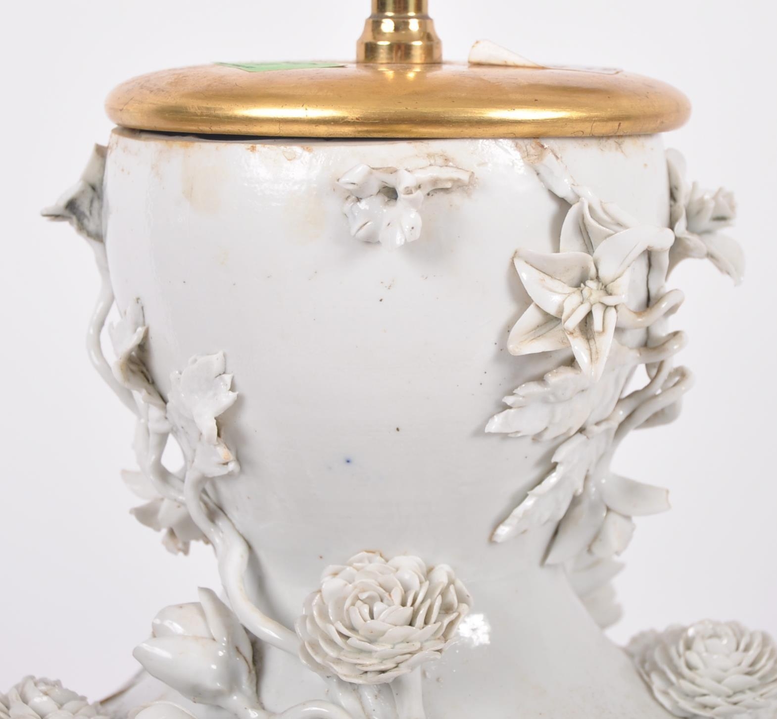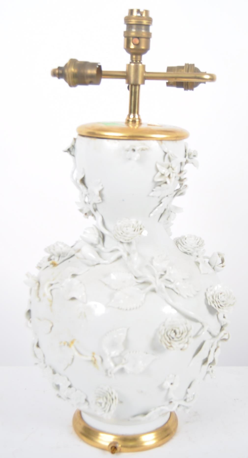 An 18th Century Chinese blanc de chine dehua porcelain vase converted to a lamp in 20th Century France. Large size with the bulbous form bodies decorated with scenes of flowers & leaves in relief. Triple bulb sconce to top. Measures approx; 51cm tall.