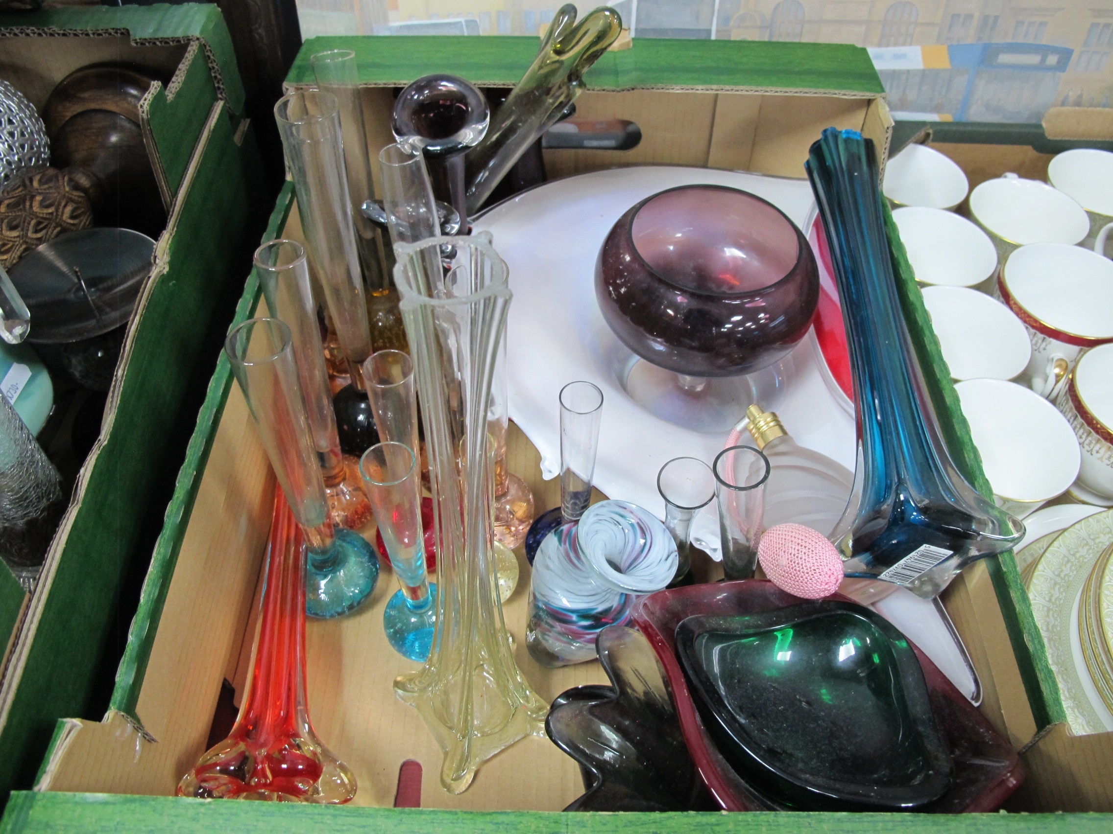 Glassware to include a large collection of bud vases with weighted bases of varying size and colours, large shell shaped dish, 45cm w etc. 1 Box.