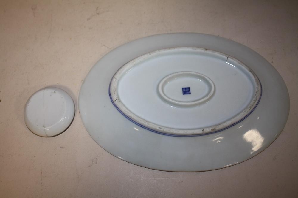 AN ORIENTAL BLUE AND WHITE OVAL DISH TOGETHER WITH A SILVER HANDPAINTED BLUE AND WHITE MINIATURE BOWL A/F