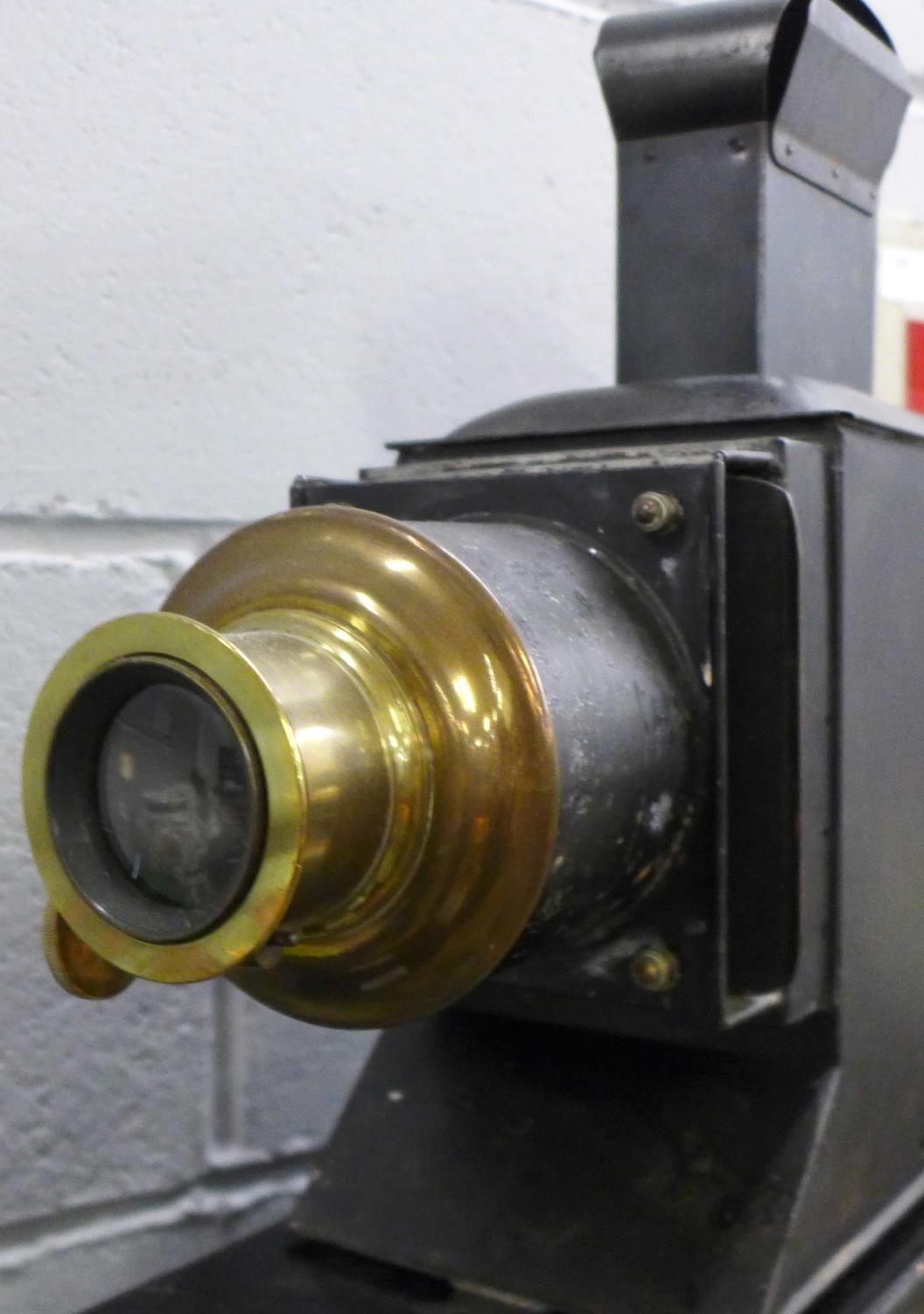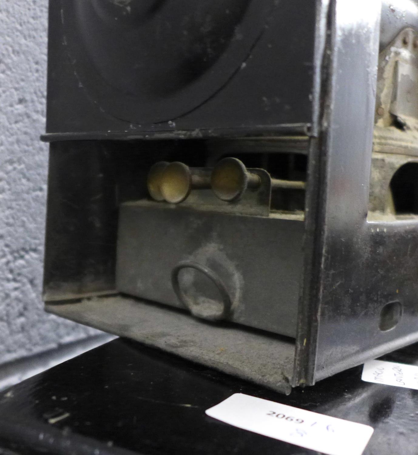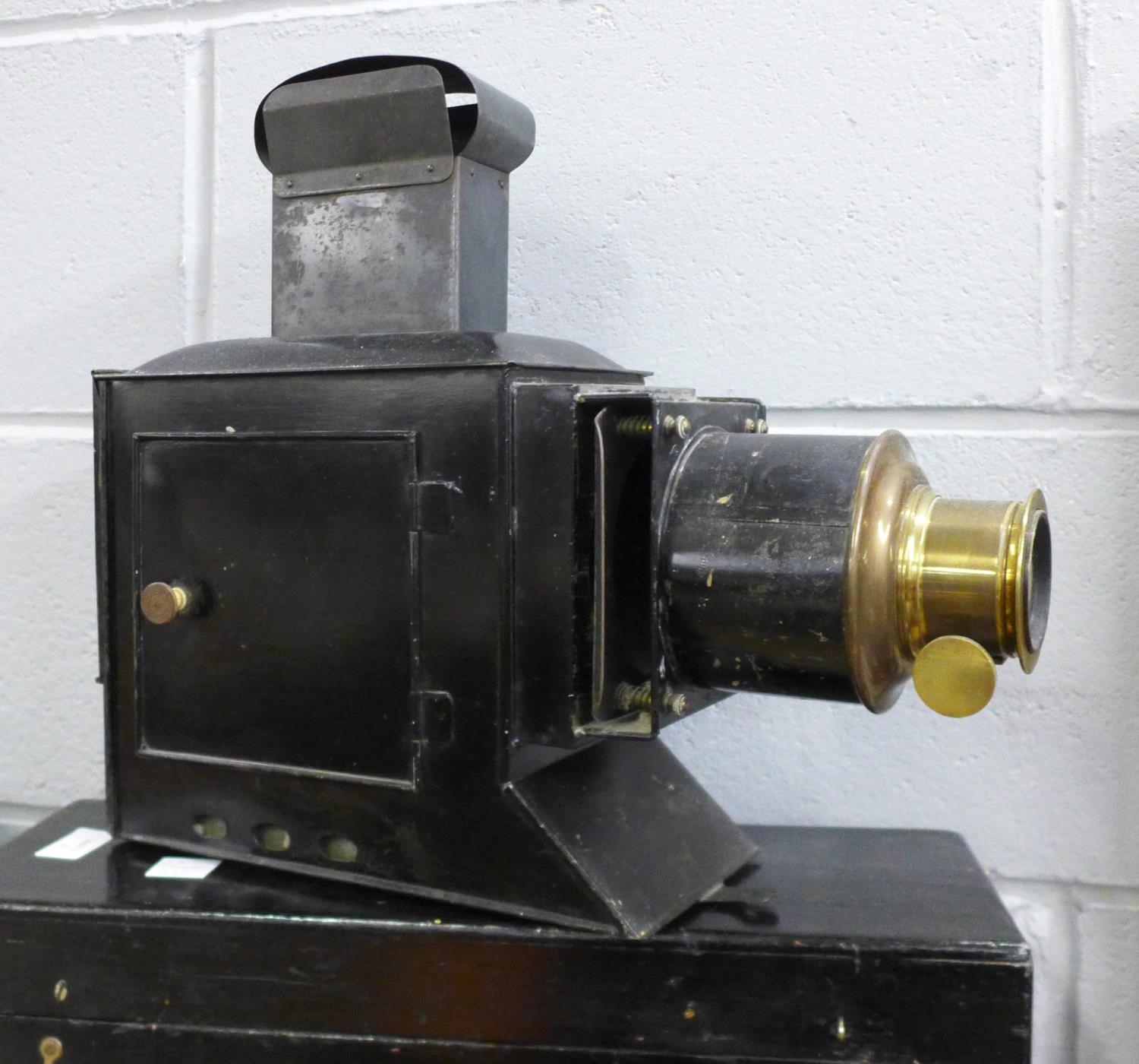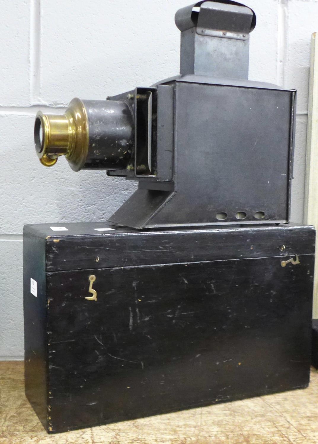 A circa 1895 magic lantern with wooden box, lacking condensing lens