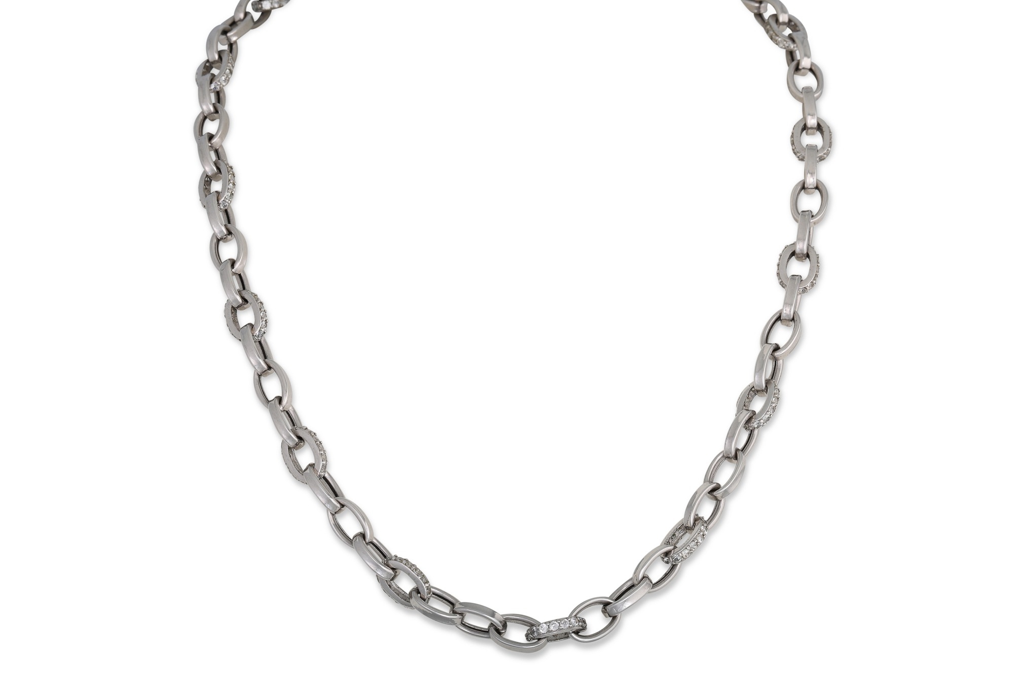 A 9CT WHITE GOLD STONE SET NECKLACE, 16.8 g. gross weight