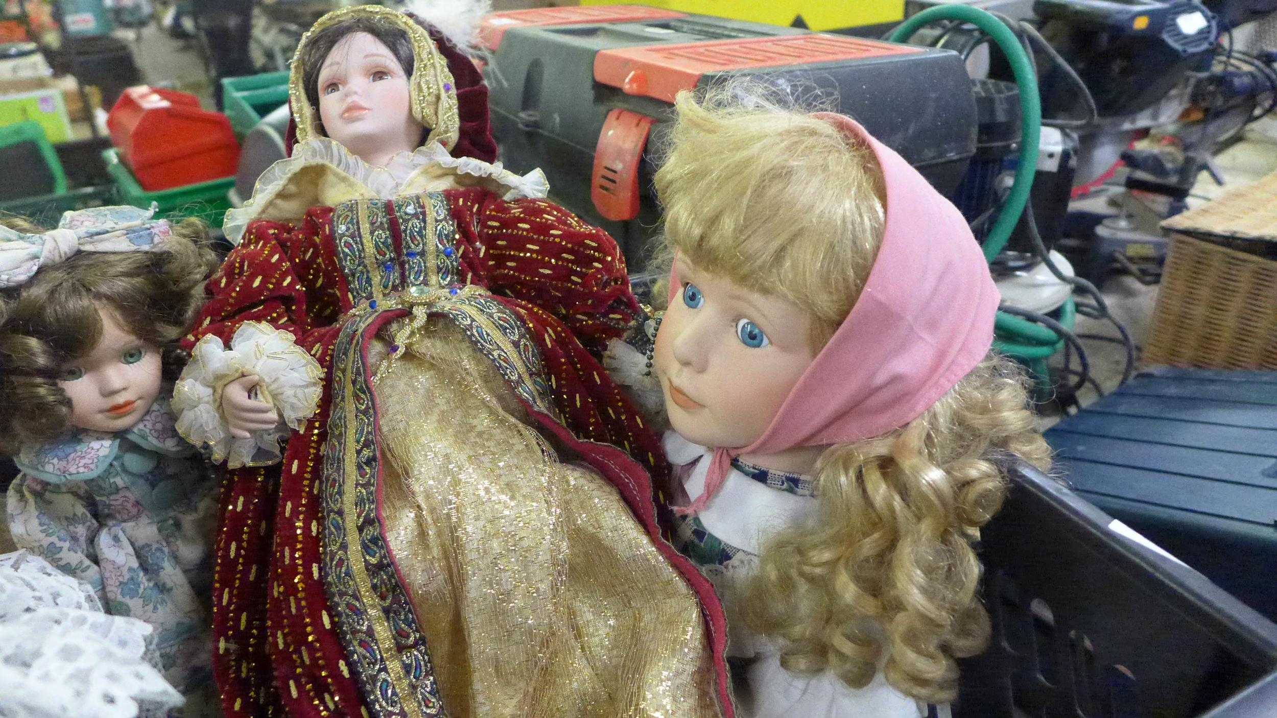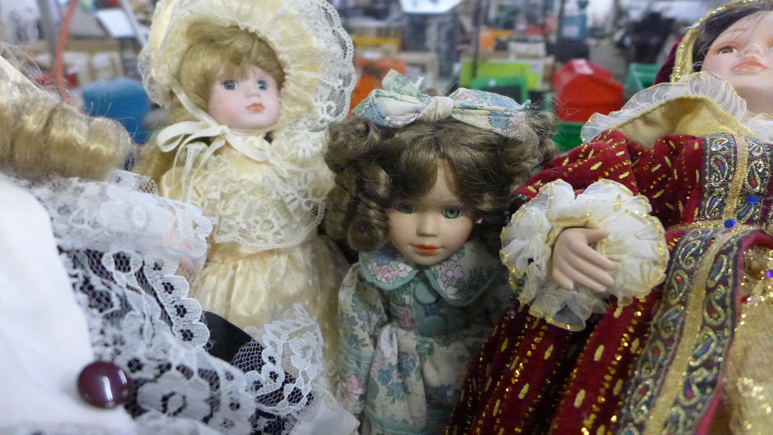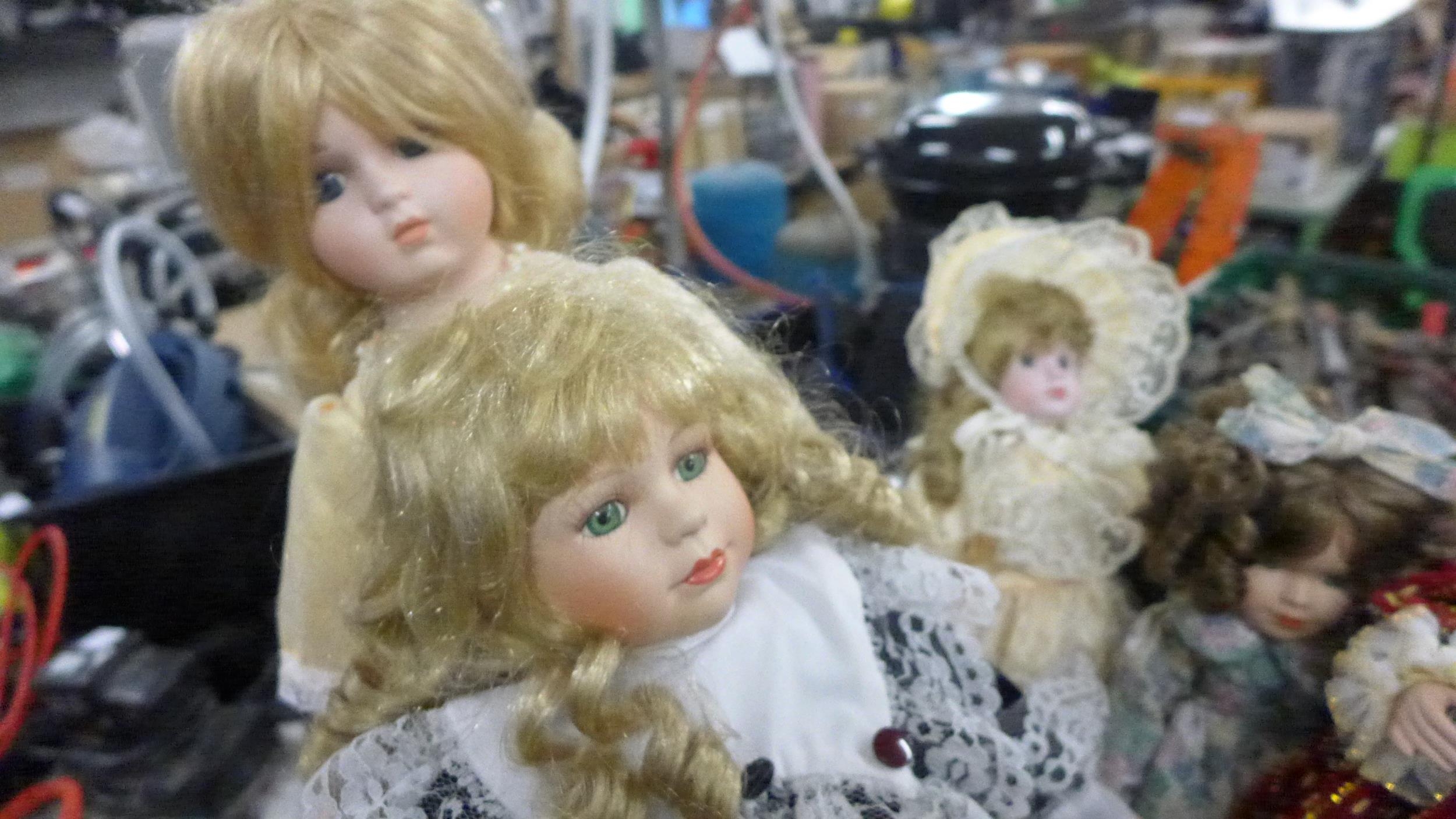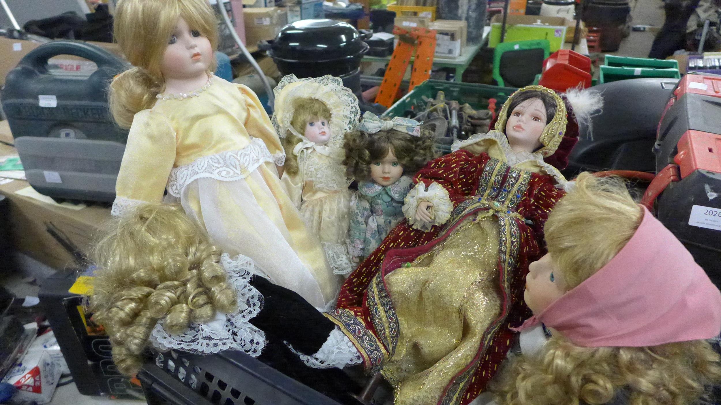 Box of 7 porcelain head dolls in good condition